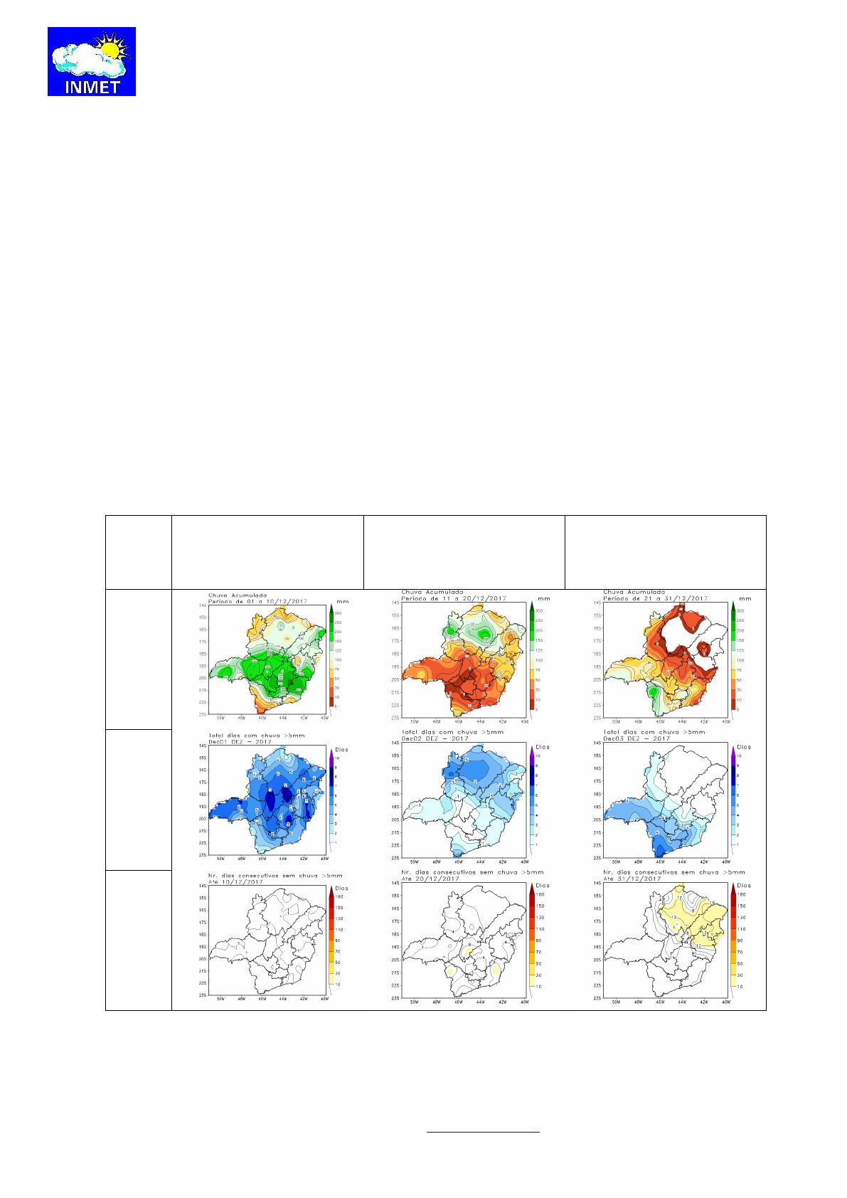 INSTITUTO NACIONAL DE METEOROLOGIA – INMET 5º DISTRITO DE METEOROLOGIA / MINAS GERAIS / BELO HORIZONTE SEÇÃO DE ANÁLISE E PREVISÃO DO TEMPO – SEPRE Instituto Nacional de Meteorologia – INMET 5º Distrito de Meteorologia – 5º Disme Av. do Contorno, 8159 – Belo Horizonte / MG (31) 32911494/95 sepre.mg@inmet.gov.br http://www.inmet.gov.br BOLETIM MENSAL PARA MG DIAGNÓSTICO CLIMÁTICO DE MINAS GERAIS: Dezembro/2017 A configuração de um episódio da Zona de Convergência do Atlântico Sul (ZCAS) no início de dezembro fez com que o primeiro decêndio fosse de chuvas fortes e frequentes em quase todas as regiões mineiras. No segundo decendio, o posicionamento da ZCAS entre o Centro- Sul da Bahia e o Norte de Minas manteve grande volume de chuva principalmente no Noroeste e Norte mineiro. No final do mês, as chuvas se restringiram praticamente ao Oeste e Sul, estabelecendo veranico no Centro-Norte e Leste do Estado. Lembrando que veranico corresponde ao número de dias consecutivos sem chuva durante o período chuvoso. Neste monitoramento, especificamente, considera-se “dia seco” aquele que tem total acumulado de chuva inferior a 5 mm, e, “dia chuvoso” o que tem total diário igual ou superior a 5 mm. A Figura 1 ilustra os totais decendiais de chuva, o número total de “dias chuvosos” e o número de “dias secos” consecutivos no final do decêndio. D e ze m b ro 2 0 1 7 1° Decendio 2° Decendio 3° Decendio P re ci p it aç ã o ac u m u la d a N ú m e ro t o ta l d e d ia s ch u vo so s N ú n m e ro d e d ia s se co s co n se cu ti vo s Figura 1: Precipitação acumulada, número total de dias com acumulado de chuva maior ou igual a 5 mm (dias chuvosos) e número de dias consecutivos com registro de chuva inferior a 5 mm (dias secos) no final de cada decêndio de dezembro/2017. mailto:sepre.mg@inmet.gov.br INSTITUTO NACIONAL DE METEOROLOGIA – INMET 5º DISTRITO DE METEOROLOGIA / MINAS GERAIS / BELO HORIZONTE SEÇÃO DE ANÁLISE E PREVISÃO DO TEMPO – SEPRE Instituto Nacional de Meteorologia – INMET 5º Distrito de Meteorologia – 5º Disme Av. do Contorno, 8159 – Belo Horizonte / MG (31) 32911494/95 sepre.mg@inmet.gov.br http://www.inmet.gov.br O total mensal de precipitação ultrapassou 350 mm no Triângulo Mineiro e Zona da Mata, situando-se entre 200 e 300 mm na maior parte do Estado, Figura 2(a). Contudo, Guanhães e Juiz de Fora tiveram volume mensal inferior a 100 mm. Em relação à climatologia, prevaleceram valores próximos à média, com anomalias de 50 mm acima ou abaixo da média, na maioria das regiões mineiras. Por outro lado, déficit de precipitacção da ordem de 100 mm foi observado em pontos isolados do Triângulo Mineiro, Rio Doce e em áreas do Sul e Zona da Mata, como mostra o mapa da Figura 2 (b). Precipitação total acumulada Dezembro/2017 Anomalia de precipitação Dezembro/2017 (a) (b) Figura 2: Total acumulado (a) e anomalia (b) de precipitação para dezembro de 2017. TEMPERATURAS: A temperatura máxima variou em média entre 24°C e 32°C, situando-se acima da média no Centro-Sul, Oeste e em áreas do Norte, Jequitinhonha e Rio Doce. Nas demais regiões mineiras, os valores estiveram próximos à média histórica, Figura 3 (a e c). A temperatura mínima superou a média na faixa Leste, em áreas do Centro-Sul, Oeste, Noroeste e Norte, com valores médios mensais entre 12ºC e 22ºC, como ilustram os mapas da Figura 3 (b e d). TMAX e Anomalia de TMAX Dezembro/2017 TMIN e Anomalia de TMIN Dezembro/2017 (a) (b) mailto:sepre.mg@inmet.gov.br INSTITUTO NACIONAL DE METEOROLOGIA – INMET 5º DISTRITO DE METEOROLOGIA / MINAS GERAIS / BELO HORIZONTE SEÇÃO DE ANÁLISE E PREVISÃO DO TEMPO – SEPRE Instituto Nacional de Meteorologia – INMET 5º Distrito de Meteorologia – 5º Disme Av. do Contorno, 8159 – Belo Horizonte / MG (31) 32911494/95 sepre.mg@inmet.gov.br http://www.inmet.gov.br (c) (d) Figura 3: Média e Anomalia mensal de temperatura máxima (a e c) e mínima (b e d) em Dezembro/2017. Comportamento das chuvas no trimestre outubro, novembro e dezembro, primeira metade da estação chuvosa 2017/2018: A Figura 4 mostra o aumento dos totais mensais no decorrer do trimestre, comportamento condizente com o esperado para a época do ano. Os mapas com as anomalias, sinalizam que o volume de chuva esteve próximo à média climatológica na maior parte do Estado, nos três meses analizados. Além disto, o aumento do número total de dias chuvosos de um mês para outro também sinaliza que a primeira metade deste período chuvoso esteve dentro da normalidade em Minas Gerais. Outubro/2017 Novembro/2017 Dezembro/2017 P re ci p it aç ã o ac u m u la d a A n o m al ia d e p re ci p it a çã o mailto:sepre.mg@inmet.gov.br INSTITUTO NACIONAL DE METEOROLOGIA – INMET 5º DISTRITO DE METEOROLOGIA / MINAS GERAIS / BELO HORIZONTE SEÇÃO DE ANÁLISE E PREVISÃO DO TEMPO – SEPRE Instituto Nacional de Meteorologia – INMET 5º Distrito de Meteorologia – 5º Disme Av. do Contorno, 8159 – Belo Horizonte / MG (31) 32911494/95 sepre.mg@inmet.gov.br http://www.inmet.gov.br N ú m e ro t o ta l d e d ia s ch vu o so s Figura 4: Total acumulado, Anomalia mensal de chuva e número total de dias dias chuvosos em Minas Gerais nos meses de outubro, novembro e dezembro de 2017. CLIMATOLOGIA DO TRIMESTRE JANEIRO, FEVEREIRO E MARÇO EM MINAS GERAIS: Na Figura 5 estão representados os campos das chuvas normalmente esperadas para o trimestre janeiro a março, para Minas Gerais. Em janeiro, as condições atmosféricas permanecem favoráveis tanto para forte atividade convectiva, quanto para a configuração e atuação da ZCAS, razão que o torna um dos meses mais chuvosos do ano. Em fevereiro, a estação chuvosa começa a declinar, ocorrendo expressiva redução nos totais de chuva em todo o Estado. No mês de março, há um ligeiro aumento das chuvas no Oeste, Sul e Nordeste do Estado, em relação a fevereiro. As chuvas perman