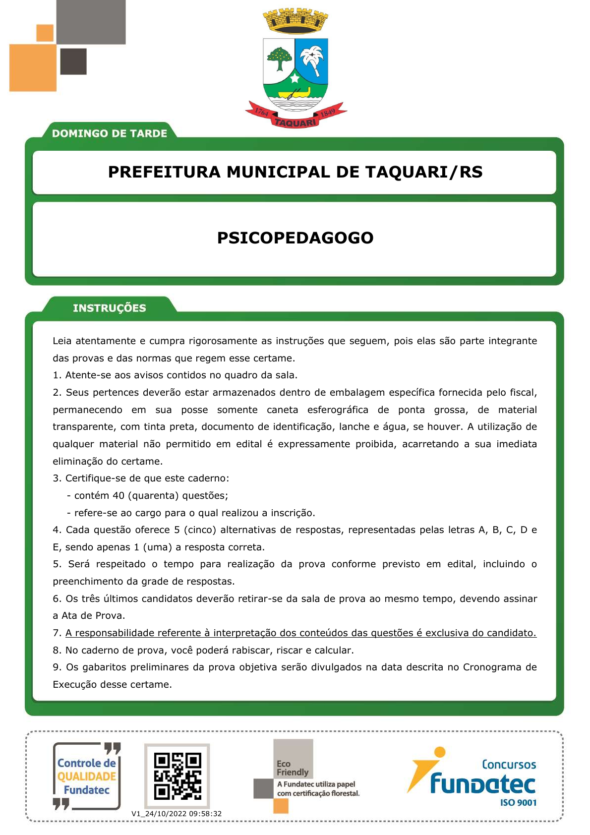 pcimarkpci MDAwMDowMDAwOjAwMDA6MDAwMDowMDAwOmZmZmY6YTg3OTo2Yjlm:U2F0LCAwMiBEZWMgMjAyMyAxNTo0OTo1MiAtMDMwMA== www.pciconcursos.com.br PREFEITURA MUNICIPAL DE TAQUARI/RS Leia atentamente e cumpra rigorosamente as instruções que seguem, pois elas são parte integrante das provas e das normas que regem esse certame. 1. Atente-se aos avisos contidos no quadro da sala. 2. Seus pertences deverão estar armazenados dentro de embalagem específica fornecida pelo fiscal, permanecendo em sua posse somente caneta esferográfica de ponta grossa, de material transparente, com tinta preta, documento de identificação, lanche e água, se houver. A utilização de qualquer material não permitido em edital é expressamente proibida, acarretando a sua imediata eliminação do certame. 3. Certifique-se de que este caderno: - contém 40 (quarenta) questões; - refere-se ao cargo para o qual realizou a inscrição. 4. Cada questão oferece 5 (cinco) alternativas de respostas, representadas pelas letras A, B, C, D e E, sendo apenas 1 (uma) a resposta correta. 5. Será respeitado o tempo para realização da prova conforme previsto em edital, incluindo o preenchimento da grade de respostas. 6. Os três últimos candidatos deverão retirar-se da sala de prova ao mesmo tempo, devendo assinar a Ata de Prova. 7. A responsabilidade referente à interpretação dos conteúdos das questões é exclusiva do candidato. 8. No caderno de prova, você poderá rabiscar, riscar e calcular. 9. Os gabaritos preliminares da prova objetiva serão divulgados na data descrita no Cronograma de Execução desse certame. . QR code V1_24/10/2022 09:58:32 PSICOPEDAGOGO pcimarkpci MDAwMDowMDAwOjAwMDA6MDAwMDowMDAwOmZmZmY6YTg3OTo2Yjlm:U2F0LCAwMiBEZWMgMjAyMyAxNTo0OTo1MiAtMDMwMA== www.pciconcursos.com.br 684_LP_CG_NS_DT_28/10/2022 18:33:13 Execução: Fundatec NÍVEL SUPERIOR LÍNGUA PORTUGUESA Instrução: As questões de números 01 a 10 referem-se ao texto abaixo. O dia fatal Por Martha Medeiros 01 02 03 04 05 06 07 08 09 10 11 12 13 14 15 16 17 18 19 20 21 22 23 24 25 26 27 28 29 30 31 32 33 34 Sempre que chega o fim do ano, um calafrio me percorre. “Passei por ele de novo”, penso. Atravessei todos os 12 meses e cada um de seus dias, e um deles era ele, que, discreto, não se fez notar. Percorri o dia da minha futura morte em plena vigência da vida. É sobre a vida que pretendo falar, confie em mim. Ele existe: o dia fatal. Porém, anônimo. Pode ser o 13 de abril, o 21 de junho, o 8 de novembro ou qualquer outro dia do calendário 2022 que se descortina. Olho para todos os próximos 365 dias e levo fé de que passarei por ele, mais uma vez, sã e salva, sem desconfiar o ano (felizmente, indeterminado) em que ele não me deixará seguir em frente, me reterá para sempre e formará, junto ___ data do meu nascimento, a dupla mais importante da minha biografia: o dia em que cheguei e o dia em que parti, inseparáveis na minha lápide. Que ele não tenha o mau gosto de cair no mesmo dia que nasci, quero o privilégio de ter duas datas máster para me chorarem. Falta de timing dessa mulher, talvez o leitor esteja pensando. Em pleno entusiasmo da virada, este assunto? Entenda, é apenas uma homenagem ___ elegância da inocência. Todos os anos, passo 24 horas vivenciando um dia que terá grande destaque no meu futuro, porém acordo como se fosse uma data qualquer. Cumprimento o sol que avisto pela janela, tomo meu suco de laranja, enrolo uma fatia de queijo numa fatia de blanquet de peru e engulo esse enroladinho em pé mesmo, enquanto aguardo meu personal para uma hora de treino de força, confiante de que isso me garantirá alguma longevidade. A inocência é muito camarada, nunca estraga nosso prazer de fazer planos. Antes que ele seja o último, será mais um dia comum. Escreverei um texto que não mudará o mundo, talvez assista a um filme com o namorado e me preocuparei com trivialidades, sem ter a mínima ideia de que estou passando por um outro tipo de aniversário, aquele que jamais celebrarei. O que isso tem a ver com a vida? Tudo. A vida só é bem aproveitada graças ___ essa única ignorância a festejar. Na inauguração de mais um ano, sinto como se eu tivesse a eternidade toda para amar, para viajar, para lutar por mudanças necessárias, para fazer novos amigos e com eles beber muito vinho. Para plantar uma muda de cipreste no jardim, acreditar que o verei crescer e que ainda desfrutarei da sombra – pouca, cipreste não dá muita sombra, convenhamos. Prezo a generosidade deste desconhecimento fundamental, o segredo mais bem guardado do universo, que nunca se revela a fim de que possamos percorrer sossegados a estrada adiante, do contrário, paralisaríamos. É isso, a crônica esquisita é apenas para agradecer o mistério, esse adorável condutor dos nossos sonhos. (Disponível em: https://www.nsctotal.com.br/colunistas/martha-medeiros/o-dia-fatal – texto adaptado especialmente para esta prova). QUESTÃO 01 – Considerando o exposto pelo texto, analise as assertivas a seguir: I. A autora gostaria de ter datas de nascimento e morte iguais para que todos possam se lembrar dela num dia “máster”. II. O texto foi escrito no período de Ano Novo, daí a autora se preocupar que o leitor não goste do tema. III. Todos os anos, a autora busca viver o dia que será o da sua morte como se fosse o último dia de sua vida. Quais estão corretas? A) Apenas I. B) Apenas II. C) Apenas I e II. D) Apenas I e III. E) Apenas II e III. pcimarkpci MDAwMDowMDAwOjAwMDA6MDAwMDowMDAwOmZmZmY6YTg3OTo2Yjlm:U2F0LCAwMiBEZWMgMjAyMyAxNTo0OTo1MiAtMDMwMA== www.pciconcursos.com.br 684_LP_CG_NS_DT_28/10/2022 18:33:13 Execução: Fundatec NÍVEL SUPERIOR QUESTÃO 02 – Analise a charge a seguir e as proposições que se fazem a respeito dela e do texto anterior: Fonte: https://www.otempo.com.br/image/contentid/policy:1.2691711:1656585282/image.jpeg?f=3x2& w=940&$p$f$w=3034e85 I. Tanto o texto de Martha Medeiros quanto a charge empregam a pala