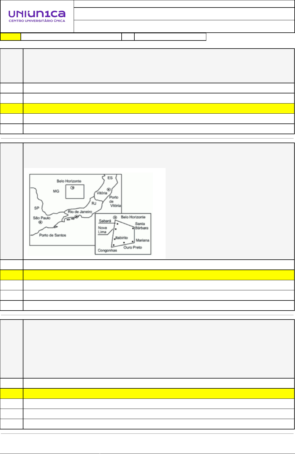 21/10/2024 13:24:18 1/3 REVISÃO DE SIMULADO Nome: NEIKYLLA ROMAO DA SILVA Disciplina: Recursos Naturais e Energéticos do Brasil Respostas corretas são marcadas em amarelo X Respostas marcardas por você. Questão 001 O Brasil é um dos maiores produtores do mundo, com mais de 480 milhões de toneladas produzidas. No ranking mundial, o país fica atrás apenas da China, com mais de 1 bilhão de toneladas. Qual minério está sendo retratado na informação dada? X A) Estanho. B) Lítio. C) Ferro. D) Nióbio. E) Alumínio. Questão 002 (UFRRJ) O mapa adiante coloca em destaque uma região cuja atividade econômica está articulada com os portos de Vitória (ES) e Santos (SP). Trata-se da região conhecida como: X A) Quadrilátero Ferrífero. B) Zona da Mata Mineira. C) Polígono da Seca. D) Triângulo Mineiro. E) Grande Belo Horizonte. Questão 003 (UEL – Adaptado) Considere as seguintes afirmações sobre a exploração e as reservas minerais do Brasil. I. A mineração de ferro é uma das principais atividades extrativas do país. II. A maior parte da extração de ouro está na região Norte. III. Há grandes reservas de bauxita no Estado do Pará. IV. As maiores reservas mundiais de ouro estão localizadas no Pará e Tocantins. Estão corretas somente: A) III e IV. X B) II, III e IV. C) II e IV. D) I, II e III. E) I e III. 21/10/2024 13:24:18 2/3 Questão 004 Reserva mineral é diferente de recurso mineral. O recurso é conhecido, mas ainda não foi submetido ao processo de estudos e avaliação econômica. Enquanto que a reserva já é a parte do recurso mineral que se encontra sendo explorado economicamente. Para chegar ao início do processo de exploração, alguns estudos devem ser realizados. Além disso, quando finda o processo de exploração, ações também devem ser tomadas para que o fim da atividade e desativação da lavra. Diante do exposto, qual a sequência correta de etapas no processo de mineração? A) Prospecção > Estudos preliminares > Lavra > Desativação. B) Pesquisa mineral > Estudos preliminares > Exploração > Fechamento. C) Prospecção > Pesquisa mineral > Lavra > Descomissionamento. D) Pesquisa mineral > Prospecção > Lavra > Descomissionamento. X E) Reconhecimento geológico > Projeto > Explotação > Desativação. Questão 005 Sobre a mineração no Brasil, analise as afirmativas: I. A mineração comercial teve início no século XVII, quando as reservas de ouro foram descobertas em Minas Gerais. II. É uma atividade extremamente poluidora, liberando muitos gases do efeito estufa (GEE) para a atmosfera. III. É uma atividade geradora de grande quantidade de resíduos e rejeitos do processo exploratório. IV. No país, dois minerais estratégicos são as rochas fosfáticas e calcárias, que são importantes fertilizantes. V. Apesar de impactos ambientais negativos, a mineração contribui para a geração de emprego, promovendo o desenvolvimento social. Estão corretas as afirmativas: A) I, II, IV e V. B) I, II e IV. X C) I e III. D) I, II e III. E) I, III, IV e V. Questão 006 A) ouro, ferro, níquel e alumínio. B) níquel, manganês, alumínio e ferro. X C) alumínio, ferro, manganês e níquel. D) manganês, ferro, alumínio e níquel. E) ferro, manganês, níquel e alumínio. Questão 007 (FEI – Adaptado) As localidades de Itabira em Minas Gerais e Vale do Paraopeba da Serra dos Carajás no Pará são áreas conhecidas no país, devido A) à instalação de hidrelétricas de grande porte. 21/10/2024 13:24:18 3/3 B) à exploração de minérios, sobretudo o minério de ferro. C) às jazidas de petróleo. X D) à criação de gado, pois são regiões pecuaristas por excelência. E) às jazidas de cobre e diamantes. Questão 008 (ENEM) No dia 28 de fevereiro de 1985, era inaugurada a Estrada de Ferro Carajás, pertencente e diretamente operada pela Companhia Vale do Rio Doce (CVRD), na região Norte do país, ligando o interior ao principal porto da região, em São Luís. Por seus, aproximadamente, 900 quilômetros de linha, passam, hoje, 5353 vagões e 100 locomotivas. (Disponível em: http://www.transportes.gov.br) A ferrovia em questão é de extrema importância para a logística do setor primário da economia brasileira, em especial para porções dos estados do Pará e Maranhão. Um argumento que destaca a importância estratégica dessa porção do território é a A) logística de importação de matérias-primas industriais. B) produção sustentável de recursos minerais não metálicos. C) capacidade de produção de minerais metálicos. X D) produção de energia para as principais áreas industriais do país. E) produção de recursos minerais energéticos.