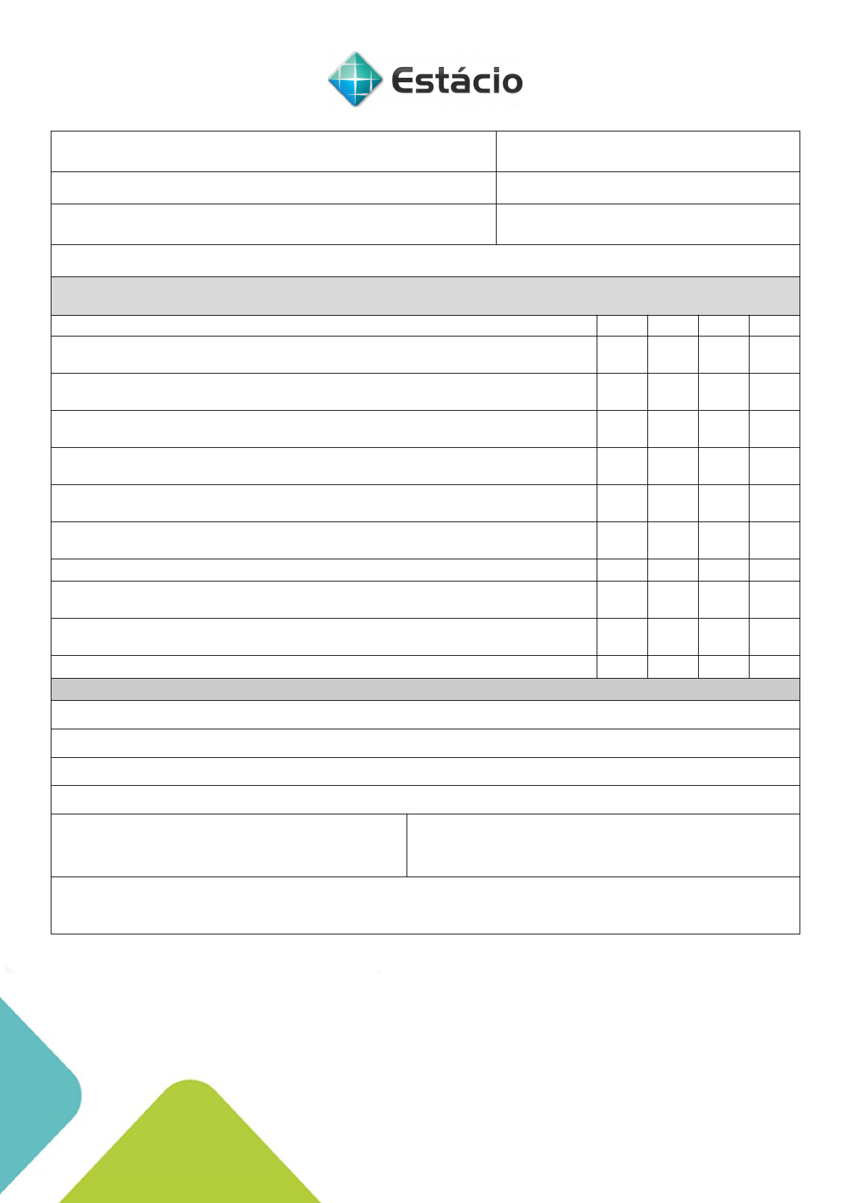 ANEXO 3 – FICHA DE AVALIAÇÂO DO ESTÁGIO SUPERVISIONADO Nome do(a) Estagiário(a): Curso: IES: Unidade/Polo: Nome da disciplina de Estágio: Código da disciplina de Estágio: Empresa concedente do estágio: OBSERVAÇÕES: A avaliação do(a) estagiário(a) será expressa de acordo com a escala: O= ótimo B= bom R= regular I= insuficiente ASPECTOS AVALIADOS O B R I 1. Interesse: Preocupação para conhecer os aspectos relacionados ao trabalho e à organização. 2. Iniciativa: Iniciativa demonstrada para desenvolver seus trabalhos sem dependência de outros. 3. Cooperação: Disposição para cooperar e atender prontamente às solicitações. 4. Assiduidade: Frequência ao(s) local(is) de Estágio conforme cronograma. 5. Pontualidade: Comparecimento ao(s) local(is) de Estágio nos horários marcados. 6. Disciplina: Observância das normas e regulamentos internos da organização. 7. Sociabilidade: Facilidade de integração com as pessoas. 8. Adaptabilidade: Facilidade em compreender e se adaptar às situações do dia-a-dia de trabalho. 9. Senso de Responsabilidade: Zelo pelo material, bens e equipamentos da organização. 10. Ética: Conduta em relação aos padrões e costumes. COMENTÁRIOS/OBSERVAÇÕES (supervisor da organização concedente) Suficiente ( ) Insuficiente ( ) Data: ___/___/___ ________________________________________ Assinatura e carimbo do Supervisor da empresa concedente image1.png image2.png