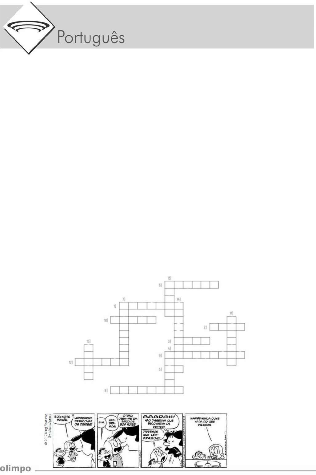 Rogger – Gramática – Tarefa 18 Substantivo 01. Reescreva as frases a seguir trocando o substantivo destacado pelo substantivo entre parênteses. Faça as alterações necessárias. a) Aquela mulher adora passear pelo parque. (homens) b) A roupa azul será usada no baile de domingo. (terno) c) O último pacote foi devolvido ontem. (embalagem) d) Estes cinco meninos espertos sabem dirigir. (garotas) 02. Das suas respostas para a questão 1, copie as palavras que acompanham os substantivos homens, terno, embalagem e garotas. Compare-as com as palavras que acompanhavam os substantivos mulher, roupa, pacote e meninos. Responda: as palavras que acompanham os substantivos sofreram variação quando os substantivos foram trocados? Se sim, por quê? 03. Escreva a forma no gênero feminino ao lado de cada substantivo masculino indicado a seguir. Preencha adequadamente o diagrama com essas palavras na forma feminina. 1) compadre — 2) cavalheiro — 3) genro — 4) marajá — 5) réu — 6) cidadão — 7) cônsul — 8) anfitrião — 9) maestro — 10) ancião — 11) cavaleiro — 12) carneiro — 13) bode — 14) elefante — 15) pavão — 04. Leia a tirinha reproduzida a seguir para responder à questão proposta. Português 2 O substantivo mamãe (no 4º quadrinho) é um substantivo uniforme. Concorda ou discorda dessa afirmativa? Por quê? 05. Classifique os substantivos transcritos a seguir como epiceno, comum de dois gêneros ou sobrecomum. a) o jovem — b) o cônjuge — c) o pianista — d) a testemunha — e) o tatu — f) o indivíduo — g) o mamão — h) a vítima — i) a criança — j) a baleia — k) a criatura — l) o sabiá — m) o cliente — n) o dentista — o) a águia — 06. Há substantivos que, ao terem o gênero alterado, também sofrem modificação do significado. É o caso dos listados a seguir. Escreva o significado de cada um deles, observando o gênero a que pertencem. a) a cabeça — b) o cabeça — c) o capital — d) a capital — e) o moral — f) a moral — g) o grama — h) a grama — i) o rádio — j) a rádio — 07. Crie frases empregando os substantivos dos itens b, c, e, g e j da atividade anterior. 08. Existem substantivos que costumam provocar dúvidas quanto ao gênero a que correspondem. A seguir, transcrevemos alguns deles. Identifique quais são os masculinos e quais são os femininos e escreva antes de cada um deles o artigo definido — o ou a — adequado. a) dó b) couve c) guaraná d) comichão e) eclipse f) sentinela g) champanha h) cal i) formicida j) aguardente k) alface 09. Observe as imagens a seguir. Identifique o substantivo composto que nomeia cada uma delas e escreva-o. Em seguida, flexione esse substantivo no plural. Exercícios Complementares 3