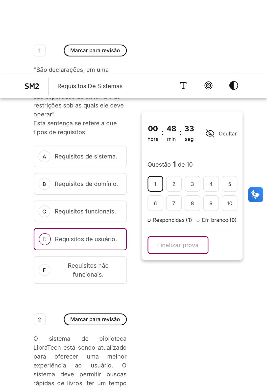 A B C D E 1 Marcar para revisão "São declarações, em uma linguagem natural com diagramas, de quais serviços são esperados do sistema e as restrições sob as quais ele deve operar". Esta sentença se refere a que tipos de requisitos: Requisitos de sistema. Requisitos de domínio. Requisitos funcionais. Requisitos de usuário. Requisitos não funcionais. 2 Marcar para revisão O sistema de biblioteca LibraTech está sendo atualizado para oferecer uma melhor experiência ao usuário. O sistema deve permitir buscas rápidas de livros, ter um tempo 00 hora : 48 min : 33 seg Ocultar Questão 1 de 10 Respondidas �1� Em branco �9� Finalizar prova 1 2 3 4 5 6 7 8 9 10 SM2 Requisitos De Sistemas A B C D E de resposta rápido e ser intuitivo para novos usuários. Ademais, precisa assegurar a integridade das informações dos usuários. Considerando o texto, analise as afirmativas abaixo: I. A capacidade de realizar buscas rápidas de livros é um requisito de negócio. II. A garantia da integridade das informações dos usuários é um requisito não funcional. III. Um sistema intuitivo para novos usuários é um requisito funcional. Apenas as afirmativas I e II estão corretas Apenas a afirmativa II está correta Apenas as afirmativas II e III estão corretas Apenas a afirmativa III está correta Apenas a afirmativa I está correta 3 Marcar para revisão Em 1995, a Organização Australiana de Defesa e A B C Tecnologia relatou os resultados de uma pesquisa sobre problemas com especificação de requisitos na Marinha. Um dos problemas destacados foi a disparidade no nível das especificações. Isto é, alguns requisitos foram especificados em um nível alto e outros em um nível muito baixo. Marque a opção que NÃO faz parte dos resultados dessa pesquisa. Algumas vezes, os analistas de requisitos utilizaram diferentes estilos de escrita, especialmente em área diferentes do sistema. A diferença de experiência entre os analistas levou a diferentes níveis de detalhes nos requisitos. Na tentativa de reutilizar os requisitos a partir de sistemas anteriores, os analistas empregaram diferentes formatos e estilos de escrita. D E Os requisitos de baixo nível foram especificados até o nível de programação desnecessariamente e por isso apresentou-se de forma diferente. Frequentemente, os requisitos foram excessivamente especificados, quando os analistas identificaram tipos específicos de computadores e linguagens de programação assumiram uma solução específica ou impuseram processos e protocolos não apropriados. 4 Marcar para revisão Em relação aos conceitos de requisitos de software, analise os itens a seguir e coloque �V) para a assertiva verdadeira e �F) para a assertiva falsa. ( ) Na definição dos requisitos de software, nem todos os requisitos não funcionais dizem respeito ao sistema de software a ser desenvolvido. ( ) O levantamento de requisitos A B C de software privilegia a visão do desenvolvedor em relação aos requisitos de um produto. Já a análise dos requisitos prioriza a visão que o cliente e os usuários têm dos requisitos de um produto. ( ) Os requisitos de um sistema são descrições dos serviços fornecidos pelo sistema e suas restrições operacionais. O processo de descobrir, analisar, documentar e verificar esses serviços e restrições é denominado engenharia de requisitos. ( ) Gerência de requisitos pode ser conceituada como enfoque sistemático para a elicitação, organização e documentação dos requisitos do sistema e um processo que estabelece e mantém o acordo entre usuários e a equipe de projeto à medida que os requisitos são modificados. F, F, V, V V, F, V, V F, F, V, F D E A B C V, V, F, V F, V, F, F 5 Marcar para revisão O desenvolvimento de sistema é composto por várias etapas, cada qual com sua função e importância no geral. Considerando a etapa de Levantamento de Requisitos é correto afirmar que sua função compreende em: Verificar os erros de construção. Definir a arquitetura necessária para aumentar a usabilidade do sistema. Descobrir as condições necessárias para atingir os objetivos do sistema. D E Identificar os pontos de gargalos existentes na execução do sistema. Gerar um documento com o objetivo de determinar a solução metodológica do processo de desenvolvimento do sistema. 6 Marcar para revisão Segundo Sommerville �2011, pag. 76�, "O gerenciamento de requisitos é o processo de compreensão e controle das mudanças nos requisitos do sistema. No entanto, você deve começar a planejar como gerenciar mudanças de requisitos durante o processo de elicitação de requisitos." O passo inicial é planejar e definir bem qual será o nível do detalhamento pretendido no gerenciamento de requisitos. São exemplos de atributos que devem ser avaliados, EXCETO: A B C D E Identificação de requisitos. Processo de gerenciamento de mudanças. Políticas de rastreabilidade. Ferramenta de apoio. workshops de requisitos e pesquisa/questionários. 7 Marcar para revisão Uma empresa de software está desenvolvendo um aplicativo de gerenciamento de tarefas. Este aplicativo deve permitir que os usuários criem, editem e excluam tarefas, além de definir prazos. Importante destacar que o aplicativo deve ser acessível em diversas plataformas. Qual dos seguintes é um requisito funcional do aplicativo de gerenciamento de tarefas? A B C D E A B C Interface amigável para o usuário Capacidade de criar tarefas Tempo de resposta rápido Compatibilidade com diversos sistemas operacionais Uso eficiente de recursos do dispositivo 8 Marcar para revisão A técnica de elicitação aplicada quando se tem um número elevado de usuários para identificação de informações é denominado de: Entrevista. Questionários. Brainstorming. D E A B C D E Etnografia. Leitura de documentos. 9 Marcar para revisão Uma empresa de desenvolvimento de software está criando um aplicativo de e- commerce. Durante a fase de coleta 