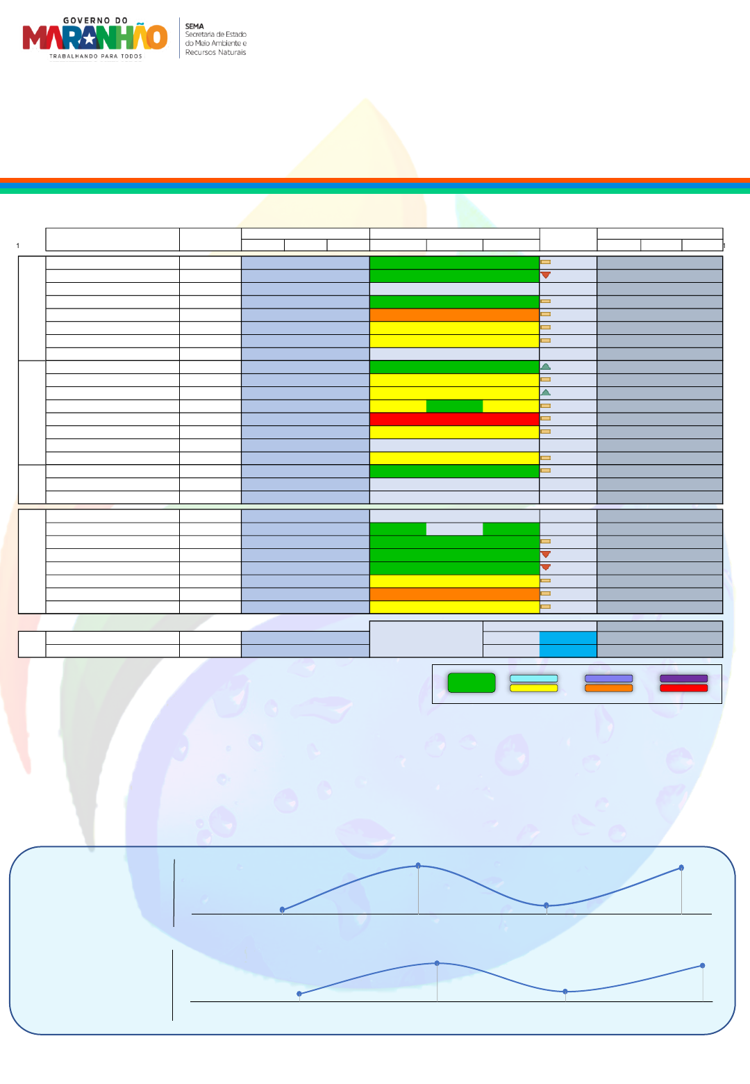 Monitoramento Hidrológico A Secretaria de Estado de Meio Ambiente e Recursos Naturais-SEMA, por meio da Sala de Situação, monitora as condições de hidrometeorológicas e de focos de calor no estado, também disponibiliza através desse boletim diário, as melhores informações disponíveis para subsidiar a tomada de decisões pelas autoridades competentes. *As PCD realizam a transmissão dos dados a cada 15min via satélite GOES. *A defluência praticada pela UHE de Estreito são definidas pela Resolução nº70/ANA, de 19 de abril de 2021, que regula politicas de defluência nos reservatórios do Tocantins. Fonte: Hidro-Telemetria/ANA Legenda São Luís (MA), 22 de outubro de 2024 A PCD de Alto Parnaíba registrou a maior variação do nível, no local o rio Parnaíba elevou 20 cm em 8h, estando em nível normal. A barragem da Usina Hidroelétrica de Estreito (PCD-Montante 1) no rio Tocantins, esta com o volume de armazenamento de 89,24%, de sua capacidade, a vazão defluente é de 1756m³/s*, verificada às 9h. A Usina Hidroelétrica de Boa Esperança, no rio Parnaíba, está com volume de armazenamento de 30,75%, com defluência na comporta de 256m³/s*. Versão 4.03 - 2024 Boletim Diário de Situação Nº 296/2024 Fonte: MARINHA DO BRASIL.M Tábua de Marés Estação São Luís - Nível Médio 3.28 m – (Lat. 02º 31'.6 S Lon. 044º 18'.7 W) 04:11 0,50 m 10:27 5,60 m 16:22 1,00 m 22:36 5,40 m 0 0 :0 0 0 0 :2 4 0 0 :4 8 0 1 :1 2 0 1 :3 6 0 2 :0 0 0 2 :2 4 0 2 :4 8 0 3 :1 2 0 3 :3 6 0 4 :0 0 0 4 :2 4 0 4 :4 8 0 5 :1 2 0 5 :3 6 0 6 :0 0 0 6 :2 4 0 6 :4 8 0 7 :1 2 0 7 :3 6 0 8 :0 0 0 8 :2 4 0 8 :4 8 0 9 :1 2 0 9 :3 6 1 0 :0 0 1 0 :2 4 1 0 :4 8 1 1 :1 2 1 1 :3 6 1 2 :0 0 1 2 :2 4 1 2 :4 8 1 3 :1 2 1 3 :3 6 1 4 :0 0 1 4 :2 4 1 4 :4 8 1 5 :1 2 1 5 :3 6 1 6 :0 0 1 6 :2 4 1 6 :4 8 1 7 :1 2 1 7 :3 6 1 8 :0 0 1 8 :2 4 1 8 :4 8 1 9 :1 2 1 9 :3 6 2 0 :0 0 2 0 :2 4 2 0 :4 8 2 1 :1 2 2 1 :3 6 2 2 :0 0 2 2 :2 4 2 2 :4 8 2 3 :1 2 2 3 :3 6 05:01 1,10 m 11:20 5,20 m 17:14 1,40 m 23:32 4,90 m 0 0 :0 0 0 0 :2 4 0 0 :4 8 0 1 :1 2 0 1 :3 6 0 2 :0 0 0 2 :2 4 0 2 :4 8 0 3 :1 2 0 3 :3 6 0 4 :0 0 0 4 :2 4 0 4 :4 8 0 5 :1 2 0 5 :3 6 0 6 :0 0 0 6 :2 4 0 6 :4 8 0 7 :1 2 0 7 :3 6 0 8 :0 0 0 8 :2 4 0 8 :4 8 0 9 :1 2 0 9 :3 6 1 0 :0 0 1 0 :2 4 1 0 :4 8 1 1 :1 2 1 1 :3 6 1 2 :0 0 1 2 :2 4 1 2 :4 8 1 3 :1 2 1 3 :3 6 1 4 :0 0 1 4 :2 4 1 4 :4 8 1 5 :1 2 1 5 :3 6 1 6 :0 0 1 6 :2 4 1 6 :4 8 1 7 :1 2 1 7 :3 6 1 8 :0 0 1 8 :2 4 1 8 :4 8 1 9 :1 2 1 9 :3 6 2 0 :0 0 2 0 :2 4 2 0 :4 8 2 1 :1 2 2 1 :3 6 2 2 :0 0 2 2 :2 4 2 2 :4 8 2 3 :1 2 2 3 :3 6 1 6h 12h 24h 6h 12h 24h 6h 12h 24h 1 BARRA DO CORDA 22/10 07:45 0,0 0,0 0,0 152 152 154 0 cm/h 33 33 34 SÃO ROBERTO 22/10 07:45 0,0 0,0 0,0 128 137 130 -2 cm/h 33 36 34 JOSELÂNDIA MANUTENÇÃO - - - - - - - - - PEDREIRAS 22/10 07:45 0,0 0,0 0,0 211 210 209 0 cm/h 45 44 44 SÃO LUIZ GONZAGA 22/10 07:45 0,0 0,0 0,0 73 72 72 0 cm/h 43 43 43 BACABAL 22/10 07:45 0,0 0,0 0,0 134 134 134 0 cm/h 43 43 43 GRAJAÚ 22/10 07:45 0,0 0,0 0,0 201 201 201 0 cm/h 4 4 4 BELA VISTA DO MA 22/10 07:45 0,0 0,0 0,0 - - - - - - MIRADOR 22/10 08:15 0,0 0,0 0,0 252 249 244 1 cm/h 11 10 10 COLINAS 22/10 07:45 0,0 0,0 0,0 51 50 49 0 cm/h 30 30 30 GOV.EUGÊNIO BARROS 22/10 07:45 0,0 0,0 0,0 114 111 111 1 cm/h 31 30 30 CAXIAS 22/10 07:45 0,0 0,0 0,0 96 97 95 0 cm/h 35 35 34 CODÓ 22/10 07:45 0,0 0,0 0,0 29 29 28 0 cm/h 29 29 28 COROATÁ 22/10 07:45 0,0 0,0 0,2 105 104 103 0 cm/h 28 27 27 ITAPECURU-MIRIM MANUTENÇÃO - - - - - - - - - CANTANHEDE 22/10 07:45 0,0 0,0 0,0 219 218 219 0 cm/h 25 25 25 VARGEM GRANDE - MUNIM 22/10 07:45 0,0 0,0 0,0 80 80 81 0 cm/h 2 2 2 S.BENEDITO RIO PRETO MANUTENÇÃO - - - - - - - - - VARGEM GRANDE 22/10 07:45 0,0 0,0 0,0 - - - - - - ALTO PARNAÍBA - FAZENDA UNIÃO MANUTENÇÃO - - - - - - - - - ALTO PARNAÍBA 22/10 07:45 0,0 0,0 0,0 341 - 321 82 0 68 TASSO FRAGOSO 22/10 07:45 0,0 0,0 0,0 132 131 137 0 cm/h 115 115 120 BALSAS 22/10 07:45 0,0 0,0 0,2 274 282 275 -1 cm/h 72 78 73 SÃO FÉLIX DE BALSAS 22/10 08:00 0,0 0,0 0,0 133 135 138 -1 cm/h 114 116 119 BARÃO DE GRAJAÚ 22/10 08:00 0,0 0,0 0,0 228 228 228 0 cm/h 256 256 256 COELHO NETO 22/10 07:45 0,0 0,0 0,0 227 227 228 0 cm/h 269 269 272 LUZILÂNDIA 22/10 08:30 0,0 0,0 0,0 117 117 117 0 cm/h 275 275 275 22/10 08:00 0,0 9,6 18,2 22/10 07:30 0,0 0,0 2,2 Vazão (m³/s) NIVEL AFLUÊNCIA DEFLUÊNCIAVOLUME ARMAZENAMENTOBOA ESPERANÇA - RIO PARNAÍBA ESTREÍTO - RIO TOCANTINS 256 m/s³ 1756 m/s³ 221 m/s³ 2467 m/s³ 300 m 31 % B H P A R N A ÍB A 156 m 89 % Nível (cm) Taxa de Variação Precipitação (mm) Município Data/hora UHE B H M U N IM B H I T A P E C U R U B H M E A R IM Emergência de Estiagem Emergência de Cheia Alerta de Estiagem Alerta de Cheia Atenção de Estiagem Atenção de Cheia N o rm a l 22 de outubro 23 de outubro É previsto que as temperaturas variem entre a mínima de 22°C em Alto Parnaíba, na região Sul Maranhense, e máxima de 40°C no início da tarde em Caxias, na região Leste Maranhense. Além disto, é previsto 19% de umidade relativa do ar em Caxias, na região Leste Maranhense Monitoramento Meteorológico Versão 4.03 - 2024 Boletim Diário de Situação Previsão do tempo para 22/10/2024 Nº 296/2024 21/10/2024 Registro do dia: Monitor de Secas • Contexto Geral do Monitor de Seca O Monitor de Secas é um processo de acompanhamento periódico da situação da seca, que mensalmente é disponibilizados através de mapas, a indicação de secas de curto prazo (últimos 3, 4 e 6 meses) e de longo prazo (últimos 12, 18 e 24 meses), indicando a evolução da seca na região. • Síntese do mês No Maranhão, devido à piora nos indicadores, houve o avanço da seca fraca (S0) no nordeste e da seca moderada (S1) no oeste e norte do estado. Além disso, houve o agravamento da seca no sul, que passou de moderada (S1) para grave (S2). Os impactos permanecem de curto e longo prazo (CL) no sul e de curto prazo (C) nas demais áreas. Os boletins mensais de Secas do estado do Maranhão, estão dispon