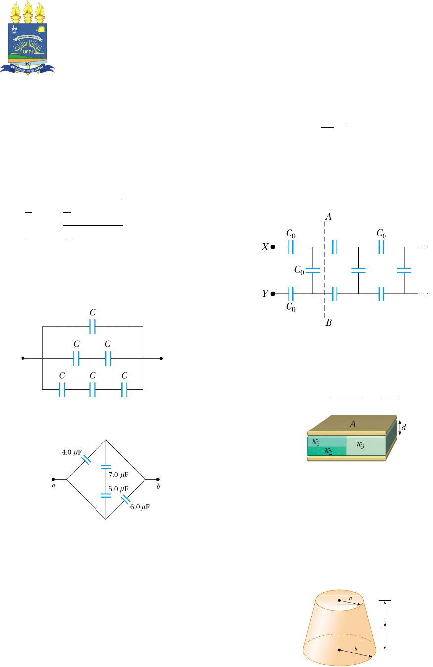 Universidade Federal do Piauí Reuni Digital Centro de Educação Aberta e à Distância Curso Superior de Tecnologia em Energias Renováveis Terceira Lista de Física II – Parte I 01) Dois capacitores (C1 e C2), quando conectados em paralelo, têm capacitância de Cp e fornecem uma capacidade equivalente de Cs quando conectado em série. Qual a capacitância de cada capacitor? Mostre que a capacitância de cada capacitor é dado por : C1= 1 2 C p+√ 14 C p 2−C pC s e C2= 1 2C p−√ 14 C p 2−C pC s 02) Encontre a capacitância equivalente para os circuitos abaixo. a) Todos os capacitores têm a mesma capacitância C. b) os capacitores estão especificados na figura 03)Alguns sistemas físicos que possuem capacitância continuamente distribuída pelo espaço podem ser modelados como uma matriz infinita de elementos de circuito discretos. Exemplos são um guias de microondas e o axônio de uma célula nervosa. Para praticar a análise de uma matriz infinita, mostre que a capacitância equivalente C entre os terminais X e Y do conjunto infinito de capacitores representados na figura é: C= C0 2 (√3−1) . Cada capacitor tem capacitância C0. (Sugestão: Imagine que a sequência é cortada na linha AB e observe que a capacitância equivalente da seção infinita à direita de AB também é C). 04) Um capacitor de placas paralelas é preenchido por substâncias dielétricas, conforme na figura. Mostre que a capacitância do capacitor é dado por: C=(κ3+ 2 κ1κ2 κ1+κ2 )(ε0 A 2d ) 05) Um resistor tem a forma de um tronco de cone circular reto. Os raios das bases são a e b, e a altura L. Se a inclinação da superfície lateral for suficientemente pequen, podemos supor que a densidade de corrente é uniforme. Calcular a resistência deste sistema sabendo que o material tem uma resistividade ρ . 06)a) Encontre a resistência equivalente entre os pontos a e b do circuito da figura. b) A diferença de potencial entre os pontos a e b é de 34,0V, encontre a corrente em cada resistor. 07)Considere o circuito abaixo. a) Encontre a corrente no resistor de 20Ω e b) a diferença de potencial entre os pontos a e b. 08)Para fins de medida de resistência elétrica de calçados por meio do corpo do usuário em pé em uma placa de metal no solo, o American National Standards Institute(ANSI) especifica o circuito mostrado na figura. A diferença de potencial ΔV sobre o resistor de 1,0MΩ é medida com um voltímetro ideal. a) Mostre que a resistência do calçado é: Rcalçados= 50,0V−ΔV ΔV b) Em um teste médico, uma corrente que passa pelo corpo humano não deve exceder 150μ A . A corrente fornecida pelo produto especificado pelo ANSI pode exceder 150μ A ? Para decidir, considere uma pessoa em pé, descalça na placa de terra. 09)Calcule a potência dissipada em cada resistor no circuito abaixo: 10)Determine a corrente em cada braço do circuito abaixo: 11)Usando as leis de Kirchhoff a) encontre a corrente em cada resistor da figura. b) Encontre a diferença de potencial entre os pontos c e f. 12) Considere um circuito RC em série, c) Qual é a corrente máxima no resistor? 13°) Um capacitor está carregado inicialmente com uma carga de 5,1μC e tem uma capacitância de 2,0nF . Ele é descarregado em um circuito que tem um resistor de R=1,3kΩ . Encontre a corrente no resistor após 9,0μ s após o resistor ser conectado aos terminais do capacitor, b) Qual é a carga que permanece no capacitor após 8,0μ s ? c) Qual é a corrente máxima no resistor? 14°)A figura mostra um modelo de circuito para a transmissão de um sinal elétrico, como o de uma TV a cabo, para um grande número de assinantes. Cada assinante conecta uma resistência de carga RL entre as linhas de transmissão e solo. Suponha que o solo está no potencial nulo e tem resistência desprezível. A resistência da linha de transmissão entre os pontos de conexão de diferentes assinantes é modelada como a resistência constante . RT Demonstre que a resistência equivalente na fonte do sinal é: Req= 1 2 [(4 RT RL+RT 2 )1 /2+RT ] onde R=1,0M Ω , e C=5,0μF a tensão é 30,0V. Encontre a) a constante de tempo capacitivo e b) a carga máxima no capacitor após o circuito ser ligado.