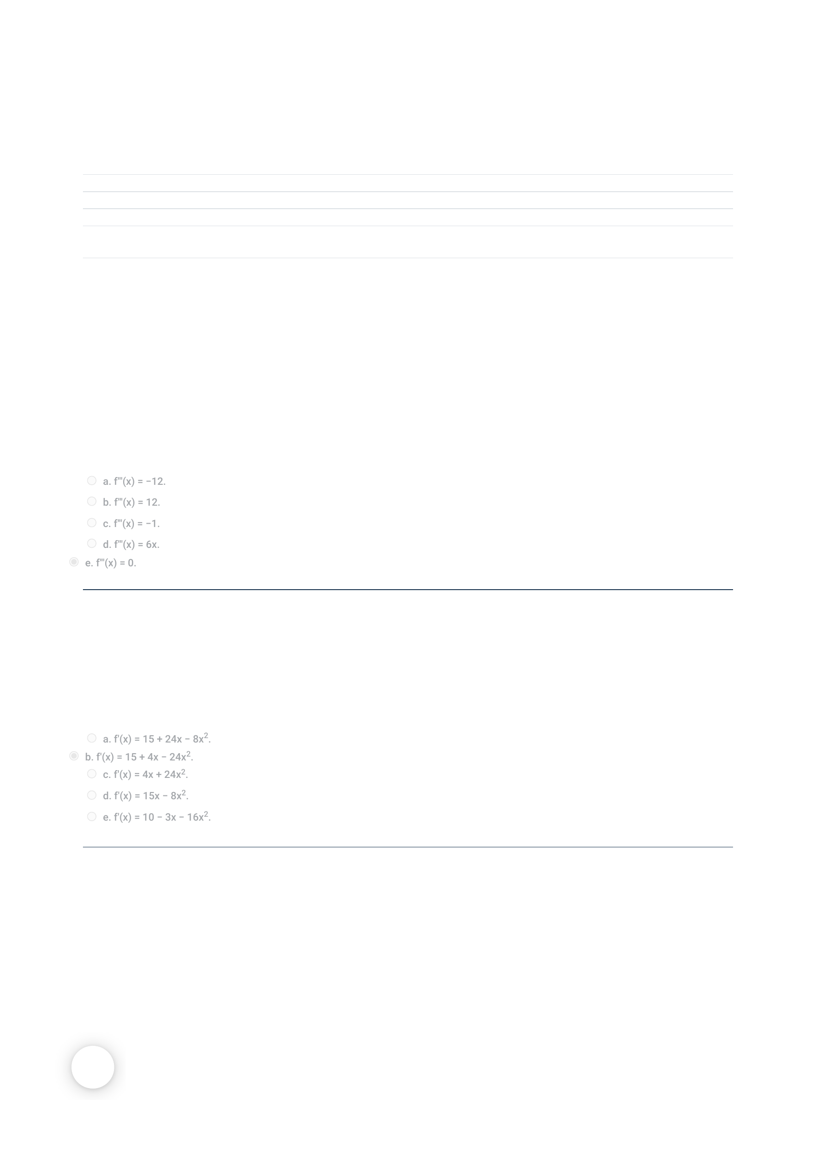 17/08/2020 Unidade 3 - Exercícios de fixação: avaliação da tentativa https://portalacademico.eniac.edu.br/mod/quiz/review.php?attempt=471514&cmid=177020 1/5 Página inicial / Cursos / Faculdade / 20202F / 20202F - DISCIPLINAS REGULARES / ENIAC_20202F_724 / Materiais de Estudo / Unidade 3 - Exercícios de �xação Iniciado em segunda, 17 ago 2020, 20:15 Estado Finalizada Concluída em segunda, 17 ago 2020, 20:19 Tempo empregado 3 minutos 50 segundos Avaliar 8,00 de um máximo de 10,00(80%) Questão 1 Correto Atingiu 1,00 de 1,00 Questão 2 Correto Atingiu 1,00 de 1,00 A derivada de ordem superior pode ser entendida como “a derivada da função derivada”, ou seja, para encontrar, por exemplo, a derivada segunda, basta derivar a função da primeira derivada novamente, e assim por diante. Nesse contexto, calcule a derivada de terceira ordem da função f(x) = (2x + 1) (3x − 2) e assinale a alternativa correta: Escolha uma: a. f′′′(x) = − 12. b. f′′′(x) = 12. c. f′′′(x) = − 1. d. f′′′(x) = 6x. e. f′′′(x) = 0. Encontre a derivada de f(x) = (3x − 2x )(5 + 4x) e assinale a alternativa correta. Escolha uma: 2 a. f′(x) = 15 + 24x − 8x .2 b. f′(x) = 15 + 4x − 24x .2 c. f′(x) = 4x + 24x .2 d. f′(x) = 15x − 8x .2 e. f′(x) = 10 − 3x − 16x .2 https://portalacademico.eniac.edu.br/ https://portalacademico.eniac.edu.br/course/index.php https://portalacademico.eniac.edu.br/course/index.php?categoryid=28 https://portalacademico.eniac.edu.br/course/index.php?categoryid=74 https://portalacademico.eniac.edu.br/course/index.php?categoryid=82 https://portalacademico.eniac.edu.br/course/view.php?id=7205 https://portalacademico.eniac.edu.br/course/view.php?id=7205#section-1 https://portalacademico.eniac.edu.br/mod/quiz/view.php?id=177020 17/08/2020 Unidade 3 - Exercícios de fixação: avaliação da tentativa https://portalacademico.eniac.edu.br/mod/quiz/review.php?attempt=471514&cmid=177020 2/5 Questão 3 Correto Atingiu 1,00 de 1,00 Questão 4 Correto Atingiu 1,00 de 1,00 Questão 5 Correto Atingiu 1,00 de 1,00 Encontre a derivada se y = (4x − 1)(7x + x) e assinale a alternativa correta. Escolha uma: 2 3 a. b. c. d. e. Quando se deriva uma função f, encontra-se a derivada primeira f'. Se f' for derivável, então sua derivada é denotada por f'′, denominada derivada segunda de f. Nesse contexto, encontre a derivada de segunda ordem da função f(x) = 3x + 8x + 1 e assinale a alternativa correta: Escolha uma: 2 a. f''(x) = 6. b. f''(x) = 6x + 8. c. f''(x) = 3x + 8. d. f''(x) = 2x + 8 + 1. e. f''(x) = 3. A derivada de segunda ordem de uma função representa a derivada da derivada dessa função e pode ser representada por y'' ou . Assim, calcule a derivada de segunda ordem da função y = x (3x + 1) e assinale a alternativa correta: Escolha uma: 2 a. y'' = 18x + 2. b. y'' = 18. c. y'' = 2x. d. y'' = −18 . e. y'' = 9x + 2.2 17/08/2020 Unidade 3 - Exercícios de fixação: avaliação da tentativa https://portalacademico.eniac.edu.br/mod/quiz/review.php?attempt=471514&cmid=177020 3/5 Questão 6 Correto Atingiu 1,00 de 1,00 Questão 7 Incorreto Atingiu 0,00 de 1,00 Questão 8 Correto Atingiu 1,00 de 1,00 Enquanto houver diferenciabilidade em uma função, é possível continuar o processo de derivação para obter as derivadas terceira, quarta, quinta e até derivadas superiores de f. Essas derivadas também são chamadas de derivadas sucessivas. Assim, encontre a derivada de sexta ordem da função f(x) = 3x + 8x e assinale a alternativa correta: Escolha uma: 5 2 a. f 6(x) = 15x + 16x.4 b. f (x) = 60x + 16.6 3 c. f (x) = 16.6 d. f (x) = 360x.6 e. f (x) = 0.6 Encontre a derivada de e assinale a alternativa correta. Escolha uma: a. b. c. d. e. Calcule a derivada da função P(x) = (x − 1)(3x − 2) e assinale a alternativa correta. Escolha uma: a. P′(x) = 3x − 3. b. P′(x) = 3x. c. P′(x) = 6x + 5. d. P′(x) = 6x − 5. e. P′(x) = 9x + 5. 17/08/2020 Unidade 3 - Exercícios de fixação: avaliação da tentativa https://portalacademico.eniac.edu.br/mod/quiz/review.php?attempt=471514&cmid=177020 4/5 Questão 9 Correto Atingiu 1,00 de 1,00 Questão 10 Incorreto Atingiu 0,00 de 1,00 Encontre a derivada do quociente e assinale a alternativa correta. Escolha uma: a. b. c. d. e. As derivadas sucessivas são chamadas de derivada primeira, derivada segunda, e assim por diante, conforme segue-se com o processo de derivação. O número de vezes que f for diferenciável é chamado de ordem da derivada. Nesse contexto, encontre a derivada de segunda ordem da função a seguir e assinale a alternativa correta: Escolha uma: a. b. c. d. e. 17/08/2020 Unidade 3 - Exercícios de fixação: avaliação da tentativa https://portalacademico.eniac.edu.br/mod/quiz/review.php?attempt=471514&cmid=177020 5/5 ◄ Assunto 06 - Derivadas superiores Seguir para... Assunto 07 - Derivadas de funções trigonométricas ► https://portalacademico.eniac.edu.br/mod/lti/view.php?id=177019&forceview=1 https://portalacademico.eniac.edu.br/mod/lti/view.php?id=177022&forceview=1