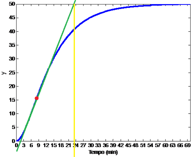 Sintonia pelo método baseado em curva de reação A gente sabe que o método da curva de reação pode ser aplicado quando a gente aplica uma variação na entrada do sistema e ele responde com uma curva com formato de S. Existem duas formas de aplicar o método da curva de reação: estimando τ e θ (da aproximação de 1º ordem com atraso) através da reta tangente ao ponto de inflexão da curva ou através de equações. Os dois métodos estimam valores parecidos, mas dificilmente os resultados serão iguais. O método da reta tangente ao ponto de inflexão consiste em encontrar, inicialmente, o ponto de inflexão da curva, ou seja, o ponto onde a curva muda de concavidade. Na figura abaixo ele está indicado pelo ponto vermelho. Depois de localizá-lo, basta passar a reta tangente a esse ponto e prolongá-la até o eixo X e até o valor de y correspondente ao estado estacionário (nesse exemplo o valor é 50). A distância entre o tempo 0 e ponto onde a reta tocou o eixo X é o valor do tempo morto, ou seja, θ = 1,5min (aproximadamente). Para encontrar τ, deve-se traçar uma reta até o eixo X referente ao ponto de encontro da reta tangente e o valor de y do estado estacionário (reta amarela). Nesse exemplo, o ponto onde ele tocou o eixo X menos o valor de θ corresponde à constante de tempo, logo θ = 23,5 – 1,5 = 22min. O outro método consiste em usar equações para aproximar θ e τ (método chamado de algoritmo de dois pontos). O intervalo da variável y é dividido em 3 partes iguais, nesse exemplo cada parte terá um valor de 50/3 = 16,7, logo, as retas mostradas em vermelho estão posicionadas aproximadamente sobre os valores 16,7 e 33,3. Basta encontrar os tempos correspondentes que o sistema levou para alcançar esses valores que são aproximadamente t1/3 = 8,5min e t2/3 = 16min. Basta aplicar agora as equações abaixo. 71,10 7,0 5,816 7,0 3/13/2 tt 216,44,03/1 t O ganho é o ultimo parâmetro e ele é encontrado do mesmo jeito para os dois métodos (neste exemplo estou supondo Δu = 10): 5 10 050 u y K Agora basta aplicar nas tabelas referentes às constantes. É trabalho braçal. Vou aplicar apenas na tabela de Ziegler-Nichols (slide 12 da apresentação de sintonia de controladores). Os parâmetros de Cohen-Coon estão no slide 13. Vou usar os valores de θ e τ obtidos pelas equações. 6097,0 216,4*5 71,10 2,12,1 K kp 4320,8216,4*22 i 1080,22/216,42/ d A questão também pediu para sintonizar considerando que o problema é do tipo servo e usando critério de erro integral IAE. O slide 23 dá as equações para kp, τi e τd para problemas do tipo servo, mas para usá-las é preciso preencher os valores das constantes A, B, ... e F, que estão na tabela do slide 24. Essas constantes vão depender do tipo de erro integral utilizado e neste caso a questão pediu IAE (3ª linha). Na prática, os critérios IAE e ITAE não apresentam muita diferença nos valores finais das constantes do controlador. Os controladores dos outros processos mostrados na questão são sintonizados do mesmo jeito. Sintonia pelo método da autossintonia Quando o método da curva de reação não é aplicável (o processo oscila antes de chegar no estado estacionário) é preciso lançar mão de algum método em malha fechada (ganho final ou autossintonia). Essa questão usa o método da autossintonia, porque a variável manipulada está sendo alternada em dois patamares para induzir o sistema a uma oscilação sustentada. Através do gráfico da variável controlada é possível extrair o período crítico (distância entre dois picos ou dois vales) e a amplitude da oscilação. A figura abaixo mostra a amplitude (a) e o período crítico (Tcr). A amplitude é a distância entre o ponto central da oscilação e um pico ou vale. Pelo gráfico a = 50 e Tcr = 39min (aproximadamente). Para estimar o outro parâmetro crítico (o ganho crítico Kcr), é necessário encontrar a amplitude da variável manipulada também. A figura abaixo mostra que h = 100. O Kcr é calculado com a seguinte equação: 55,2 50 10044 a h Kcr Agora que temos Tcr e Kcr, basta aplicar nas equações das constantes de Ziegler-Nichols (slide 33) ou Tyreus-Luyben (slide 34). Vou aplicar os parâmetros de Ziegler-Nichols: Kp = 0,6*Kcr = 0,6*2,55 = 1,53 τi = Tcr/2 = 39/2 = 19,5 τd = Tcr/8 = 39/8 = 4,88
