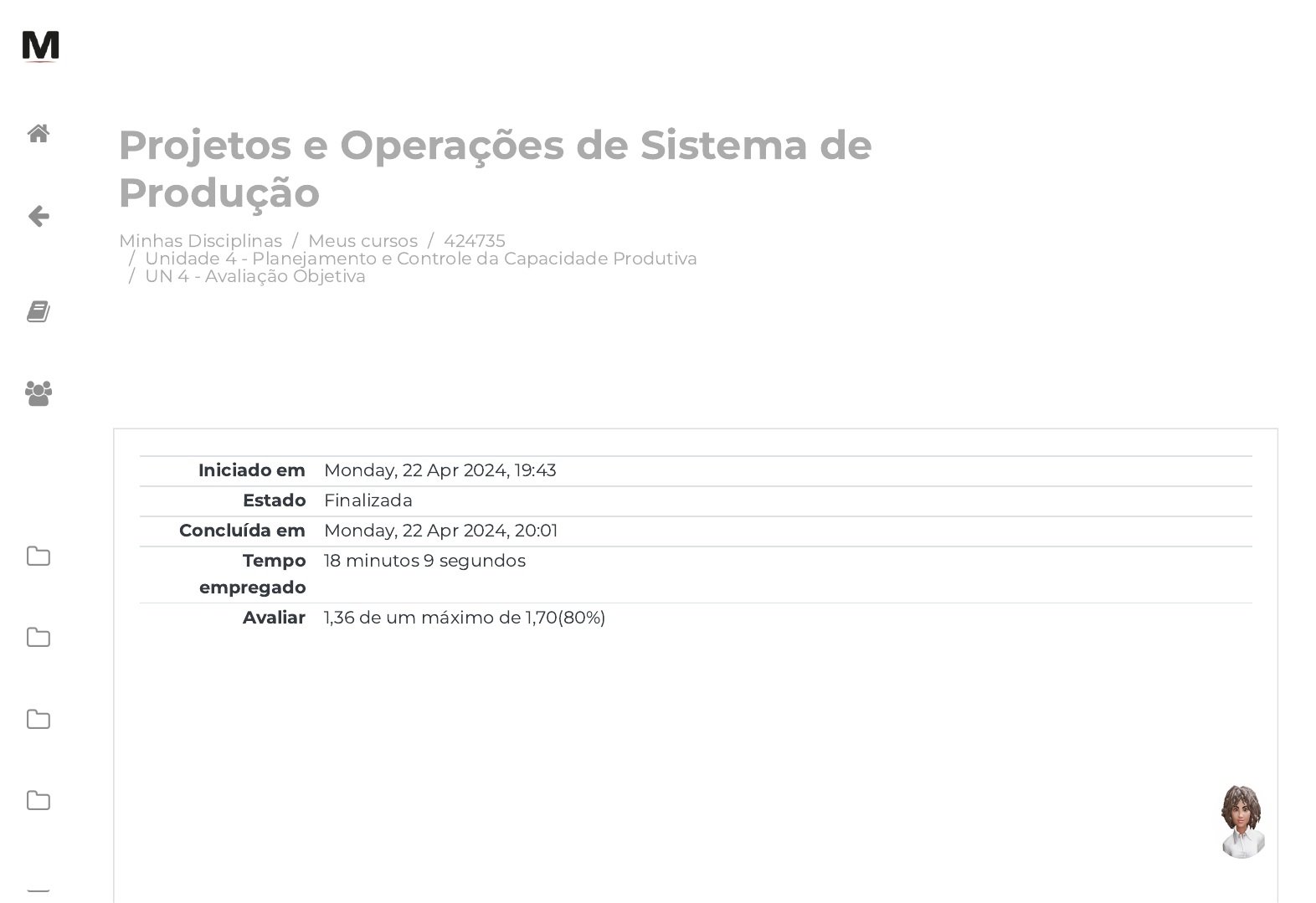 Minhas Disciplinas / Meus cursos / 424735 / Unidade 4 - Planejamento e Controle da Capacidade Produtiva / UN 4 - Avaliação Objetiva Projetos e Operações de Sistema de Produção Iniciado em Monday, 22 Apr 2024, 19:43 Estado Finalizada Concluída em Monday, 22 Apr 2024, 20:01 Tempo empregado 18 minutos 9 segundos Avaliar 1,36 de um máximo de 1,70(80%) https://avap.multivix.edu.br/my/ https://avap.multivix.edu.br/course/view.php?id=26529 https://avap.multivix.edu.br/course/view.php?id=26529§ion=5 https://avap.multivix.edu.br/mod/quiz/view.php?id=1643164 https://avap.multivix.edu.br/my/ https://avap.multivix.edu.br/course/view.php?id=26529 https://avap.multivix.edu.br/user/index.php?id=26529 https://avap.multivix.edu.br/course/view.php?id=26529§ion=1 https://avap.multivix.edu.br/course/view.php?id=26529§ion=2 https://avap.multivix.edu.br/course/view.php?id=26529§ion=3 https://avap.multivix.edu.br/course/view.php?id=26529§ion=4 https://avap.multivix.edu.br/course/view.php?id=26529§ion=5 https://avap.multivix.edu.br/ https://avap.multivix.edu.br/ https://avap.multivix.edu.br/ https://avap.multivix.edu.br/ https://avap.multivix.edu.br/ https://avap.multivix.edu.br/ https://avap.multivix.edu.br/ https://avap.multivix.edu.br/ https://avap.multivix.edu.br/ Questão 1 Correto Atingiu 0,34 de 0,34 Considere uma fábrica de panelas que trabalha 24 horas diárias, sete dias por semana, com 12 funcionários e: - demanda diária: 10; - horas de processo: 15 horas; - horas diárias por montadores: 12 horas; e - horas semanais disponíveis: 1.008 horas. Considerando estes dados, pode-se dizer que: I. A capacidade semanal disponível é de 672. II. A capacidade mensal disponível é de 2.600. III. Se aumentarmos a demanda diária para 15, teremos uma capacidade semanal de 1.000. Assinale a alternativa correta: Escolha uma opção: a. Somente a a�rmação III está correta. b. Somente a a�rmação I está correta. c. Todas as a�rmações estão corretas. https://avap.multivix.edu.br/ https://avap.multivix.edu.br/ https://avap.multivix.edu.br/ https://avap.multivix.edu.br/ https://avap.multivix.edu.br/ https://avap.multivix.edu.br/ https://avap.multivix.edu.br/ https://avap.multivix.edu.br/ https://avap.multivix.edu.br/ d. Somente a a�rmação II está correta. e. As a�rmações I e II estão corretas. https://avap.multivix.edu.br/ https://avap.multivix.edu.br/ https://avap.multivix.edu.br/ https://avap.multivix.edu.br/ https://avap.multivix.edu.br/ https://avap.multivix.edu.br/ https://avap.multivix.edu.br/ https://avap.multivix.edu.br/ https://avap.multivix.edu.br/ Questão 2 Correto Atingiu 0,34 de 0,34 Planejar a capacidade produtiva poderá fornecer informações que irão possibilitar uma maior viabilidade do planejamento. Sobre o planejamento da capacidade, considere as proposições: I. O planejamento da capacidade não depende da previsão de vendas da empresa, elaborada pelo departamento comercial. II. O planejamento da capacidade utiliza como entrada o plano mestre de produção para realizar veri�cações - se existe capacidade instalada para o atendimento das necessidades de produção. III. O planejamento da capacidade somente é feito após a programação da produção. IV. O planejamento da capacidade permitirá soluções de adequação a capacidade do que precisa ser produzido, como aquisição de máquinas, compra de equipamentos, contratação de mão de obra, entre outras questões. Escolha a alternativa correta. Escolha uma opção: a. As a�rmações II e IV estão corretas b. As a�rmações I e IV estão corretas. c. As a�rmações II e III estão corretas. d. Somente a a�rmação III está correta. e. As a�rmações III e IV estão corretas https://avap.multivix.edu.br/ https://avap.multivix.edu.br/ https://avap.multivix.edu.br/ https://avap.multivix.edu.br/ https://avap.multivix.edu.br/ https://avap.multivix.edu.br/ https://avap.multivix.edu.br/ https://avap.multivix.edu.br/ https://avap.multivix.edu.br/ Questão 3 Incorreto Atingiu 0,00 de 0,34 Planejar a capacidade produtiva tem sido fundamental para as empresas, devendo ser desenvolvida em paralelo com as atividades do planejamento e controle da produção na sua estrutura hierárquica. O termo capacidade é associado a algo estático, como capacidade e volume de uma caixa d’água, lotação de cinemas etc. Desta forma, a capacidade irá descrever o tamanho da operação. Escolha a alternativa que descreve o termo capacidade corretamente, considerando a capacidade de processamento. Escolha uma opção: a. A capacidade refere-se ao nível máximo de operação de valor agregado em um determinado período tempo, em que o processo poderá realizar-se em condições normais. b. A capacidade compreende o nível máximo de atividade, em que se considera o tamanho da operação. c. A capacidade é o maior nível de atividade de valor, sendo considerado o período de menor tempo possível em que o processo poderá ser realizado para maximizar a competitividade no mercado. d. A capacidade é o tamanho da operação, sendo considerado estritamente o nível de atividade. e. A capacidade é o máximo de atividade da operação. https://avap.multivix.edu.br/ https://avap.multivix.edu.br/ https://avap.multivix.edu.br/ https://avap.multivix.edu.br/ https://avap.multivix.edu.br/ https://avap.multivix.edu.br/ https://avap.multivix.edu.br/ https://avap.multivix.edu.br/ https://avap.multivix.edu.br/ Questão 4 Correto Atingiu 0,34 de 0,34 As medidas de capacidade devem seguir além da demanda do empreendimento, o seu ramo de atividade ou se vamos usar medidas de produção ou de insumos, conforme suas características. Sobre isso, considere as seguintes a�rmações: I. As siderurgias usam medidas de insumo por adotar como medida de capacidade toneladas de aço/mês. II. Os hotéis, por prestarem serviços e não produzirem bens, adotam medidas de insumo para medir a capacidade, considerando quantidade de quarto