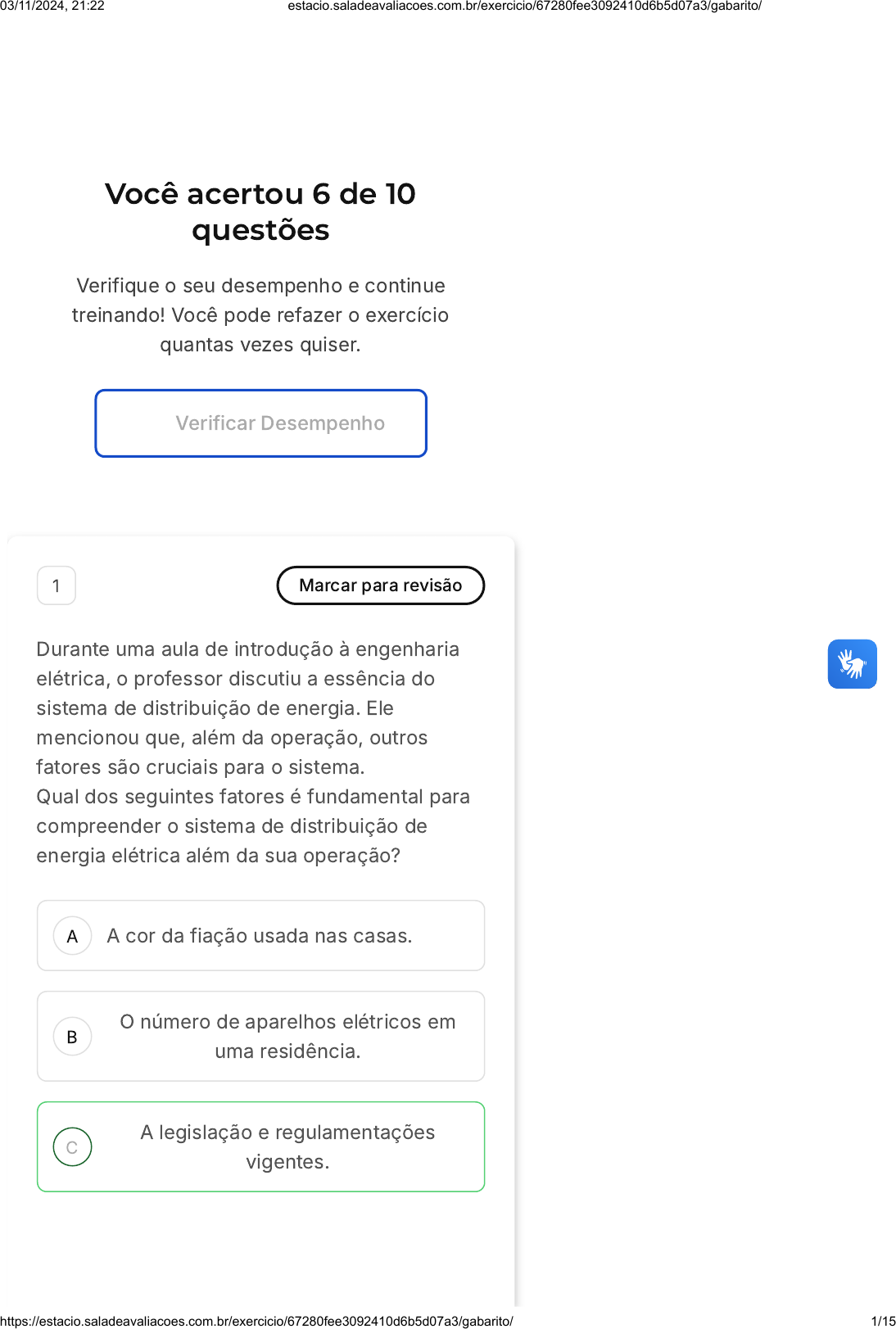 Você acertou 6 de 10 questões Verifique o seu desempenho e continue treinando! Você pode refazer o exercício quantas vezes quiser. Verificar Desempenho A B C 1 Marcar para revisão Durante uma aula de introdução à engenharia elétrica, o professor discutiu a essência do sistema de distribuição de energia. Ele mencionou que, além da operação, outros fatores são cruciais para o sistema. Qual dos seguintes fatores é fundamental para compreender o sistema de distribuição de energia elétrica além da sua operação? A cor da fiação usada nas casas. O número de aparelhos elétricos em uma residência. A legislação e regulamentações vigentes. 03/11/2024, 21:22 estacio.saladeavaliacoes.com.br/exercicio/67280fee3092410d6b5d07a3/gabarito/ https://estacio.saladeavaliacoes.com.br/exercicio/67280fee3092410d6b5d07a3/gabarito/ 1/15 D E A marca dos transformadores utilizados. O tipo de lâmpada usada na iluminação pública. Resposta correta Parabéns, você selecionou a alternativa correta. Confira o gabarito comentado! Gabarito Comentado Para uma compreensão completa do sistema de distribuição de energia elétrica, não basta apenas conhecer sua operação. É indispensável estar ciente da legislação e regulamentações vigentes que orientam e controlam o funcionamento deste sistema. Estas leis e regulamentos garantem que a energia seja distribuída de maneira eficaz, segura e justa para todos os consumidores. 2 Marcar para revisão Em uma palestra sobre engenharia elétrica, o palestrante abordou a complexidade do sistema de distribuição de energia. Ele destacou que, além dos aspectos técnicos, é fundamental entender as bases que sustentam esse sistema. Qual componente é fundamental para sustentar o sistema de distribuição de energia elétrica, além das questões puramente técnicas? 03/11/2024, 21:22 estacio.saladeavaliacoes.com.br/exercicio/67280fee3092410d6b5d07a3/gabarito/ https://estacio.saladeavaliacoes.com.br/exercicio/67280fee3092410d6b5d07a3/gabarito/ 2/15 A B C D E A habilidade de desenhar circuitos elétricos. A legislação básica vigente no setor energético. A capacidade de instalar tomadas elétricas. O conhecimento sobre tipos de lâmpadas. A habilidade de escolher cores para fios elétricos. Resposta correta Parabéns, você selecionou a alternativa correta. Confira o gabarito comentado! Gabarito Comentado O sistema de distribuição de energia elétrica é sustentado não apenas por aspectos técnicos, mas também pela legislação básica vigente. Esta legislação estabelece regras, diretrizes e padrões que garantem a operação segura, eficiente e equitativa do sistema, protegendo os direitos dos consumidores e assegurando a entrega adequada de energia. 3 Marcar para revisão 03/11/2024, 21:22 estacio.saladeavaliacoes.com.br/exercicio/67280fee3092410d6b5d07a3/gabarito/ https://estacio.saladeavaliacoes.com.br/exercicio/67280fee3092410d6b5d07a3/gabarito/ 3/15 A B C D E Analise as seguintes afirmativas considerando a classificação das unidades consumidoras segundo a Resolução Normativa 414/2010 da ANEEL. I. Qualquer unidade consumidora de energia elétrica será classificada em um dos dois grupos: A (alta tensão) ou B (baixa tensão). II. As unidades consumidoras rurais são enquadradas no grupo denominado de baixa tensão. III. O que define as unidades consumidoras como grupo de alta tensão é o recebimento de tensão superior a 2,3 quilovolts �KV) ou o atendimento a partir de sistema subterrâneo de distribuição em tensão secundária, caracterizado pela tarifa binômia. Está CORRETO o que se afirma em: I, apenas. I e II, apenas. II e III, apenas. I, II e III. I e III Resposta incorreta Opa! A alternativa correta é a letra B. Confira o gabarito comentado! Gabarito Comentado As afirmações I e II estão corretas. De acordo com a Resolução Normativa 414/2010 da ANEEL, todas as unidades 03/11/2024, 21:22 estacio.saladeavaliacoes.com.br/exercicio/67280fee3092410d6b5d07a3/gabarito/ https://estacio.saladeavaliacoes.com.br/exercicio/67280fee3092410d6b5d07a3/gabarito/ 4/15 A B C consumidoras de energia elétrica são classificadas em dois grupos: A (alta tensão) ou B (baixa tensão). Além disso, as unidades consumidoras rurais são enquadradas no grupo B, ou seja, de baixa tensão. A afirmação III está incorreta, pois a definição de alta tensão não se limita ao recebimento de tensão superior a 2,3 KV ou ao atendimento a partir de sistema subterrâneo de distribuição em tensão secundária. Portanto, as afirmações corretas são I e II, apenas. 4 Marcar para revisão De acordo com a Resolução nº 414, de 2010, a distribuidora deve respeitar alguns direitos do consumidor: 1. Receber orientações sobre como funciona a rede elétrica, para poder realizar pequenos reparos. 2. Quatro horas para religamento do serviço após ser informada de interrupção, para religação de urgência de unidade consumidora. 3. O consumidor deve ser informado por meio da fatura de ajustes tarifários. Assinale a alternativa que indica todas as afirmativas corretas. É correta apenas a afirmativa 2. São corretas apenas as afirmativas 1 e 2. São corretas apenas as afirmativas 1 e 3. 03/11/2024, 21:22 estacio.saladeavaliacoes.com.br/exercicio/67280fee3092410d6b5d07a3/gabarito/ https://estacio.saladeavaliacoes.com.br/exercicio/67280fee3092410d6b5d07a3/gabarito/ 5/15 D E São corretas apenas as afirmativas 2 e 3. São corretas as afirmativas 1, 2 e 3. Resposta incorreta Opa! A alternativa correta é a letra D. Confira o gabarito comentado! Gabarito Comentado A alternativa correta é a letra D, que afirma que apenas as afirmativas 2 e 3 estão corretas. A afirmativa 1 está incorreta, pois, de acordo com a Resolução nº 414, de 2010, não é um direito do consumidor receber instruções com o intuito de realizar reparos na rede elétrica. Portanto, as afirmativas 2 e 3, que tratam do prazo para religamento do serviço e da obrigatoriedade d