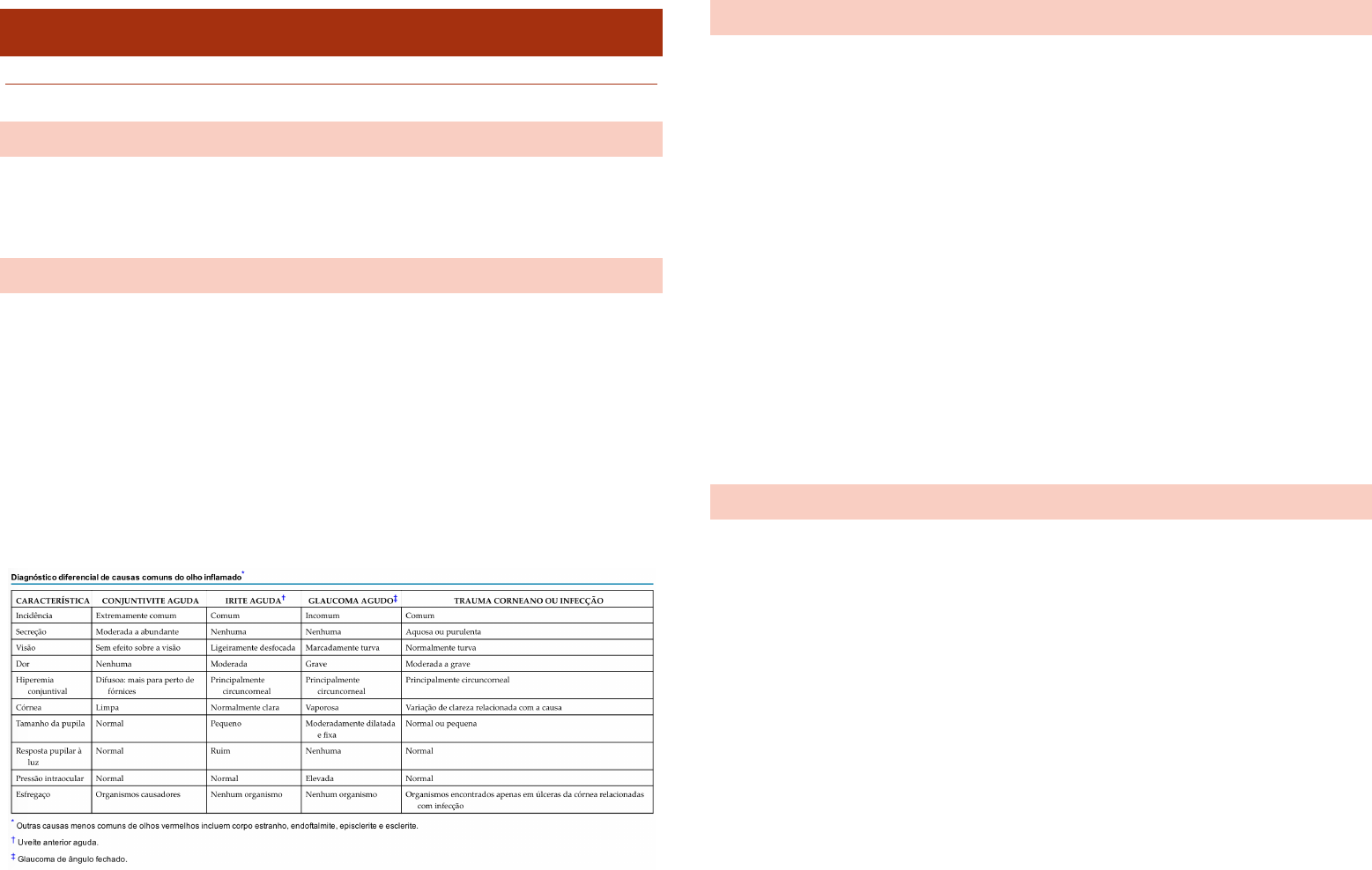 MARC 13 – SÍNDROME DO OLHO VERMELHO PEDRO BONALDI BRITTO NILO ARAUJO DEFINIÇÃO v Síndrome caracterizada por olho vermelho, que se apresenta como uma das condições oftalmológicas mais comuns no atendimento primário. PRINCIPAIS CAUSAS v Conjuntivite v Episclerite v Esclerite v Glaucoma de ângulo fechado v Uveíte v Endoftalmite v Celulite v Olhos secos v Blefarite v Hemorragia subconjuntival UVEÍTE v É a inflamação de qualquer parte ou partes do trato uveal (íris, corpo ciliar e coroide). v Pode ser chamada de uveíte (anterior ou posterior), irite, iridociclite ou coroidite. v A inflamação é crônica e raramente é encontrada uma causa. v Clínica: o Olhos vermelhos o Diminuição da visão o Fotofobia v Fatores de risco: o Artrite reativa (principal) o 25% dos pacientes com espondilite anquilosante o 2 a 12% dos pacientes com DII o Artrite psoriática v Tratamento: o Acetato de prednisolona colírio 1%, uma gota em cada olho acometido a cada 1-6h ENDOFTALMITE v É uma inflamação extensa dentro do olho de qualquer natureza. v A maioria dos casos de endoftalmite envolve uma solução de continuidade na parede do olho (córnea e esclera), associada a qualquer traumatismo acidental ou procedimento cirúrgico. v Clínica: o Diminuição da visão o Olhos vermelhos o Dor ocular de moderada a intensa v O diagnóstico é estabelecido por amostragem de fluido da câmara anterior ou líquido, de preferência do vítreo, e avaliação do fluido por coloração de gram e cultura. v Tratamento: o Colírio antibiótico: Vancomicina 1mg/0,1ml e ceftazidima 2,25mg/0,1ml o Corticoide colírio CONJUNTIVITE, BLEFARITE E OLHO SECO v Tratamento: o Conjuntivite alérgica: • Tratamento imediato: Colírio de nafazolina 4 vezes ao dia durante a estação alérgica ou levocabastina 4 vezes ao dia • Tratamento a longo prazo: cromoglicato dissódico a 2 a 4% 4 vezes ao dia durante a estação alérgica ou alopatadina 2 vezes ao dia durante a estação alérgica o Conjuntivite viral: • Tratamento sintomático e conservador com compressa fria • É autolimitada o Conjuntivite bacteriana: • Pomada de eritromicina tópica 3 vezes ao dia durante duas semanas o Conjuntivite por clamídia: • Eritromicina 500mg VO de 6/6h por 7 dias ou azitromicina 1g de 12/12h por 7 dias o Blefarite: • Pomada oftálmica bacitracina ou eritromicina • Antibiótico sistêmico se evidencia de inflamação da córnea ou conjuntiva: minociclina 50-10mg ou doxicilina 100mg uma vez por dia; tetraciclina 250mg de 12/12h; eritromicina 250mg de 8/8h o Olho seco • Lágrima artificial de baixa viscosidade: polietileno glicol 400 0,4% (tendem a não borrar a visão, porém são menos eficazes) • Lágrima artificial de alta viscosidade: carboximetilcelulose de sódio (tendem a borrar a visão, porém são mais eficazes) • Se falha no tratamento à oclusão dos pontos lacrimais com plugs ou oclusão cirúrgica para reter as lágrimas produzidas CELULITE v Celulite pré-septal é uma inflamação dos tecidos moles da pálpebra anterior ao septo orbital. v O septo orbital divide os tecidos moles da pálpebra dos tecidos moles da órbita. v O tecido orbital é mais suscetível a danos pela inflamação do que o pré-septal. v Clínica: o Inchaço dos tecidos moles o Hiperemia conjuntival o Quemose (edema da conjuntiva) v Tratamento: o Clavulin 500mg + 125mg VO de 8/8h por 10 dias o Bactrim 400mg + 80mg VO de 12/12h em casos suspeito de MRSA GLAUCOMA DE ÂNGULO FECHADO v Pode ocorrer ao longo de um curto período e causar sintomas debilitantes. v Os fatores de risco para o glaucoma de ângulo fechado baseiam-se na configuração anatômica dos componentes da câmara anterior. v Pessoas hipermetropes têm um eixo anteroposterior do olho reduzido e câmara anterior rasa. v Quando a íris periférica entra em contato com a córnea posterior, o ângulo da câmara anterior é subitamente ocluído. v Clínica: o Dor extrema que pode ser mal localizada o Náuseas o Vômitos (podem ser persistentes e causar dor abdominal) v Tratamento: o Colírio de timolol 0,5% + acetazolamida 500mg VO + criação de fístula na íris periférica com laser (iridectomia com YAG laser) entre a câmara posterior e a câmara anterior para vencer a obstrução o Requer iridectomia a laser profilática no segundo olho para prevenir glaucoma de ângulo fechado HEMORRAGIA SUBCONJUNTIVAL v Também chamada de hiposfagma, decorre do sangramento de vasos da conjuntiva e/ou da episclera para o espaço subconjuntival. v Isso pode ocorrer em função do aumento da fragilidade vascular desses vasos, do aumento intravascular ou trauma v Clínica: o Assintomática o O paciente só percebe ao se olhar no espelho e notar uma faixa vermelha na região da esclera v Sinal de alarme: o Dor o Diminuição da visão o Trauma associado v O diagnóstico é clínico e deve ser realizado uma fundoscopia para descartar hemorragia retiniana associada e busca de HAS v Tratamento: o Colírio de nafazolina ou fenilefrina o Orientar controle da PA o Possui resolução espontânea em até duas semanas o Se desconforto ocular à carmelose sódica 0,5% 1 gota de 6/6h o Compressa gelada de 6/6h ESCLERITE v É a inflamação da esclera. v Cerca de 50% dos pacientes possuem alguma doença sistêmica associada, como artrite reumatoide, LES, espondilite anquilosante, DII, entre outras. v Clínica: o Dor ocular intensa e contínua que pode irradiar para fronte, sobrancelha ou mandíbula o Inicio gradual ou agudo o Diminuição da visão o Olhos vermelhos v O diagnóstico é clínico e deve-se procurar outros sinais associados v Tratamento: o Ibuprofeno 400-600mg VO de 6/6h o Naproxeno 500mg VO de 6/6h o Predsim® 60-100mg VO de 24/24h por 1 semana, seguido de 20mg de 24/24h por 2-3 semanas e prosseguir com desmame gradual o Se falha à terapia imunossupressora com MTX 7,5- 15mg/semana, com ajuste e tempo de uso de acordo com a clínica o Em caso de associação com policondrite recidi