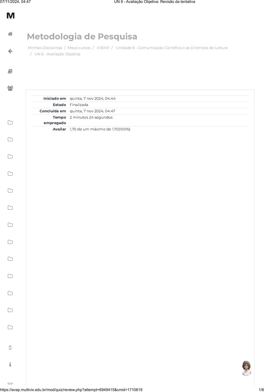 Minhas Disciplinas / Meus cursos / 413047 / Unidade 6 - Comunicação Cientí�ca e as Diretrizes de Leitura / UN 6 - Avaliação Objetiva Metodologia de Pesquisa Iniciado em quinta, 7 nov 2024, 04:44 Estado Finalizada Concluída em quinta, 7 nov 2024, 04:47 Tempo empregado 2 minutos 24 segundos Avaliar 1,70 de um máximo de 1,70(100%) 07/11/2024, 04:47 UN 6 - Avaliação Objetiva: Revisão da tentativa https://avap.multivix.edu.br/mod/quiz/review.php?attempt=6949415&cmid=1710619 1/6 https://avap.multivix.edu.br/my/ https://avap.multivix.edu.br/course/view.php?id=29098 https://avap.multivix.edu.br/course/view.php?id=29098§ion=7 https://avap.multivix.edu.br/mod/quiz/view.php?id=1710619 https://avap.multivix.edu.br/my/ https://avap.multivix.edu.br/course/view.php?id=29098 https://avap.multivix.edu.br/user/index.php?id=29098 https://avap.multivix.edu.br/course/view.php?id=29098§ion=1 https://avap.multivix.edu.br/course/view.php?id=29098§ion=2 https://avap.multivix.edu.br/course/view.php?id=29098§ion=3 https://avap.multivix.edu.br/course/view.php?id=29098§ion=4 https://avap.multivix.edu.br/course/view.php?id=29098§ion=5 https://avap.multivix.edu.br/course/view.php?id=29098§ion=6 https://avap.multivix.edu.br/course/view.php?id=29098§ion=7 https://avap.multivix.edu.br/course/view.php?id=29098§ion=8 https://avap.multivix.edu.br/course/view.php?id=29098§ion=9 https://avap.multivix.edu.br/course/view.php?id=29098§ion=10 https://avap.multivix.edu.br/course/view.php?id=29098§ion=11 https://avap.multivix.edu.br/course/view.php?id=29098§ion=12 https://avap.multivix.edu.br/course/view.php?id=29098§ion=13 https://avap.multivix.edu.br/hooks/portal/ https://avap.multivix.edu.br/mod/page/view.php?id=1252%2F%22%20target%3D%22_blank https://avap.multivix.edu.br/calendar/view.php/ https://avap.multivix.edu.br/ https://avap.multivix.edu.br/ https://avap.multivix.edu.br/ https://avap.multivix.edu.br/ https://avap.multivix.edu.br/ https://avap.multivix.edu.br/ https://avap.multivix.edu.br/ Questão 1 Correto Atingiu 0,34 de 0,34 Após realizado o seu trabalho de coleta, análise e interpretação dos dados, o pesquisador irá redigir o seu trabalho, escrevendo e defendendo a própria pesquisa. Diante do trabalho de redação �nal, ele deve não só despojar-se de preconceitos como alimentar-se de sentimentos de humildade e de amor à verdade, traduzidos concretamente no empenho pela objetividade. Não deve, pois, forçar sua pesquisa para que ela chegue a conclusões preconcebidas. O espírito cientí�co se manifesta pelo respeitoso acolhimento das conclusões a que a pesquisa chega por si só, objetiva e documentadamente. RUIZ, João Álvaro. Metodologia cientí�ca. 3. ed. São Paulo: Atlas, 1996 – Adaptada. Marque V para as a�rmativas verdadeiras e F para as a�rmativas falsas. ( ) A comunicação cientí�ca não é limitada em sua extensão, ou seja, não tem de�nição de tamanho mínimo ou máximo. ( ) A comunicação não necessita de abundância de aspectos analíticos; basta que a experiência, as ideias ou a teoria sejam bem fundamentadas. ( ) O texto das comunicações, como nas teses cientí�cas, permite ao leitor reproduzir as experiências e obter os mesmos resultados, veri�car os resultados da análise ou julgar as conclusões do autor. ( ) O emprego adequado de uma terminologia técnica é de grande valia para a transmissão de conhecimento entre os pesquisadores. ( ) Numa redação cientí�ca, é permitido o uso de termos em sentido �gurado. ( ) O pesquisador-redator não deve confundir a linguagem cientí�ca com a literatura: esta última deve esclarecer pela força dos argumentos e tem por nota distintiva a objetividade enquanto a primeira deve impressionar, agradar pela elegância e pela evocação de valores estéticos. Assinale a alternativa com a sequência correta: Escolha uma opção: V, F, V, F, V, V F, F, V, V, F, V F, F, F, V, F, V F, V, F, V, F, F V, V, V, F, F, V 07/11/2024, 04:47 UN 6 - Avaliação Objetiva: Revisão da tentativa https://avap.multivix.edu.br/mod/quiz/review.php?attempt=6949415&cmid=1710619 2/6 https://avap.multivix.edu.br/my/ https://avap.multivix.edu.br/course/view.php?id=29098 https://avap.multivix.edu.br/user/index.php?id=29098 https://avap.multivix.edu.br/course/view.php?id=29098§ion=1 https://avap.multivix.edu.br/course/view.php?id=29098§ion=2 https://avap.multivix.edu.br/course/view.php?id=29098§ion=3 https://avap.multivix.edu.br/course/view.php?id=29098§ion=4 https://avap.multivix.edu.br/course/view.php?id=29098§ion=5 https://avap.multivix.edu.br/course/view.php?id=29098§ion=6 https://avap.multivix.edu.br/course/view.php?id=29098§ion=7 https://avap.multivix.edu.br/course/view.php?id=29098§ion=8 https://avap.multivix.edu.br/course/view.php?id=29098§ion=9 https://avap.multivix.edu.br/course/view.php?id=29098§ion=10 https://avap.multivix.edu.br/course/view.php?id=29098§ion=11 https://avap.multivix.edu.br/course/view.php?id=29098§ion=12 https://avap.multivix.edu.br/course/view.php?id=29098§ion=13 https://avap.multivix.edu.br/hooks/portal/ https://avap.multivix.edu.br/mod/page/view.php?id=1252%2F%22%20target%3D%22_blank https://avap.multivix.edu.br/calendar/view.php/ https://avap.multivix.edu.br/ https://avap.multivix.edu.br/ https://avap.multivix.edu.br/ https://avap.multivix.edu.br/ https://avap.multivix.edu.br/ https://avap.multivix.edu.br/ https://avap.multivix.edu.br/ Questão 2 Correto Atingiu 0,34 de 0,34 Após a realização da coleta, análise e interpretação dos dados, Maria, que está realizando um trabalho acadêmico, se lembra de algumas orientações sobre a redação e defesa de sua pesquisa. Conforme Ruiz (1986) o espírito cientí�co se manifesta pelo respeitoso acolhimento das conclusões a que a pesquisa chega por si só, objetiva e documentadamente. Dessa forma, quais atitudes Maria deve adotar durante a redação de seu trabalho? a. Redigir o trabalho sem se preocupar com a verdade, foc
