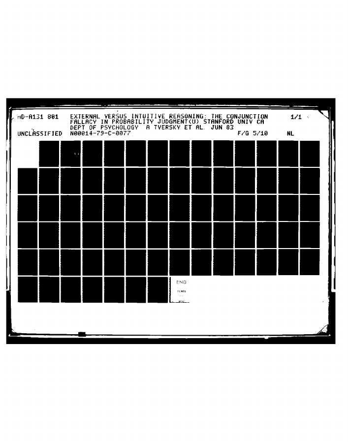 riD Risi 801 EXTERNAL VERSUS INTUITIVE REASONING THE CONJUNCTION i/i FALLACY IN PROBABILITY JUDGMENT(U) STANFORD UNIV CA DEPT OF PSYCHOLOGY A TVERSKY ET AL. JUN 03 UNCLAhSSIFIED N00014-79-C-0077 F/G 5/10 NL EEmhomhomEoiI smohEEEEEmhEE EhEEEEohEEEEEI EIEIIEEEEEEII mIIIIIEEEIIEI *flflflflfllllll J L " , • -8; ,. , % % . • - . . .- .. . . . . -'. .. ,-. - . .. . ,- • . .- . . -.- . .. . . .. ,a ' . -- .. . . a ' ".-. 1.2 LA 1. MIRCP RSLTO TS HR HAOA BRA f-TNADS16- -'A a-, SECURITY CLASSIFICATION OF THIS PAGE (flm 0 DM8 Ea000 REPORT DOCUMENTATION PAGE BEFORE COPLETcG oRm 1. REPORT NUMBEAcC NUMBER 4. TITLE (and Subtitle) S. TYPE Or REPORT a PERIOD COVERED Extensional vs. Intuitive Reasoning: The Technical Report Conjunction Fallacy in Probability Judgment S PERFORMING ONG. REPORT NUMBER 7. AUTHOR(&) 8. CONTRACT OR GRANT NUMBER(@) Amos Tversky and Daniel Kahneman N00014-79-C-0077 NR 197-058 S. PERFORMING ORGANIZATION NAME AND ADDRESS 10. PROGRAM ELEMENT. PROJECT TASK AREA & WORIK UNIT NUMBERS Department of Psychology Stanford University Stanford, CA 94305 11. CONTROLLING OFFICE NAME AND ADDRESS I2. REPORT DATE Office of Naval Research June 1983 800 North Quincy Street IS. NUMBER OF PAGES Arlington, VA 22217 "65 "7 14. MONITORING AGENCY NAME & ADDRESS(lE different froni Controlling O111e) IS. SECURITY CLASS. (of tlls tepat)ltunclassified IS&. IC ATIONIDOWNGRADING IS. OISTRIBUTION STATEMENT (o, this Rpor) - - n c! 17. DISTRIBUTION STATEMENT (of the abstract entered In Block 30. II dlffereni iem Repawl) IS. SUPPLEMENTARY NOTES IS. KEY WORDS (Cont n leverse aide if necee y and Identif , I beak iwail,) subjective probability, availability, representativeness, causality, natural assessments, scenario, cognitive illusions 20. AEorIIACT (Continue an revere* side If neesy and identi y 7 block numbbe) Perhaps the simplest and the most basic qualitative law of probability 8is the conjunction rule: the probability of a conjunction P(A&R) cannot exceed the probabilities of its constituents, P(A) and P(B), because the extension (or the possibility set) of the conjunction is included in the extension of its constituents. Judgments under uncertainty, however, are Uoften mediated by intuitive heuristics that are not bound by the conjunction rule. A conjunction can be more representative than one of its constituents - DO I F 1473 EDITION OiF I NOV 65 IS OBSOLETE unclassified S/N 0 102- LF. 014- 6601 SECURITY CLASSIFICATION OF THIS PAGE (When Data lteSd) 83 08 17 002 c .UCLISAUOFd PAOS t= Dam ,.OS@ \and instances of a specific category can be easier to imagine or retrieve than instances of a more inclusive category. The representativeness and availability heuristics therefore can make a conjunction appear more probable than one of its constituents. This phenomenon is demonstrated in a variety of contexts including estimation of word frequency, personal- ity judgment, medical prognosis, decision under risk, suspicion of criminal acts and political forecasting. Systematic violations of the ,1 conjunction rule are observed in Judgments of lay people and of experts in both between-subjects and within-subjects comparisons. Alternative interpretations of the conjunction fallacy are discussed attempts to combat it are explored. Accession For INTIS GA& DTIC TAB UnannoanQ P 1 Justificaio By DIstrjbut i. on/ %Availability oetY Codes Av 117ad/or- 1st Special *S/N 0102- LIL 014. "at* IN AUU ashm unclassified r" • .°. . ...... .. Psychological Review, forthcoming, 1983. Extensional vs. Intuitive Reasoning: The Conjunction Fallacy in Probability Judgment Amos Tversky Daniel Kahneman Stanford University The University of British Columbia Short title: Probability Judgment This research was supported by Grant NR 197-058 from the Office of Naval Research. We are grateful to friends and colleagues, too numerous to list by name, for useful comments and suggestions based on an earlier draft. Department of Psychology Stanford University Stanford, California 94305 & . S * . - . . , a --- *S**. .. .....,.'..... ............. o............................ .. . Abstract Perhaps the simplest and the most basic qualitative law of probability is the conjunction rule: the probability of a conjunction P(A&B) cannot exceed the probabilities of its constituents, P(A) and P(B), because the extension (or the pos- sibility set) of the conjunction is included in the extension of its constituents. Judgments under uncertainty, however, are often mediated by intuitive heuristics that are not bound by the conjunction rule. A conjunction can be more represen- tative than one of its constituents and instances of a specific category can be easier to imagine or retrieve than instances of a more inclusive category. The representativeness and availability heuristics therefore can make a conjunction appear more probable than one of its constituents. This phenomenon is demon- strated in a variety of contexts including estimation of word frequency, personal- ity judgment, medical prognosis, decision under risk, suspicion of criminal acts and political forecasting. Systematic violations of the conjunction rule are observed in judgments of lay people and of experts in both between-subjects and within-subjects comparisons. Alternative interpretations of the conjunction fal- lacy are discussed and attempts to combat it are explored. .".-.-.%-...- .. . -...... %-.. -% •o.... . .. ......... ...- .-..... ........-... .. -.. , 'b!~A . - . A X, . h - J . AV -i" ww Probability Judgment 1 Uncertainty is an unavoidable aspect of the human condition. Many significant choices must be based on beliefs about the likelihood of such uncertain events as the guilt of a defendant, the result of an election, the future value of *" the dollar, the outcome of a medical operation or the response of a friend. Because we normally do not have adequate formal models for computing the pro- babilities of such events, intuitive judgment is often the only practical method :. for ass
