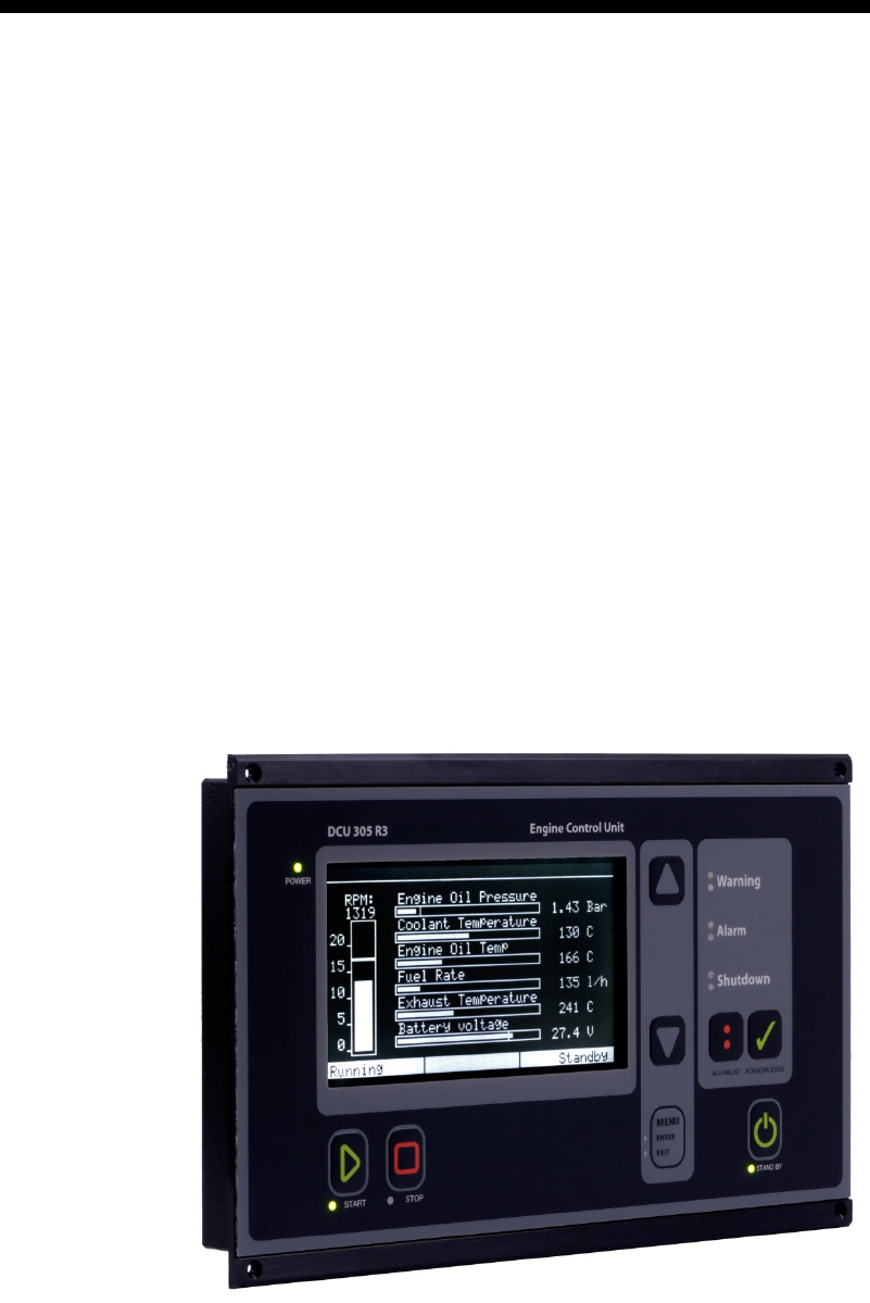 Auto-Maskin Installation Manual DCU 305 R3 DCU 305 R3 LT Diesel Engine Control Unit About this manual • ii Page 3 (44) Content Document information ......................................................................... 5 Introduction .......................................................................................... 6 ABOUT THIS MANUAL ....................................................................................................................... 6 ABOUT THE DCU 305 R3 AND DCU 305 R3 LT ............................................................................... 6 CLASSIFIED SYSTEM ....................................................................................................................... 7 SYSTEM OVERVIEW ........................................................................................................................ 8 CONFIGURATION OVERVIEW ............................................................................................................. 9 TECHNICAL SPECIFICATIONS............................................................................................................ 9 Cable connection ............................................................................... 11 IN GENERAL ................................................................................................................................. 11 GROUNDING ................................................................................................................................ 11 CONNECTION ORDER .................................................................................................................... 11 POWER SUPPLY ........................................................................................................................... 13 START- AND STOP RELAY OUTPUTS ............................................................................................... 13 PICKUP SENSORS ......................................................................................................................... 14 SWITCH INPUT CHANNELS ............................................................................................................. 14 ANALOGUE INPUT CHANNELS ........................................................................................................ 16 J1939 CAN CONNECTIONS ........................................................................................................... 18 MISCELLANEOUS CONNECTIONS ..................................................................................................... 20 THE AUTOMATIC FUSES ON THE RK-66 MODULE .............................................................................. 21 BACKUP SYSTEM CONFIGURATION .................................................................................................. 22 BUILT-IN ALARMS ......................................................................................................................... 24 ADJUSTING THE LCD SCREEN ....................................................................................................... 25 OVERSPEED TEST ........................................................................................................................ 26 Optional expansion modules ............................................................ 27 RELAY UNIT MK-14 ...................................................................................................................... 27 ANALOGUE UNIT AK-6 .................................................................................................................. 30 Communication .................................................................................. 32 PROTOCOL AND PIN-CONFIGURATION.............................................................................................. 32 MULTIDROP COMMUNICATION ........................................................................................................ 33 RETRIEVE THE LOG TO A PC .......................................................................................................... 34 Schematic Drawings .......................................................................... 35 Page 4 (44) SAMPLE SCHEMATIC PAGE 1 ......................................................................................................... 35 SAMPLE SCHEMATIC PAGE 2 ......................................................................................................... 36 OPTIONAL RELAY UNIT MK-14 ...................................................................................................... 37 OPTIONAL ANALOGUE UNIT AK-6 .................................................................................................. 38 CABLE SPECIFICATION .................................................................................................................. 38 Wire Terminal Tables ......................................................................... 40 RK-66 WIRE TERMINAL UNIT .......................................................................................................... 40 RELAY UNIT MK-14 ...................................................................................................................... 42 ANALOGUE UNIT AK-6 .................................................................................................................. 43 Page 5 (44) Document information Document revisions Date Revision July 2005 Created November 2007 July 2014 Minor adaptations for firmware 6.53 and onwards, because a new menu layout. DCU 305 R3 LT included, picture updates Copyright © Auto-Maskin AS, 2014 Information given in this document may change without prior notice. This document should not be copied without written permission from Auto-Maskin. All trademarks acknowledged. Related documents � DCU 305 R3 & R3 LT User’s Manual � DCU 305 R3 & R3 LT Communication Manual. � RSP 305 Remote Panel. � Rudolf R3 User’s