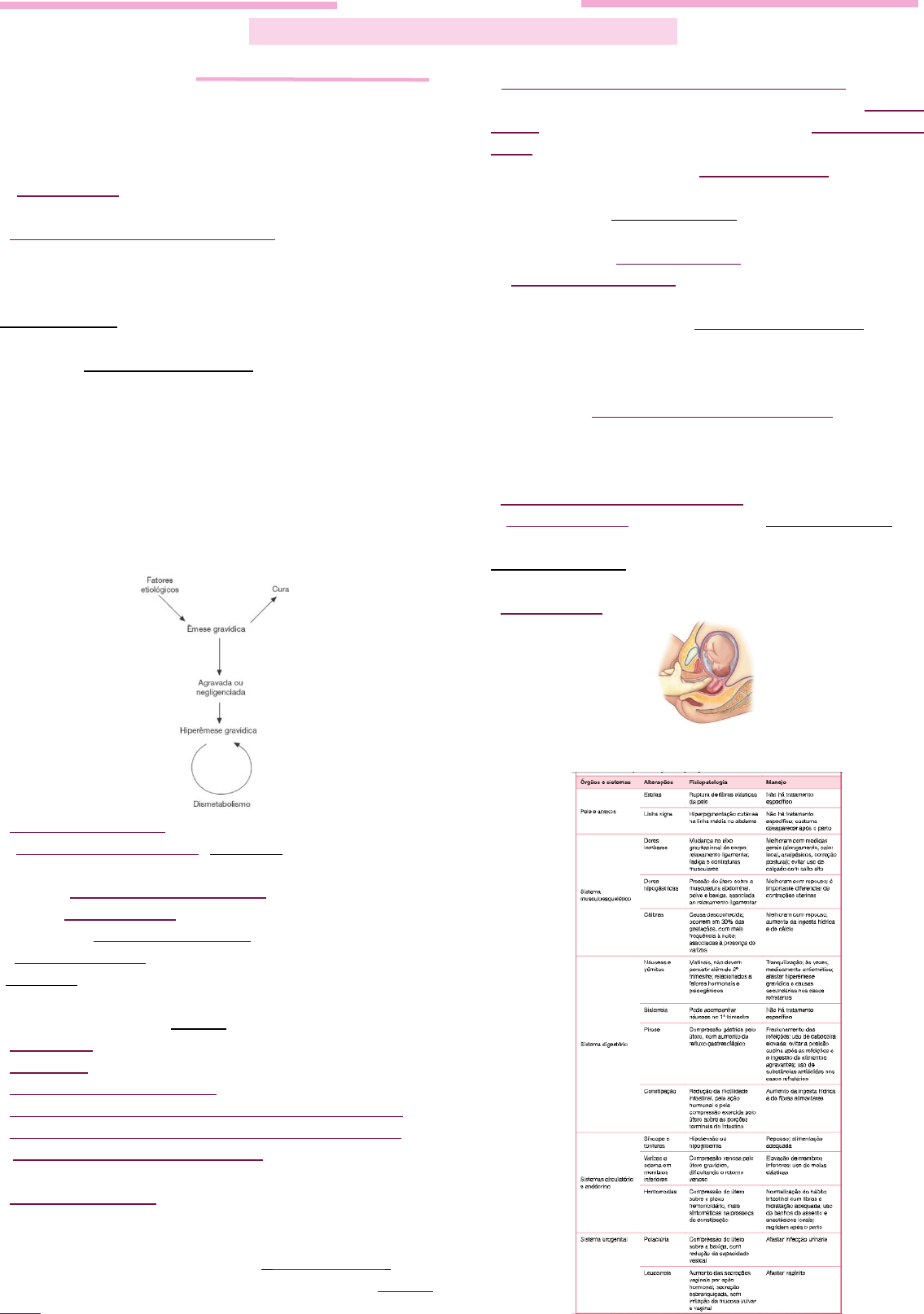 PROBLEMA 1 – PARTE 1 DIAGNÓSTICO DA GRAVIDEZ sinais da gravidez CADERNO 32 DO MINISTÉRIO DA SAÚDE ROTINAS EM OBSTETRÍCIA, FREITAS OBSTETRÍCIA FUNDAMENTAL, REZENDE Sinais e sintomas de presunção de gravidez - Amenorreia: atraso menstrual -> sinal mais precoce (4sem); - Náuseas, vômitos e tonturas (1°trim): sintomas comuns do início da gestação que podem melhorar com mudanças alimentares e remédios, mais de 50% das mulheres sentem náusea no começo da gestação, geralmente matinais. A êmese gravídica caracteriza-se por vômitos simples do início da gravidez; Cuidado! Hiperêmese gravídica: condição patológica caracterizada por vômitos contínuos, incoercíveis e intensos que impedem a alimentação da gestante, ocasiona desidratação, oligúria, perda de peso e transtornos metabólicos, com alcalose. Aspectos emocionais e alterações hormonais (estrog, progest e HCG) são apontados como causadores do transtorno que pode estar associado a outras condições. A ingestão de bebidas geladas melhora os sintomas e deve-se evitar bebidas gasosas e cafeinadas. - Mudança de apetite: desejos alimentares; - Alterações das mamas: mastalgia (dor nas mamas), aumento do volume mamário, hipersensibilidade nos mamilos, tubérculos de Montgomery, saída do colostro pelo mamilo, sinal de Hunter (perda da definição areolar/aréola secundária), rede venosa de Haller (maior vascularização); - Queixas urinárias: o aumento do número de micções (polaciúria) é comum no início e no final da gestação (aumento do útero e compressão da bexiga) e leva a uma maior ingestão hídrica, nictúria; - Sonolência; - Sialorreia: salivação excessiva; - Coloração violácea da vulva; - Cianose vaginal e cervical, alteração do muco cervical; - Fadiga, dispneia, congestão nasal, cãibras, lombalgia; - Aumento do volume abdominal: distensão abdominal e constipação; - Alterações cutâneas: estrias, cloasma e linha nigra. Sinais de probabilidade de gravidez - Amolecimento da cérvice uterina (regra de Godel), com aumento do volume seu volume e vascularização -> sinal de Kluge (maior vascularização da vagina e do cérvix); - Alterações em formato e consistência do útero: flexão do corpo sobre o colo uterino no toque bimanual (sinal de Hegar -> amolecimento do istmo cervical) e sinal de Nobile- Budin (preenchimento do fundo de saco vaginal pelo útero percebido ao toque vaginal), sinal de Piskacek (crescimento assimétrico do útero); - Aumento das paredes vaginais e de sua vascularização (observa-se a pulsação da artéria vaginal nos fundos de sacos laterais) -> sinal de Osiander; - Sinal de Jacquemier: hipervascularização da vulva (coloração violácea vulvar); - Positividade da fração do βHCG no soro materno a partir do 8° ou 9° dia após a fertilização. Sinais de certeza de gravidez - Presença de batimentos cardíacos fetais (BCF) auscultados por ultrassonografia (US) transvaginal a partir de 6 semanas ou detectados pelo sonar Doppler a partir da 10ª semana e pelo estetoscópio de Pinard a partir de 18 a 20 semanas; - Percepção dos movimentos fetais (de 18 a 20 semanas); - Ultrassonografia: observação do saco gestacional via transvaginal com apenas 4 a 5 semanas gestacionais e atividade cardíaca é a 1ª manifestação do embrião com 6 semanas; - Sinal de Puzos: rechaço fetal intrauterino ao toque; - Percepção de movimentos e partes fetais pelo examinador. Outros sintomas da gravidez - Fraquezas e desmaios: costumam ocorrer quando a gestante realiza mudanças bruscas de posição e podem melhorar com uma dieta e posições adequadas; - Dor abdominal, cólicas, flatulência e obstipação intestinal: podem ser contrações uterinas, mas se forem fisiológicas, podem melhorar com uso de cintas em conjunto com uma dieta adequada e exercícios físicos apropriados, progest; - Hemorroidas; - Corrimento vaginal (leucorreia): fluxo aumentado na gestação; - Falta de ar e dificuldades para respirar: sintomas frequentes na gestação devido ao aumento do volume do útero por compressão pulmonar (dispneia); - Cefaleia (dor de cabeça), sangramento nas gengivas, varizes, câimbras, pirose (azia), estrias; - Cloasma gravídico (manchas escuras no rosto): ocorrência comum na gravidez que costuma diminuir ou desaparecer após o parto, não expor o rosto diretamente ao sol. DIAGNÓSTICO Da GRAVIDEZ CADERNO 32 DO MINISTÉRIO DA SAÚDE ROTINAS EM OBSTETRÍCIA, FREITAS OBSTETRÍCIA FUNDAMENTAL, REZENDE - O diagnóstico de gestação é feito com base em dados clínicos (história e exame físico) e testes subsidiários; Diagnóstico clínico - A avaliação clínica de sinais e sintomas (de presunção, de probabilidade e de certeza) fornece dados iniciais a respeito do grau de probabilidade de tratar-se realmente de gestação ou sobre a necessidade de buscar diagnósticos alternativos; - Exame clínico: pode ser usado para diagnosticar uma gestação quando o atraso menstrual é superior a 12 semanas. Esse diagnóstico pode ser efetuado em 90% das pacientes com gestação mais avançada por intermédio dos sinais clínicos, dos sintomas e do exame físico; - Percepção de movimentos fetais (de 18 a 20 semanas). Diagnóstico hormonal - O diagnóstico hormonal constitui hoje o melhor parâmetro para o diagnóstico da gravidez incipiente -> imunológico, radioimunológico (RIA) e enzima-imunoensaio (ELISA); - Teste rápido de gravidez: incluído pelo Ministério da Saúde para ampliar a captação precoce de gestante e introduzi-las na rotina do pré-natal. Esse teste pode ser realizado na própria UBS (Rede Cegonha). O teste Imunológico de Gravidez (TIG) deve ser realizado por toda mulher com atraso menstrual de mais de 15 dias deverá ser orientada pela equipe de saúde a realizar esse teste, que embora caro, é o mais sensível e confiável (alguns testes urinários têm baixa taxa de falsos+, mas elevada frequência de falsos-, atrasando o pré-nat