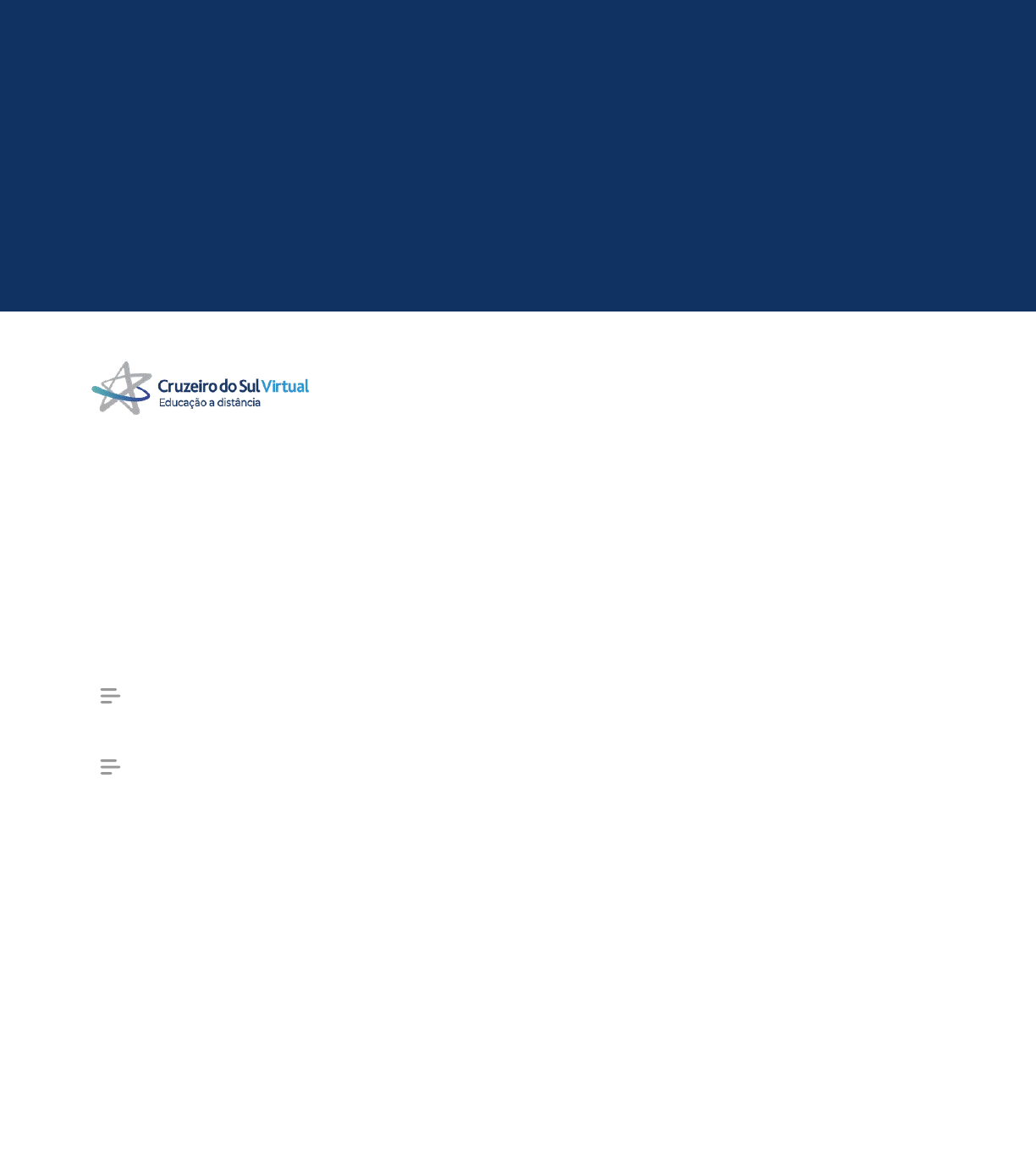 Olá, Estudante! Esta versão é destinada para o consumo do conteúdo de forma off-line. Vale lembrar, que este arquivo contém o mesmo conteúdo visto on-line. No entanto, recomendamos que acesse o conteúdo disponibilizado em seu ambiente virtual de aprendizagem para aproveitamento completo das funcionalidades e ferramentas. Desejamos bons estudos! A CONSTELAÇÃO CRUZEIRO DO SUL CRUZEIRO DO SUL VIRTUAL CONHEÇA NOSSA ESCOLA Antes de se juntar à nossa constelação, conheça melhor a origem das estrelas da Cruzeiro do Sul Educacional por meio da trajetória de um de seus fundadores. Da década de 1960 aos dias atuais, esta grande Organização nunca perdeu sua essência e vocação como ESCOLA, sentido verdadeiro do lugar dedicado à transformação de cidadãos comprometidos com o seu país e com a Humanidade. Neste vídeo você poderá acompanhar um pouco mais a fundo sobre a história da Cruzeiro do Sul Educacional sob a ótica do Prof. Hermes Ferreira Figueiredo. Para isso, clique no bot ão abaixo e confira! ASSISTA AO VÍDEO Para saber mais sobre essa história de sucesso, acesse o livro “A origem das Est relas: Hist órias e Memórias da Cruzeiro do Sul Educacional”. BAIXE O LIVRO A CRUZEIRO DO SUL EM NÚMEROS Confira a seguir os números da Cruzeiro do Sul Educacional. 1 / 2 A CONSTELAÇÃO CRUZEIRO DO SUL MISSÃO, VISÃO E VALORES Conheça a Missão, Visão e Valores que regem a Cruzeiro do Sul Educacional. Missão Desenvolver em sinergia a tríade ensino, pesquisa e extensão de suas instituições, para que se tornem relevantes no cenários nacional, com marcas reconhecidas em seus respectivos mercados, formando cidadãos e profissionais que contribuam efetivamente para desenvolvimento local e do país. Visão Estabelecer-se como o melhor grupo de educação superior do Brasil, com instituições academicamente relevantes no cenário nacional e marcas reconhecidas em seus respectivos mercados, reunindo os melhores indicadores de avaliação no ensino, na pesquisa e na extensão. Valores • Ética; • Transparência; UM PASSADO BRILHANTE, UM FUTURO EXTRAORDINÁRIO Entenda melhor o histórico, os desafios e as perspectivas do grupo educacional do qual você fará parte: a Cruzeiro do Sul. Neste vídeo institucional, você poderá compreender mais profundamente a dinâmica de at uação da Cruzeiro do Sul Educacional. Clique no botão abaixo e confira! ASSISTA O VÍDEO Quer saber mais? Clique no botão abaixo para ser redirecionada para o site da Cruzeiro do Sul Educacional. ACESSE NOSSO JEITO DE ENSINAR Nós, da Cruzeiro do Sul Educacional, acreditamos que a Educação tem o poder de transformar vidas. Muito mais que desenvolver profissionais de excelência, nosso compromisso é formar cidadãos, agentes de transformação. Para isso, nosso Ecossistema de Aprendizagem conecta alunos, docentes, Metodologias, Comunidade e Mercado de Trabalho, para proporcionar a melhor experiência na formação superior, guiando e orientando o universitário durante toda a sua jornada acadêmica, que ultrapassa a sala de aula. Queremos que o estudante seja capaz de idealizar ações e de realizá-las com criatividade, liderança, empatia, autonomia e responsabilidade social, ciente de que o aprendizado é contínuo e que precisa ser • Inovação; • Respeito à Identidade e à Diversidade; • Compromisso Social. renovado, atualizado e ampliado constantemente. Esse é o Nosso Jeito de Ensinar, e também de participar ativamente da aprendizagem, do desenvolvimento profissional e da construção do projeto de vida do aluno, proporcionando e evidenciando o seu protagonismo e transformando vidas e realidades por meio da Educação de qualidade. Protagonismo do Aluno, Empreendedorismo, Flexibilidade, Formação dos Formadores, Inovação e Pensamento Crítico são os pilares do Nosso Jeito de Ensinar e que permeiam todos os cursos presenciais e a distância. Clique no bot ão abaixo e saiba mais. ACESSE BOAS-VINDAS! Acompanhe, no vídeo abaixo, as saudações acadêmicas do Prof. Carlos Fernando de Araújo Jr. Diretor Acadêmico de Educação à Distância. ASSISTA AO VÍDEO A CRUZEIRO DO SUL VIRTUAL É A NOSSA MARCA EAD DE ATUAÇÃO NACIONAL Com indicadores de qualidade nos mais altos índices, a Educação a Distância da Cruzeiro do Sul Educacional está estrategicamente organizada em uma única marca de atuação nacional, a Cruzeiro do Sul Virtual. Ao todo, sete Instituições da Companhia são credenciadas para uma oferta completa de Cursos na modalidade a Distância: Graduação, Pós-Graduação, Cursos Livres e Cursos Técnicos, nas mais diversas Áreas do Conhecimento. 2 / 2 CRUZEIRO DO SUL VIRTUAL INSTITUIÇÕES CREDENCIADAS PARA OFERTA EAD Confira, a seguir, as nossas Instituições de Ensino credenciadas para a oferta de cursos à Distância. Universidade Cruzeiro do Sul A Universidade Cruzeiro do Sul, certificadora Cruzeiro do Sul Virtual, possui mais de 50 anos de história e tradição, e oferece cursos de Graduação, Pós-graduação lato e stricto sensu, a distância e presencial, distribuídos pelos campi Anália Franco, Liberdade, São Miguel, Paulista, Santo Amaro, Guarulhos e Villa-Lobos. É reconhecida por sua forte atuação na área social e pelo destaque em vários indicadores oficiais nas áreas de ensino, pesquisa e extensão. Para saber mais, clique aqui. Centro Universitário Braz Cubas Fundada em 1940, em Mogi das Cruzes – SP, tradição e modernidade andam juntas no Centro Universitário Braz Cubas: são mais de 80 anos de história em ensino de qualidade em diversas áreas do conhecimento. Considerada uma das mais experientes no ensino superior presencial e uma das pioneiras em EAD no Brasil, oferece Cursos Técnicas, de Graduação e Pós-graduação alinhados à dinâmica do mercado de trabalho. Para saber mais, clique aqui. Centro Universitário da Serra Gaúcha – FSG Fundada em 1999, o Centro Universitário da Serra Gaúcha – FSG oferece cursos 