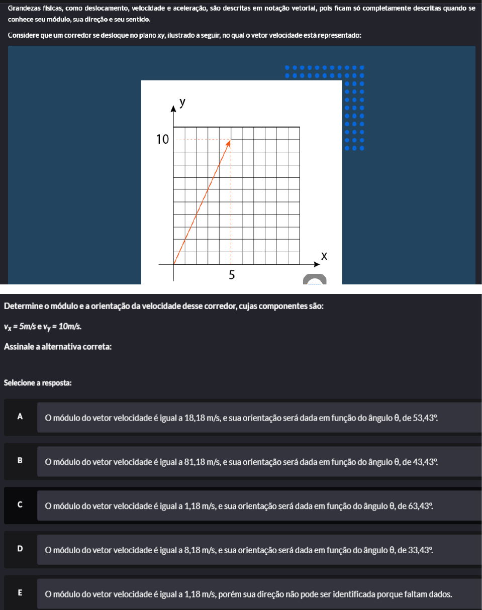 Vetores Assinale a alternativa que contém a resposta correta: Existem algumas formas de representar uma grandeza vetorial, desde que, na sua representação, estejam as informações de seu módulo, sua direção e seu sentido. Muitas vezes, as grandezas vetoriais são representadas em função de vetores unitários. Leis de Newton Aplicações das leis de Newton II - planos inclinados e roldanas Aplicações das leis de Newton III - com atrito Cinemática linear: velocidade e aceleração Cinemática da partícula: queda livre - lançamento vertical para baixo - gráficos do movimento Lançamento Horizontal - Lançamento Vertical para cima Cinemática da partícula: movimento em três dimensões Trabalho e energia Em um sistema de mola vertical, pode-se verificar a ação da força gravitacional sobre o sistema e, consequentemente, associá-lo à força elástica que se aplica à mola. Do ponto de vista de energia, pode-se dizer que há energia potencial gravitacional e energia potencial elástica. Se o sistema mostrado é dito conservativo, assinale a alternativa que mostra as formas de energia existentes quando a elongação é máxima e também quando a elongação se encontra no ponto médio da máxima elongação da mola. Um sistema descrito como conservativo é aquele em que não existe perda de energia. De outra forma, é possível dizer que a energia mecânica do sistema se conserva (Halliday; Resnick; Walker, 2013; Nussenzveig, 2002; Tipler, 1995). No entanto, a energia armazenada pode sofrer variações na sua forma, podendo manifestar-se na forma potencial em certo momento e na forma de energia cinética em outro, por exemplo. Considerando um sistema que apresenta energia na forma de energia cinética, isto é, que depende da massa e da velocidade, qual é a equação que calcula energia cinética e qual é o corpo que apresenta o maior valor de energia cinética? Selecione a resposta: Uma informação importante que pode vir associada a uma grandeza física é sua unidade. As unidades, geralmente são descritas no SI (Halliday; Resnick; Walker, 2013; Nussenzveig, 2002). Além da representação das unidades de grandezas físicas no SI, pode-se também utilizar o chamado sistema MLT para representar as mesmas grandezas físicas. No sistema MLT, quaisquer grandezas podem ser representadas em função da massa (M), do comprimento (L) e do tempo (T), conforme Halliday, Resnick e Walker (2013). Considerando o conceito de energia e as possíveis equações que podem representar formas de energia, assinale a alternativa que representa a combinação correta das dimensões para a energia. Selecione a resposta: Uma das formas de avaliar um sistema, do ponto de vista da interação com o meio, é fazê-lo a partir das variações de energia que este sistema sofre. Para essas situações, existem sistemas descritos como conservativos e dissipativos. O primeiro é capaz de conservar a energia, sem perdas. Já o segundo tem forças dissipativas e, por isso, perde energia (Halliday; Resnick; Walker, 2013).A figura a seguir ilustra um sistema em que uma bola pode ter sua energia variada quando entra em movimento. Devido às variações das grandezas existentes, como altura da bola (em relação a um referencial) e também sua velocidade, diferentes formas de energia deverão aparecer. Energia cinética, trabalho de uma força e de um binário Imagine um sistema inicialmente parado composto por duas engrenagens: uma maior e uma menor, como mostrado na figura. A engrenagem "A" tem massa mA=2 kg e raio de giração rA=300 mm, e a engrenagem "B" tem raio de giração rB=90 mm. Um binário de intensidade M=8 N .m é aplicado à engrenagem menor B. Quando a energia do sistema atingir 230 J, a engrenagem B terá uma frequência angular de 800 rpm. Sendo assim, qual é a massa da engrenagem B e o trabalho total aplicado pelo binário? Calcule a massa da engrenagem B, sabendo que a energia cinética em B é dada por Tf= 230 J e calcule o trabalho final, antes que a frequência angular da engrenagem B atinja 800 rpm A física do parque de diversão: com base em tudo o que você aprendeu na unidade Energia cinética, trabalho de uma força e de um binário, analise as afirmativas e assinale a alternativa que contenha as corretas. I) Um palhaço anda em um monociclo enquanto faz malabarismo com algumas bolinhas nas mãos. Ele se desloca do ponto A até o ponto B no picadeiro. O movimento responsável por esse deslocamento é o movimento de translação, pois é o responsável por levar um corpo rígido de um ponto ao outro. II) A roda gigante tem a mesma velocidade angular em todos os pontos, mas para calcular sua energia cinética é preciso somar todas as energias de todas as partículas que a compõem. Isso é por causa da diferença de velocidade linear nos diferentes pontos. III) O carrossel sofre o movimento de rotação, em que a velocidade angular e a linear são as mesmas para todas as partículas do carrossel. IV) Um trapezista é suspenso no ar por um sistema de polias. Nesse caso, o trapezista está em uma das pontas da corda, enquanto na outra ponta existem trabalhadores puxando a corda. O trabalho realizado pelos trabalhadores é positivo, pois o movimento do trapezista é ascendente. Selecione a resposta: Calcule o trabalho realizado em uma bola de futebol de massa m = 0,450 kg que está descendo uma ladeira, com altura h = 3 m, sem deslizar. Selecione a resposta: Uma forma de economizar espaço no quarto é usando cama-baú. Para abrir e fechar esse tipo de cama, é usado um mecanismo chamado mola a gás. A mola é comprimida quando a cama está fechada. Supondo que esse sistema funcione exatamente como uma mola comum e uma força de 50 N é aplicada sobre a cama, qual o trabalho que você deve realizar para fechar a cama? Ou seja, para levar a mola da posição s1 até a posição s2, com s2 = 0,40 m. Selecione a resposta: Um sistema composto por um disco de 5 kg e raio de giração 