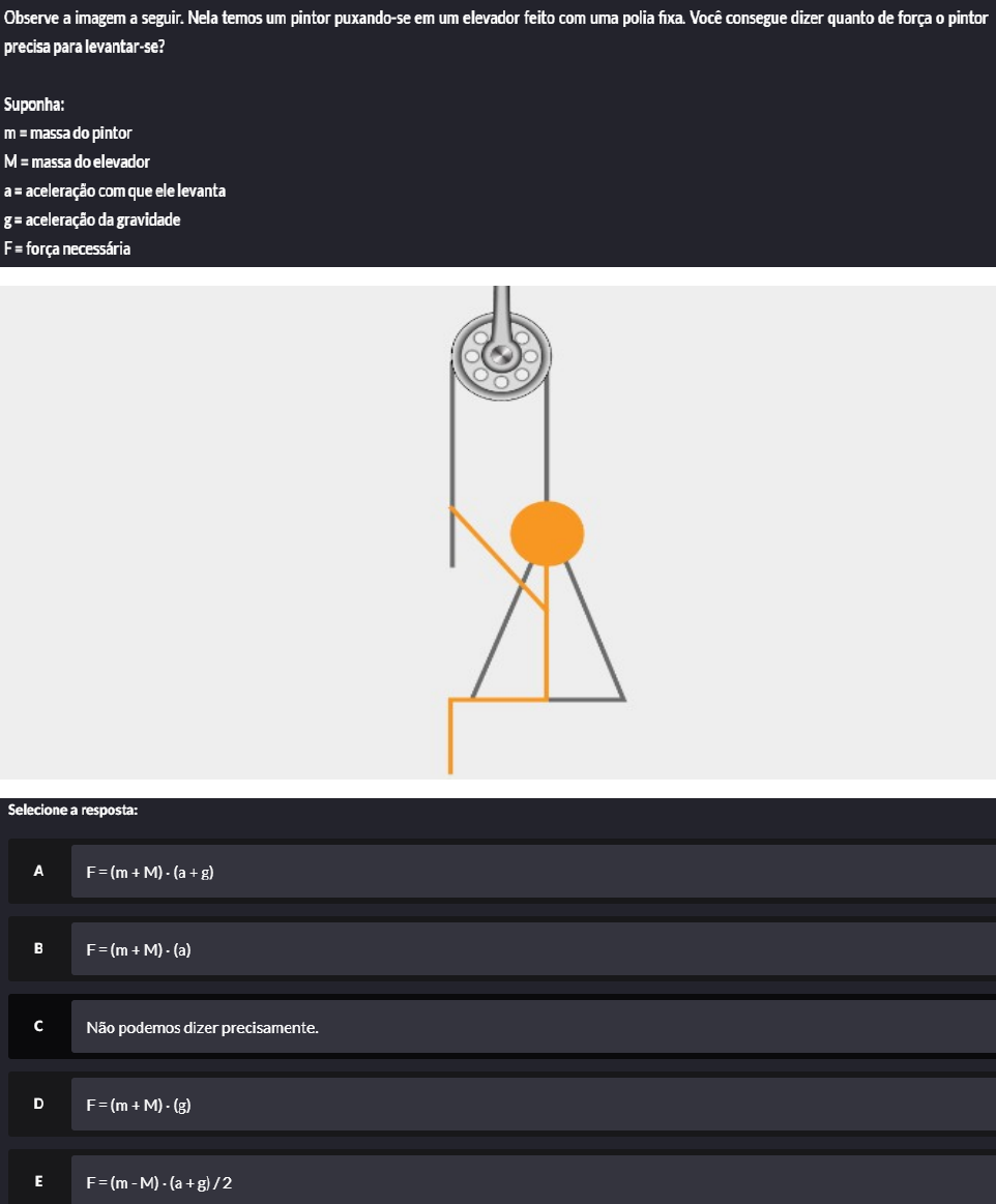 Aplicações das leis de Newton II - planos inclinados e roldanas Aplicações das leis de Newton III - com atrito Cinemática linear: velocidade e aceleração Cinemática da partícula: queda livre - lançamento vertical para baixo - gráficos do movimento Lançamento Horizontal - Lançamento Vertical para cima Cinemática da partícula: movimento em três dimensões Trabalho e energia Em um sistema de mola vertical, pode-se verificar a ação da força gravitacional sobre o sistema e, consequentemente, associá-lo à força elástica que se aplica à mola. Do ponto de vista de energia, pode-se dizer que há energia potencial gravitacional e energia potencial elástica. Se o sistema mostrado é dito conservativo, assinale a alternativa que mostra as formas de energia existentes quando a elongação é máxima e também quando a elongação se encontra no ponto médio da máxima elongação da mola. Um sistema descrito como conservativo é aquele em que não existe perda de energia. De outra forma, é possível dizer que a energia mecânica do sistema se conserva (Halliday; Resnick; Walker, 2013; Nussenzveig, 2002; Tipler, 1995). No entanto, a energia armazenada pode sofrer variações na sua forma, podendo manifestar-se na forma potencial em certo momento e na forma de energia cinética em outro, por exemplo. Considerando um sistema que apresenta energia na forma de energia cinética, isto é, que depende da massa e da velocidade, qual é a equação que calcula energia cinética e qual é o corpo que apresenta o maior valor de energia cinética? Selecione a resposta: Uma informação importante que pode vir associada a uma grandeza física é sua unidade. As unidades, geralmente são descritas no SI (Halliday; Resnick; Walker, 2013; Nussenzveig, 2002). Além da representação das unidades de grandezas físicas no SI, pode-se também utilizar o chamado sistema MLT para representar as mesmas grandezas físicas. No sistema MLT, quaisquer grandezas podem ser representadas em função da massa (M), do comprimento (L) e do tempo (T), conforme Halliday, Resnick e Walker (2013). Considerando o conceito de energia e as possíveis equações que podem representar formas de energia, assinale a alternativa que representa a combinação correta das dimensões para a energia. Selecione a resposta: Uma das formas de avaliar um sistema, do ponto de vista da interação com o meio, é fazê-lo a partir das variações de energia que este sistema sofre. Para essas situações, existem sistemas descritos como conservativos e dissipativos. O primeiro é capaz de conservar a energia, sem perdas. Já o segundo tem forças dissipativas e, por isso, perde energia (Halliday; Resnick; Walker, 2013).A figura a seguir ilustra um sistema em que uma bola pode ter sua energia variada quando entra em movimento. Devido às variações das grandezas existentes, como altura da bola (em relação a um referencial) e também sua velocidade, diferentes formas de energia deverão aparecer. Energia cinética, trabalho de uma força e de um binário Imagine um sistema inicialmente parado composto por duas engrenagens: uma maior e uma menor, como mostrado na figura. A engrenagem "A" tem massa mA=2 kg e raio de giração rA=300 mm, e a engrenagem "B" tem raio de giração rB=90 mm. Um binário de intensidade M=8 N .m é aplicado à engrenagem menor B. Quando a energia do sistema atingir 230 J, a engrenagem B terá uma frequência angular de 800 rpm. Sendo assim, qual é a massa da engrenagem B e o trabalho total aplicado pelo binário? Calcule a massa da engrenagem B, sabendo que a energia cinética em B é dada por Tf= 230 J e calcule o trabalho final, antes que a frequência angular da engrenagem B atinja 800 rpm A física do parque de diversão: com base em tudo o que você aprendeu na unidade Energia cinética, trabalho de uma força e de um binário, analise as afirmativas e assinale a alternativa que contenha as corretas. I) Um palhaço anda em um monociclo enquanto faz malabarismo com algumas bolinhas nas mãos. Ele se desloca do ponto A até o ponto B no picadeiro. O movimento responsável por esse deslocamento é o movimento de translação, pois é o responsável por levar um corpo rígido de um ponto ao outro. II) A roda gigante tem a mesma velocidade angular em todos os pontos, mas para calcular sua energia cinética é preciso somar todas as energias de todas as partículas que a compõem. Isso é por causa da diferença de velocidade linear nos diferentes pontos. III) O carrossel sofre o movimento de rotação, em que a velocidade angular e a linear são as mesmas para todas as partículas do carrossel. IV) Um trapezista é suspenso no ar por um sistema de polias. Nesse caso, o trapezista está em uma das pontas da corda, enquanto na outra ponta existem trabalhadores puxando a corda. O trabalho realizado pelos trabalhadores é positivo, pois o movimento do trapezista é ascendente. Selecione a resposta: Calcule o trabalho realizado em uma bola de futebol de massa m = 0,450 kg que está descendo uma ladeira, com altura h = 3 m, sem deslizar. Selecione a resposta: Uma forma de economizar espaço no quarto é usando cama-baú. Para abrir e fechar esse tipo de cama, é usado um mecanismo chamado mola a gás. A mola é comprimida quando a cama está fechada. Supondo que esse sistema funcione exatamente como uma mola comum e uma força de 50 N é aplicada sobre a cama, qual o trabalho que você deve realizar para fechar a cama? Ou seja, para levar a mola da posição s1 até a posição s2, com s2 = 0,40 m. Selecione a resposta: Um sistema composto por um disco de 5 kg e raio de giração 0,15 m está preso unicamente a um eixo fixo que passa pelo seu centro de massa. Quanto de energia é preciso fornecer para que o disco gire com uma velocidade angular de ω = 6,5 rad/s? Selecione a resposta: image7.png image97.png image8.png image9.png image10.png image11.png image12.png image13.png image14.png image15.png image16.p