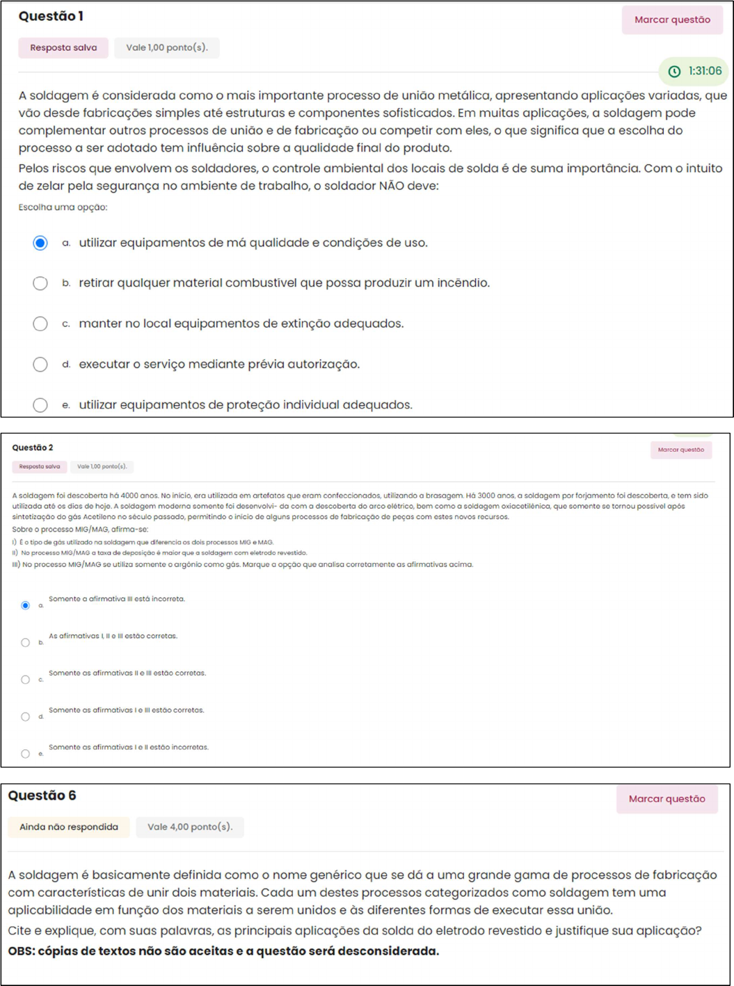 <p>Questão 1 Marcar questão Resposta salva Vale 1,00 ponto(s). 1:31:06 A soldagem é considerada como mais importante processo de união metálica, apresentando aplicações variadas, que vão desde fabricações simples até estruturas e componentes sofisticados. Em muitas aplicações, a soldagem pode complementar outros processos de união e de fabricação ou competir com eles, que significa que a escolha do processo a ser adotado tem influência sobre a qualidade final do produto. Pelos riscos que envolvem os soldadores, controle ambiental dos locais de solda é de suma importância. Com intuito de zelan pela segurança no ambiente de trabalho, soldador NÃO deve: Escolha uma opção: a. utilizar equipamentos de má qualidade e condições de uso. b. retirar qualquer material combustível que possa produzir um incêndio. C. manter no local equipamentos de extinção adequados. d. executar serviço mediante prévia autorização. e. utilizar equipamentos de proteção individual adequados. Questão 2 Marcar Resposto salvo Vale ponto(s) A soldagem foi há 4000 anos No ero em artefatos que eram utilizando a 3000 anos, a soldagem por forjamento foi descoberta, e tem sido utilizada até os dias de A soldagem moderna somente foi desenvolvi- com descoberta do arco bem como o soldagem que somente se tornou após sintetização do gás Acetileno no século passado, permitindo de alguns processos de fabricação de peças com estes novos recursos. Sobre processo 1) E tipo de gás utilizado no soldagem que diferencia os dois processos MIG e No processo MIG/MAG a taxa de deposição é maior que a soldagem com eletrodo III) No processo MIG/MAG se utiliza somente como Marque a opção que analisa corretamente as afirmativas Somente a afirmativa III está a As afirmativas III estão b. Somente as afirmativas II e III estão Somente as afirmativas e III estão Somente as afirmativas e estão Questão 6 Marcar questão Ainda não respondida Vale 4,00 ponto(s). A soldagem é basicamente definida como nome genérico que se dá a uma grande gama de processos de fabricação com características de unir dois materiais. Cada um destes processos categorizados como soldagem tem uma aplicabilidade em função dos materiais a serem unidos e às diferentes formas de executar essa Cite e explique, com suas palavras, as principais aplicações da solda do eletrodo revestido e justifique sua aplicação? OBS: cópias de textos não são aceitas e a questão será</p><p>Questão 3 Marcar questão Resposta salva Vale 1,00 ponto(s). 1:28:22 Na inspeção realizada após a execução de uma junta soldada, foi identificado que metal de solda não atingiu a raiz total das peças soldadas, defeito delicado que deve ser evitado a todo custo pois reduz a resistência da ligação, de aparecimento de corrosão nesses responsável pela avaliação concluiu tratar-se da patologia: uma opção: a. Falta de fusão. b. Inclusão de escória. d. Falta de penetração. e. Distorção. Questão 4 Marcar questão salva Vale ponto(s). 1:27:27 A soldagem é considerada como mais importante processo de união metálica, apresentando aplicações variadas, que vão desde fabricações simples até estruturas e componentes sofisticados. Em muitas aplicações, a soldagem pode complementar outros processos de união e de fabricação ou competir com eles, o que significa que a escolha do processo a ser adotado tem influência sobre a qualidade final do produto. Considerando as posições que podem ser utilizadas nos diversos processos de soldagem, pode-se dizer que processo de soldagem a arco submerso é indicado para as posições: vertical e sobre-cabeça. plana e b. sobre-cabeça e plana. C. horizontal e plana. d. vertical e Questão 5 Marcar questão salva Vale 1,00 ponto(s). A soldagem é considerada como o mais importante processo de união metálica, apresentando aplicações variadas, que vão desde fabricações simples até estruturas e componentes sofisticados. Em muitas aplicações, a soldagem pode complementar outros processos de união e de fabricação ou competir com eles, que significa que a escolha do processo a ser adotado tem influência sobre a qualidade final do produto. Ao se escolher adequadamente um processo de soldagem, deve-se considerar que: Escolha uma opção: os eletrodos revestidos não são responsáveis pela estabilização do arco elétrico na operação de soldagem. b. do eletrodo revestido não influencia na qualidade do cordão. eletrodo não é consumido na soldagem por MAG. d. a largura do cordão não sofre influência da intensidade de corrente nos processos com eletrodos revestidos. e. eletrodo e o metal de base não estabelecem arco elétrico nas soldagens por TIG.</p><p>Questão 7 Marcar questão Resposta salva Vale 1,00 ponto(s). 1 1:24:45 Na inspeção realizada após a execução de uma junta soldada, foi identificada uma descontinuidade caracterizada pela fusão da superfície da chapa do metal de base, qual a causa do defeito: Escolha uma opção: a. Falta de penetração. b. Mordedura. C. Inclusão de escória. d. Falta de fusão. e. Distorção.</p>