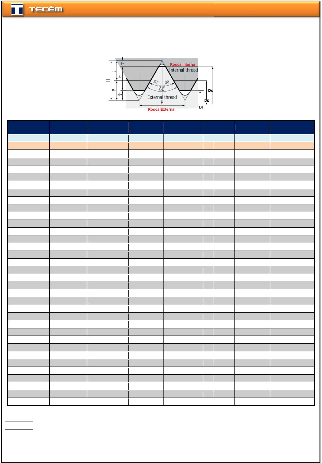 ROSCA AMERICANA GROSSA (UNC) – UNC AMERICAN THREAD COARSE Tamanho nominal Diâmetro maior Do Fios por polegada Pitch Diameter (Dp) Diâmetro Menor Di ângulo no Dp Altura da rosca Area resit. à tração Nominal size Do Threads / inch Dp Di Angle at Dp Thread height Tensile Stress Area in in in (º) (Min) in (in 2 ) #1 0.073 64 0.063 0.056 4 31 0.01353 0.003 #2 0.086 56 0.074 0.067 4 22 0.01547 0.004 #3 0.099 48 0.086 0.076 4 26 0.01804 0.005 #4 0.112 40 0.096 0.085 4 45 0.02165 0.006 #5 0.125 40 0.109 0.098 4 11 0.02165 0.008 #6 0.138 32 0.118 0.104 4 50 0.02706 0.009 #8 0.164 32 0.144 0.130 3 58 0.02706 0.014 #10 0.190 24 0.163 0.145 4 39 0.03608 0.018 #12 0.216 24 0.189 0.171 4 1 0.03608 0.024 1/4 0.250 20 0.218 0.196 4 11 0.04330 0.032 5/16 0.313 18 0.276 0.252 3 40 0.04811 0.052 3/8 0.375 16 0.334 0.307 3 24 0.05413 0.078 7/16 0.438 14 0.391 0.360 3 20 0.06186 0.106 1/2 0.500 13 0.450 0.417 3 7 0.06662 0.142 9/16 0.563 12 0.508 0.472 2 59 0.07217 0.182 5/8 0.625 11 0.566 0.527 2 56 0.07873 0.226 3/4 0.750 10 0.685 0.642 2 40 0.08660 0.334 7/8 0.875 9 0.803 0.755 2 31 0.09623 0.462 1 1.000 8 0.919 0.865 2 29 0.10825 0.606 1 1/8 1.125 7 1.032 0.941 2 31 0.12372 0.763 1 1/4 1.250 7 1.157 1.095 2 15 0.12372 0.969 1 3/8 1.375 6 1.267 1.195 2 24 0.14434 1.155 1 1/2 1.500 6 1.392 1.320 2 11 0.14434 1.405 1 3/4 1.750 5 1.620 1.534 2 15 0.17321 1.900 2 2.000 4 1/2 1.856 1.759 2 11 0.19245 2.500 2 1/4 2.250 4 1/2 2.106 2.009 1 55 0.19245 3.250 2 1/2 2.500 4 2.338 2.229 1 57 0.21651 4.000 2 3/4 2.750 4 2.588 2.479 1 46 0.21651 4.930 3 3.000 4 2.838 2.729 1 36 0.21651 5.970 3 1/4 3.250 4 3.088 2.979 1 29 0.21651 7.100 3 1/2 3.500 4 3.338 3.229 1 22 0.21651 8.330 3 3/4 3.750 4 3.588 3.479 1 16 0.21651 9.660 4 4.000 4 3.838 3.729 1 11 0.21651 11.080 M U 06
