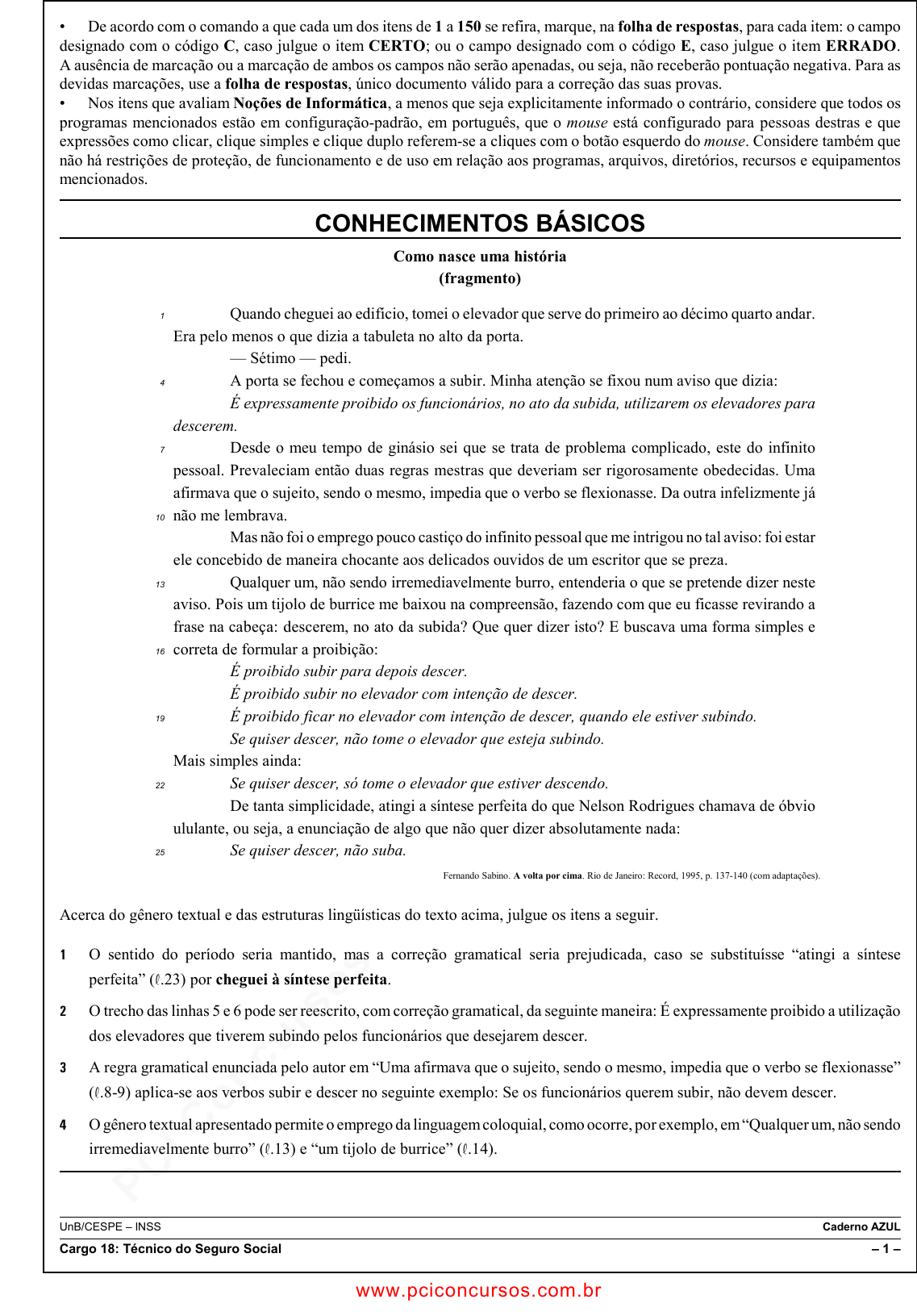pcimarkpci MDAwMDowMDAwOjAwMDA6MDAwMDowMDAwOmZmZmY6YWFmNjo3OGQ1:TW9uLCAxMSBOb3YgMjAyNCAwOTo1Mzo1MSAtMDMwMA== www.pciconcursos.com.br UnB/CESPE – INSS Caderno AZUL Cargo 18: Técnico do Seguro Social – 1 – • De acordo com o comando a que cada um dos itens de 1 a 150 se refira, marque, na folha de respostas, para cada item: o campo designado com o código C, caso julgue o item CERTO; ou o campo designado com o código E, caso julgue o item ERRADO. A ausência de marcação ou a marcação de ambos os campos não serão apenadas, ou seja, não receberão pontuação negativa. Para as devidas marcações, use a folha de respostas, único documento válido para a correção das suas provas. • Nos itens que avaliam Noções de Informática, a menos que seja explicitamente informado o contrário, considere que todos os programas mencionados estão em configuração-padrão, em português, que o mouse está configurado para pessoas destras e que expressões como clicar, clique simples e clique duplo referem-se a cliques com o botão esquerdo do mouse. Considere também que não há restrições de proteção, de funcionamento e de uso em relação aos programas, arquivos, diretórios, recursos e equipamentos mencionados. CONHECIMENTOS BÁSICOS Como nasce uma história (fragmento) Quando cheguei ao edifício, tomei o elevador que serve do primeiro ao décimo quarto andar.1 Era pelo menos o que dizia a tabuleta no alto da porta. — Sétimo — pedi. A porta se fechou e começamos a subir. Minha atenção se fixou num aviso que dizia: 4 É expressamente proibido os funcionários, no ato da subida, utilizarem os elevadores para descerem. Desde o meu tempo de ginásio sei que se trata de problema complicado, este do infinito7 pessoal. Prevaleciam então duas regras mestras que deveriam ser rigorosamente obedecidas. Uma afirmava que o sujeito, sendo o mesmo, impedia que o verbo se flexionasse. Da outra infelizmente já não me lembrava.10 Mas não foi o emprego pouco castiço do infinito pessoal que me intrigou no tal aviso: foi estar ele concebido de maneira chocante aos delicados ouvidos de um escritor que se preza. Qualquer um, não sendo irremediavelmente burro, entenderia o que se pretende dizer neste13 aviso. Pois um tijolo de burrice me baixou na compreensão, fazendo com que eu ficasse revirando a frase na cabeça: descerem, no ato da subida? Que quer dizer isto? E buscava uma forma simples e correta de formular a proibição: 16 É proibido subir para depois descer. É proibido subir no elevador com intenção de descer. É proibido ficar no elevador com intenção de descer, quando ele estiver subindo. 19 Se quiser descer, não tome o elevador que esteja subindo. Mais simples ainda: Se quiser descer, só tome o elevador que estiver descendo. 22 De tanta simplicidade, atingi a síntese perfeita do que Nelson Rodrigues chamava de óbvio ululante, ou seja, a enunciação de algo que não quer dizer absolutamente nada: Se quiser descer, não suba. 25 Fernando Sabino. A volta por cima. Rio de Janeiro: Record, 1995, p. 137-140 (com adaptações). Acerca do gênero textual e das estruturas lingüísticas do texto acima, julgue os itens a seguir. 1 O sentido do período seria mantido, mas a correção gramatical seria prejudicada, caso se substituísse “atingi a síntese perfeita” ( .23) por cheguei à síntese perfeita. 2 O trecho das linhas 5 e 6 pode ser reescrito, com correção gramatical, da seguinte maneira: É expressamente proibido a utilização dos elevadores que tiverem subindo pelos funcionários que desejarem descer. 3 A regra gramatical enunciada pelo autor em “Uma afirmava que o sujeito, sendo o mesmo, impedia que o verbo se flexionasse” ( .8-9) aplica-se aos verbos subir e descer no seguinte exemplo: Se os funcionários querem subir, não devem descer. 4 O gênero textual apresentado permite o emprego da linguagem coloquial, como ocorre, por exemplo, em “Qualquer um, não sendo irremediavelmente burro” ( .13) e “um tijolo de burrice” ( .14). www.pciconcursos.com.br pcimarkpci MDAwMDowMDAwOjAwMDA6MDAwMDowMDAwOmZmZmY6YWFmNjo3OGQ1:TW9uLCAxMSBOb3YgMjAyNCAwOTo1Mzo1MSAtMDMwMA== www.pciconcursos.com.br UnB/CESPE – INSS Caderno AZUL Cargo 18: Técnico do Seguro Social – 2 – Um dos indicadores de saúde comumente utilizados no Brasil é a esperança de vida ao nascer, que corresponde ao número de anos que um indivíduo vai viver, considerando-se a duração média da vida dos membros da população. O valor desse índice tem sofrido modificações substanciais no decorrer do tempo, à medida que as condições sociais melhoram e as conquistas da ciência e da tecnologia são colocadas a serviço do homem. A julgar por estudos procedidos em achados fósseis e em sítios arqueológicos, a esperança de vida do homem pré-histórico ao nascer seria extremamente baixa, em torno de 18 anos; na Grécia e na Roma antigas, estaria entre 20 e 30 anos, pouco tendo se modificado na Idade Média e na Renascença. Mais recentemente, têm sido registrados valores progressivamente mais elevados para a esperança de vida ao nascer. Essa situação está ilustrada no gráfico abaixo, que mostra a evolução da esperança de vida do brasileiro ao nascer, de 1940 a 2000. 0 20,0 40,0 42,0 60,0 80,0 70,5 1940 1950 1960 1970 1980 1990 2000 M. Z. Rouquayrol e N. de Almeida Filho. In: Epidemiologia e saúde. Rio de Janeiro: MEDSI, 2003, p. 68 (com adaptações). Com base nas informações do texto e considerando os temas a que ele se reporta, julgue os itens seguintes. 5 Se E representa a esperança de vida do brasileiro ao nascer e x representa o tempo, em anos, transcorrido desde 1940, infere-se das informações apresentadas que, para 0 x 60, E(x) = 42x + 70,5. 6 Sabendo-se que, em 1910, a esperança de vida do brasileiro ao nascer era de 34 anos, conclui-se que o valor desse indicador aumentou em mais de 100% em 90 anos, isto é, de 1910 a 2000. 7 No Brasil, o fenômeno do aume