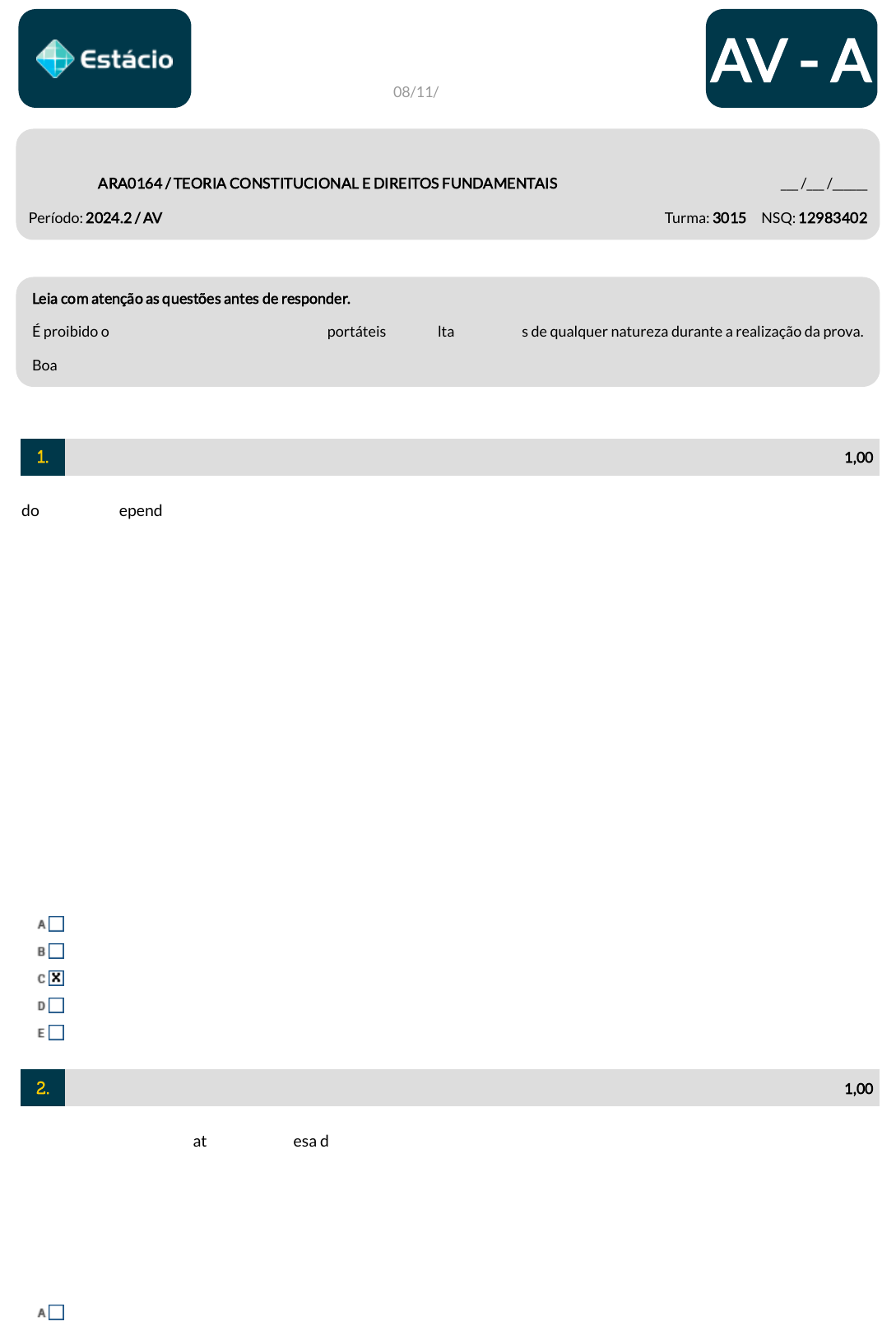 7045584538 AV - A 08/11/2024 10:55 Nome: Matrícula: ____________________ Disciplina: ARA0164 / TEORIA CONSTITUCIONAL E DIREITOS FUNDAMENTAIS Data: ___ /___ /______ Período: 2024.2 / AV Turma: 3015 NSQ: 12983402 Leia com atenção as questões antes de responder. É proibido o uso de equipamentos eletrônicos portáteis e consulta a materiais de qualquer natureza durante a realização da prova. Boa prova. 1. _______ de 1,00 ¿Algumas vezes, fala-se em Constituição para aludir-se às normas jurídicas dotadas de superior hierarquia no ordenamento do Estado, independentemente de seu conteúdo. Essa é a Constituição `em sentido formal¿, ou Constituição formal¿ (Daniel Sarmento e Cláudio Preira de Souza Neto). A partir da colocação acima, considere as a�rmações subsequentes e responda conforme requerido: I. O sentido formal de Constituição leva em conta apenas o status jurídico, ou seja, a força e o posicionamento da Constituição dentro do ordenamento jurídico sem existir uma preocupação imediata com o seu conteúdo. As questões relacionadas ao conteúdo da Constituição não são preocupações da Constituição Formal, mas sim da Constituição Material; II. Art. 173. (...) § 5º A lei, sem prejuízo da responsabilidade individual dos dirigentes da pessoa jurídica, estabelecerá a responsabilidade desta, sujeitando-a às punições compatíveis com sua natureza, nos atos praticados contra a ordem econômica e �nanceira e contra a economia popular; III. Art. 242. (...) § 2º O Colégio Pedro II, localizado na cidade do Rio de Janeiro, será mantido na órbita federal; IV. Do ponto de vista material, a Constituição é o conjunto de normas pertinentes à organização do poder, à distribuição da competência, ao exercício da autoridade, à forma de governo, aos direitos da pessoa humana, tanto individuais como sociais. Tudo quanto for, en�m, conteúdo básico referente à composição e ao funcionamento da ordem política exprime o aspecto material da Constituição. as a�rmações I, II e IV tratam do sentido material de constituição. apenas as a�rmativas I e II tratam do sentido formal de constituição. as a�rmações I, II e III tratam de sentido formal de constituição. a a�rmação I considera o sentido material de constituição. apenas a a�rmação IV trata do sentido formal de constituição. 2. _______ de 1,00 Ano: 2021 Banca: FGV Órgão: OAB Prova: FGV - 2021 - OAB - Exame de Ordem Uni�cado XXXIII - Primeira Fase Você, como advogada(o) atuante na defesa dos Direitos Humanos, foi convidada(o) para participar de um programa de debate na rádio local sobre a questão da pena de morte. Um dos debatedores, em certo ponto do programa, a�rmou que, caso fosse aprovada uma Proposta de Emenda Constitucional (PEC) suprimindo a vedação da pena de morte presente na Constituição, o Brasil poderia adotar esse tipo de pena. Na opinião desse debatedor, tratar-se-ia apenas de vontade política e não de questão jurídica. Diante disso, cabe a você esclarecer que não se aplica. essa PEC não é juridicamente adequada, porque tal vedação é cláusula pétrea da Constituição e porque o Brasil promulgou o Protocolo Adicional à Convenção Americana sobre Direitos Humanos referente à abolição da pena de morte. de acordo com a Constituição da República e a Convenção Americana sobre Direitos Humanos, apenas o Supremo Tribunal Federal poderia admitir a pena de morte, porque possui competência para relativizar a proteção a um direito fundamental, desde que para proteger outro direito fundamental. essa PEC poderia ser aprovada pelo Congresso Nacional mas, de acordo com a Constituição da República, uma decisão nesse sentido somente poderia ser implementada após aprovação em referendo popular. essa PEC poderia ser aprovada pelo Congresso Nacional e surtir seus efeitos jurídicos mas, por se tratar de uma questão política, o ideal seria que essa decisão fosse precedida de amplo debate popular. 3. _______ de 1,00 Uma determinada Associação privada determinou a exclusão de dois membros (Roberto e Jacira) de seus quadros associativos pelo suposto cometimento de irregularidades. Ambos a�rmam que irão recorrer à justiça, pois não foram ouvidos e, por isso, não tiveram respeitados seus direitos à ampla defesa e ao contraditório, direitos fundamentais. A Associação alega que Roberto e Jacira estavam cientes e aceitaram a regra explícita estabelecida no regulamento da Associação que informava ser direito da Direção afastar dos quadros associativos, segundo seus próprios critérios e a qualquer tempo, qualquer membro. Segundo a ordem constitucional brasileira, tendo em conta a possibilidade ou impossibilidade de aplicar direitos fundamentais nas relações privadas, Roberto e Jacira: poderão alegar seus direitos à ampla defesa e ao contraditório porque o Brasil adota a teoria da E�cácia horizontal Indireta dos direitos fundamentais. somente poderão alegar seus direitos à ampla defesa e ao contraditório se houver previsão na lei acerca da obrigatoriedade de serem ouvidos antes de desligamento não podem alegar direito fundamental à ampla defesa e ao contraditório, já que as regras do Regulamento da Associação, quando por eles aceitas, �rmaram-se como a norma maior a reger a relação entre a Associação e seus membros. não poderão alegar seus direitos à ampla defesa e ao contraditório porque o Brasil adota a teoria da Ine�cácia horizontal dos direitos fundamentais. poderão alegar seus direitos à ampla defesa e ao contraditório porque o Brasil adota a teoria da E�cácia horizontal Direta dos direitos fundamentais. 4. _______ de 1,00 Marina, insatisfeita com os últimos decretos do Prefeito do Município Alfa, resolve convocar nas redes sociais uma manifestação pací�ca nas ruas do centro da cidade. No dia marcado, várias pessoas comparecem ao logradouro público e começam a 