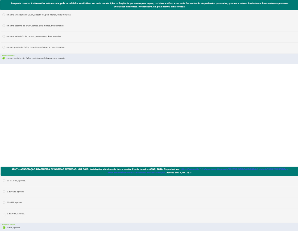 1/4 UNIDADE 01 Atividade 1 & 2 – Prova 01 - A norma NBR 5410 (2008) possui critérios bem claros para as definições dos mínimos de iluminação e tomadas dos espaços residenciais. Esses critérios evitam que novas construções sejam produzidas com redução de custos por omissão de elementos importantes para a boa utilização desses espaços. ABNT - ASSOCIAÇÃO BRASILEIRA DE NORMAS TÉCNICAS. NBR 5410: instalações elétricas de baixa tensão. Rio de Janeiro: ABNT, 2008. Disponível em: https://aee.net.br/cftv/wp-content/uploads/2017/10/NBR-5410-2008- Instala%C3%A7%C3%B5es-El%C3%A9tricas-de-Baixa-Tens%C3%A3o-atual.pdf. Acesso em: 9 jun. 2021. Em relação ao número de tomadas, segundo a NBR 5410, é correto afirmar que: 02 - Todo projeto relacionado a instalações elétricas envolve sempre o dimensionamento dos condutores e dos elemen- tos de proteção. Os condutores são dimensionados primeiro, com base nas cargas e no tamanho dos condutores que ligam as cargas aos quadros de distribuição. Em seguida, são dimensionados os elementos de proteção. Sobre dimensionamento dos condutores, analise as afirmativas a seguir. I. Os cabos de circuitos de iluminação devem possuir bitola mínima de # 1,5 mm². II. Os cabos de circuitos de tomadas de uso geral devem possuir bitola mínima de # 2,5 mm². III. Os disjuntores são dispositivos projetados para sempre impedir a passagem de corrente elétrica. IV. Os cabos elétricos de PVC são de maior aplicabilidade do que os de EPR. Está correto o que se afirma em: 03 - Leia o excerto a seguir: “A norma ABNT NBR 5410 - Instalações Elétricas de Baixa Tensão, como conhecemos hoje, nasceu da preocupação em estabelecer condições mínimas que contemplassem as instalações elétricas de baixa tensão, a fim de garantir a segurança de pessoas e animais, o funcionamento adequado da instalação e a conservação de bens. Sua história começa com a publicação pela ABNT de sua primeira edição, cujos textos foram baseados no Código de Instalações Elétricas da antiga Inspetoria Geral de Iluminação, além de um anteprojeto elaborado por uma comissão de especialistas”. A EVOLUÇÃO da norma-mãe das instalações de baixa tensão. O setor elétrico, 2011. Disponível https://aee.net.br/cftv/wp-content/uploads/2017/10/NBR-5410-2008-Instala%C3%A7%C3%B5es-El%C3%A9tricas-de-Baixa-Tens%C3%A3o-atual.pdf https://aee.net.br/cftv/wp-content/uploads/2017/10/NBR-5410-2008-Instala%C3%A7%C3%B5es-El%C3%A9tricas-de-Baixa-Tens%C3%A3o-atual.pdf 2/4 em: https://www.osetoreletrico.com.br/a-evolucao-da-norma-mae-das-instalacoes-de-baixa-tensao/. Acesso em: 9 jun. 2021. Assinale a alternativa que corresponda ao início da vigência da NBR 5410. 04 - As diversas substâncias existentes na natureza ou criadas pelo homem podem ser classificadas de acordo com seu comportamento frente a uma corrente elétrica. Podemos assim obter substâncias condutoras, semicondutoras e não condutoras. Reconhecer essas substâncias e sua classificação é de grande valor para um estudante, pois, em muitas situ- ações práticas, esse conhecimento se torna fundamental para a solução de um problema. Assinale a alternativa que apresenta corretamente uma substância eletricamente não condutora. 05 - Todo circuito elétrico e componente elétrico, devido às suas geometrias construtivas e efeitos de campos magnéticos externos, podem sempre ser representados por circuitos ideais com não idealidades adicionadas. Essas não idealidades são resistores, capacitores e indutores que são calculados para simular os circuitos reais e, assim, permitir que análises mais detalhadas possam ser feitas. Diante do exposto, analise as afirmativas a seguir. I. A tensão sobre um resistor é diretamente proporcional ao produto da resistência pela corrente que flui por ele. II. A tensão sobre um indutor é diretamente proporcional ao produto da indutância pela taxa de variação da corrente. III. A corrente sobre um capacitor é diretamente proporcional ao produto da capacitância pela taxa de variação da tensão aplicada sobre ele. IV. Os resistores, capacitores e indutores atuam da mesma forma em circuitos CC e CA. Está correto o que se afirma em: https://www.osetoreletrico.com.br/a-evolucao-da-norma-mae-das-instalacoes-de-baixa-tensao/ 3/4 06 - A NBR 5410 (2008), considerando a importância das tomadas nas residências modernas e visando a uma melhor adequação e proteção aos usuários, dividiu esse elemento em duas classes: as Tomadas de Uso Geral (TUG) e as Tomadas de Uso Exclusivo (TUE). As TUGs podem receber equipamentos que seriam ligados às TUEs, mas o inverso não pode ocor- rer. ABNT - ASSOCIAÇÃO BRASILEIRA DE NORMAS TÉCNICAS. NBR 5410: instalações elétricas de baixa tensão. Rio de Janeiro: ABNT, 2008. Disponível em: https://aee.net.br/cftv/wp-content/uploads/2017/10/NBR-5410-2008- Instala%C3%A7%C3%B5es-El%C3%A9tricas-de-Baixa-Tens%C3%A3o-atual.pdf. Acesso em: 9 jun. 2021. Com base na NBR 5410, assinale a alternativa que apresenta corretamente o que diferencia uma TUE de uma TUG. 07 - Os vernizes são soluções de substâncias filmogênicas dissolvidas em solventes orgânicos. No processo de secagem do verniz, os solventes evaporam dele, levando à formação de um filme de verniz. De acordo com a finalidade, os vernizes isolantes elétricos possuem algumas classificações. Considerando o exposto para essas classificações, analise as afirmativas a seguir. I. Os vernizes de impregnação são utilizados para impregnar os enrolamentos de máquinas e aparelhos elétricos, a fim de fixar suas espiras, aumentar o coeficiente de condutividade térmica dos enrolamentos e ampliar sua resistência à umid- ade. II. Os vernizes de contato são usados para ampliar a conexão elétrica entre duas partes de um enrolamento de máquinas, como motores elétricos. Assim, facilitam o fluxo de corrente e diminuem a resistência elétrica. III. Os vernizes de cobe