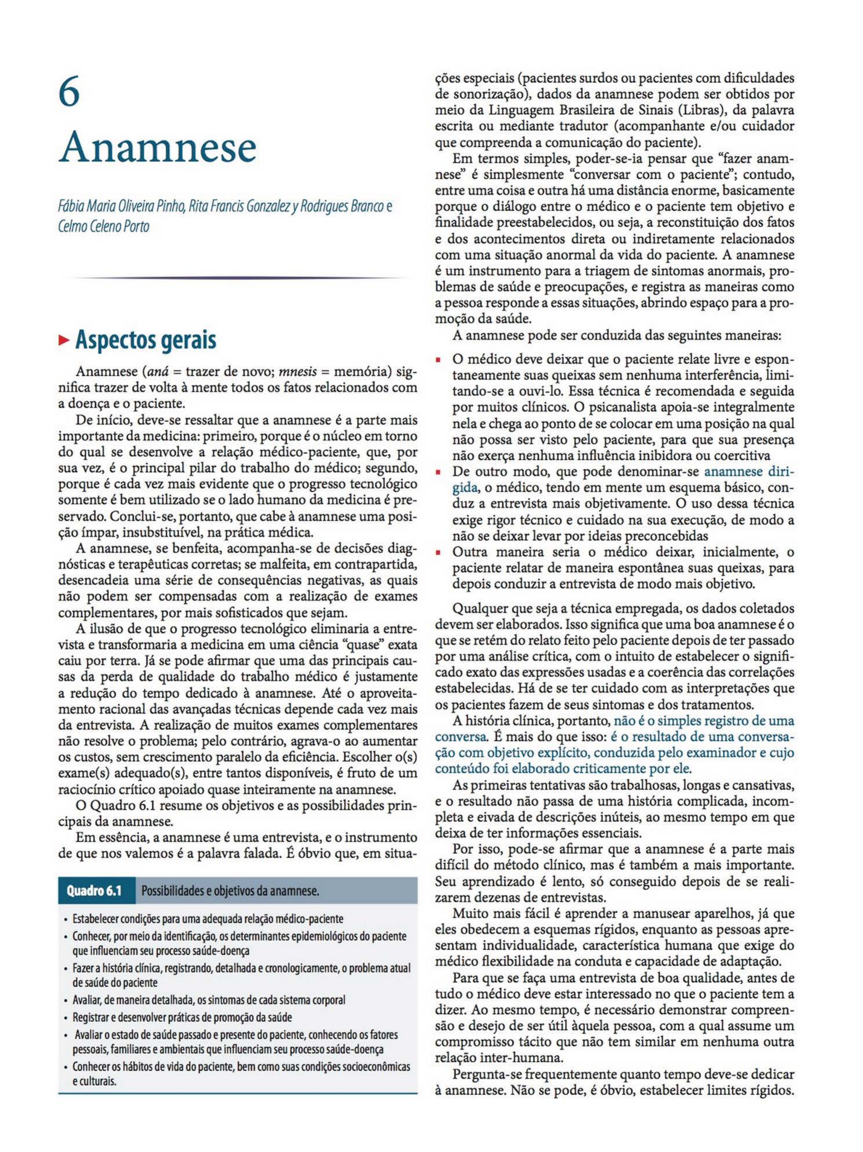 6 Anamnese Fábio Maria Oliveira Pinho, Rita Francis Gonzalez y Rodrigues Branco e Celmo Celeno Porto ..., Aspectos gerais Anamnese (aná =trazer de novo; mnesis =memória) sig- nifica trazer de volta à mente todos os fatos relacionados com a doença e o paciente. De início, deve-se ressaltar que a anamnese é a parte mais importante da medicina: primeiro, porque é o núcleo em torno do qual se desenvolve a relação médico-paciente, que, por sua vez, é o principal pilar do trabalho do médico; segundo, porque é cada vez mais evidente que o progresso tecnológico somente é bem utilizado se o lado humano da medicina é pre- servado. Conclui-se, portanto, que cabe à anamnese uma posi- ção ímpar, insubstituível, na prática médica. A anamnese, se benfeita, acompanha-se de decisões diag- nósticas e terapêuticas corretas; se malfeita, em contrapartida, desencadeia uma série de consequências negativas, as quais não podem ser compensadas com a realização de exames complementares, por mais sofisticados que sejam. A ilusão de que o progresso tecnológico eliminaria a entre- vista e transformaria a medicina em uma ciência "quase" exata caiu por terra. Já se pode afirmar que uma das principais cau- sas da perda de qualidade do trabalho médico é justamente a redução do tempo dedicado à anamnese. Até o aproveita- mento racional das avançadas técnicas depende cada vez mais da entrevista. A realização de muitos exames complementares não resolve o problema; pelo contrário, agrava-o ao aumentar os custos, sem crescimento paralelo da eficiência. Escolher o(s) exame(s) adequado(s), entre tantos disponíveis, é fruto de um raciocínio crítico apoiado quase inteiramente na anamnese. O Quadro 6.1 resume os objetivos e as possibilidades prin- cipais da anamnese. Em essência, a anamnese é uma entrevista, e o instrumento de que nos valemos é a palavra falada. É óbvio que, em situa- Quadro6.1 Possibilidades e objetivos da anamnese. • Estabelecer condições para uma adequada relação médico-paciente • Conhecer, por meio da identificação, os determinantes epidemiológicos do padente que influenciam seu processo saúde-doença • Fazer a história clínica, registrando, detalhada e cronologicamente, o problema atual de saúde do paciente • Avaliar, de maneira detalhada, os sintomas de cada sistema corporal • Registrar e desenvolver práticas de promoção da saúde • Avaliar o estado de saúde passado e presente do paciente, conhecendo os fatores pessoais, familiares e ambientais que influenciam seu processo saúde-doença • Conhecer os hábitos de vida do paciente, bem como suas condições socioeconômicas e culturais. ções especiais (pacientes surdos ou pacientes com dificuldades de sonorização), dados da anamnese podem ser obtidos por meio da Linguagem Brasileira de Sinais (Libras), da palavra escrita ou mediante tradutor (acompanhante e/ou cuidador que compreenda a comunicação do paciente). Em termos simples, poder-se-ia pensar que "fazer anam- nese" é simplesmente "conversar com o paciente"; contudo, entre uma coisa e outra há uma distância enorme, basicamente porque o diálogo entre o médico e o paciente tem objetivo e finalidade preestabelecidos, ou seja, a reconstituição dos fatos e dos acontecimentos direta ou indiretamente relacionados com uma situação anormal da vida do paciente. A anamnese é um instrumento para a triagem de sintomas anormais, pro- blemas de saúde e preocupações, e registra as maneiras como a pessoa responde a essas situações, abrindo espaço para a pro- moção da saúde. A anamnese pode ser conduzida das seguintes maneiras: • O médico deve deixar que o paciente relate livre e espon- taneamente suas queixas sem nenhuma interferência, limi- tando-se a ouvi-lo. Essa técnica é recomendada e seguida por muitos clínicos. O psicanalista apoia-se integralmente nela e chega ao ponto de se colocar em uma posição na qual não possa ser visto pelo paciente, para que sua presença não exerça nenhuma influência inibidora ou coercitiva • De outro modo, que pode denominar-se anamnese diri- gida, o médico, tendo em mente um esquema básico, con- duz a entrevista mais objetivamente. O uso dessa técnica exige rigor técnico e cuidado na sua execução, de modo a não se deixar levar por ideias preconcebidas • Outra maneira seria o médico deixar, inicialmente, o paciente relatar de maneira espontânea suas queixas, para depois conduzir a entrevista de modo mais objetivo. Qualquer que seja a técnica empregada, os dados coletados devem ser elaborados. Isso significa que uma boa anamnese é o que se retém do relato feito pelo paciente depois de ter passado por uma análise crítica, com o intuito de estabelecer o signifi- cado exato das expressões usadas e a coerência das correlações estabelecidas. Há de se ter cuidado com as interpretações que os pacientes fazem de seus sintomas e dos tratamentos. A história clínica, portanto, não é o simples registro de uma conversa. É mais do que isso: é o resultado de uma conversa- ção com objetivo explícito, conduzida pelo examinador e cujo conteúdo foi elaborado criticamente por ele. As primeiras tentativas são trabalhosas, longas e cansativas, e o resultado não passa de uma história complicada, incom- pleta e eivada de descrições inúteis, ao mesmo tempo em que deixa de ter informações essenciais. Por isso, pode-se afirmar que a anamnese é a parte mais difícil do método clínico, mas é também a mais importante. Seu aprendizado é lento, só conseguido depois de se reali- zarem dezenas de entrevistas. Muito mais fácil é aprender a manusear aparelhos, já que eles obedecem a esquemas rígidos, enquanto as pessoas apre- sentam individualidade, característica humana que exige do médico flexibilidade na conduta e capacidade de adaptação. Para que se faça uma entrevista de boa qualidade, antes de tudo o médico deve estar interessado no 