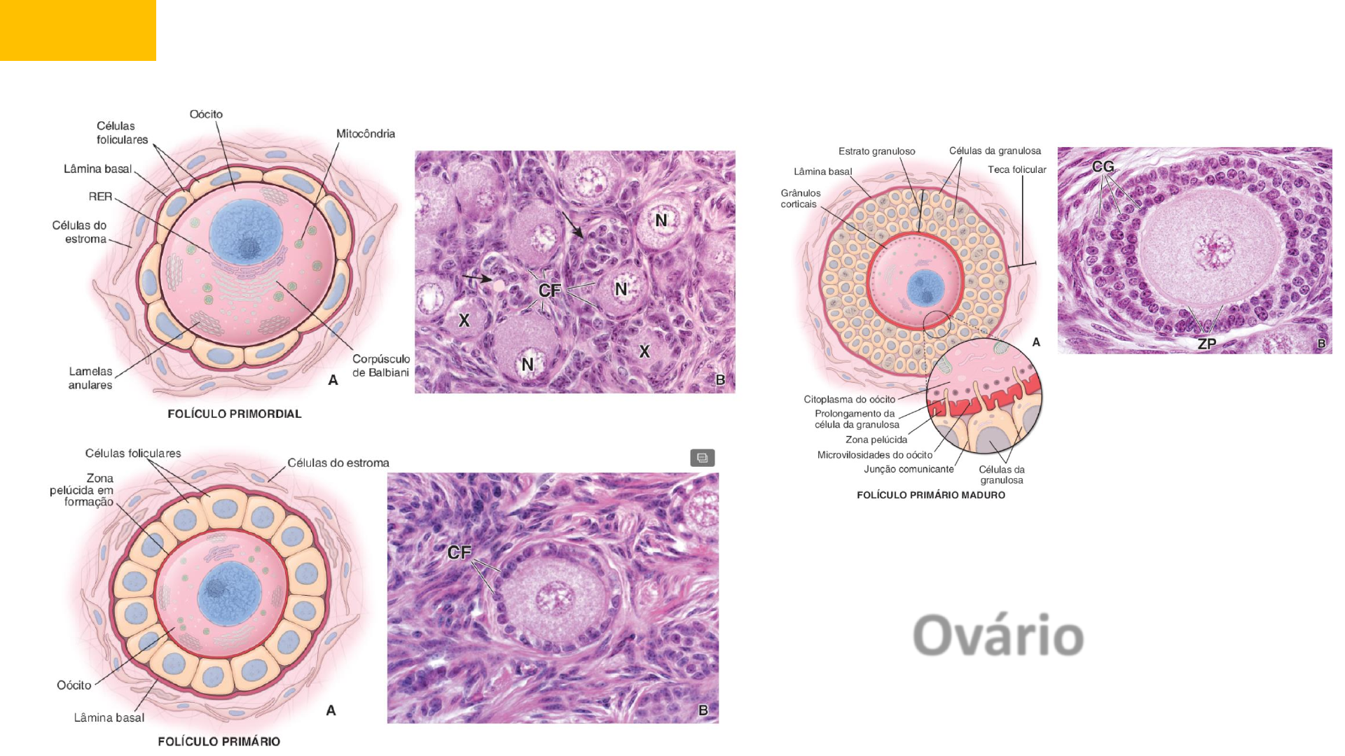 Caso 03 Os ovários desempenham duas funções inter-relacionadas: a gametogênese (produção de gametas) e a esteroidogênese (produção de esteroides). A superfície do ovário é recoberta por uma única camada de células cuboides que, em algumas partes, tornam-se quase pavimentosas. Essa camada celular, conhecida como epitélio germinativo. Uma camada de tecido conjuntivo denso, a túnica albugínea, situa-se entre o epitélio germinativo e o córtex subjacente. Primário multilaminar Ovário Ovário Ovário JUNQUEIRA, L.C.U. & CARNEIRO, J. Histologia Básica. 12ª ed. Rio de Janeiro: Guanabara Koogan, 2013. 524p. ROSS, M.H. WOJCIECH, P. Histologia. Texto e Atlas. 6ª ed. Rio de Janeiro: Guanabara Koogan, 2012. 908p. OVALLE, WK & NAHIRNEY P.C. NETTER. Bases da Histologia. 1ª ed. Rio de Janeiro: Elsevier, 2008. 492p.Profa Adriana Moura Desenho esquemático do ovário Corte da região medular e cortical do ovário. HE, menor aumento Tuba Uterina Útero Útero: fase proliferativa Observe que a camada funcional (CFun) do endométrio é revestida por um epitélio (Ep) simples colunar que tem atividade mitótica (setas). As glândulas (Gland) em crescimento também têm um epitélio (Ep) simples colunar, cujas células se dividem ativamente. O estroma (St) é muito celularizado, como evidenciado pelos numerosos núcleos das células do tecido conjuntivo visíveis neste campo. Observe também o rico suprimento vascular (VS) do estroma do endométrio. Útero: fase secretora A camada funcional do endométrio é revestida por epitélio (Ep) simples colunar, que separa o estroma (St) endometrial do lúmen (L) uterino. Observe que as glândulas (Gland), também compostas de epitélio simples colunar, são mais abundantes que as glândulas na fase folicular . Essas glândulas são mais tortuosas e mais dilatadas, e seu lúmen tem pequena quantidade de secreção (seta). Testículo CL, Células de Leydig Ec, Espermatócitos Eg, Espermatogônias Es, Espermátides L, Lóbulo LP, Lâmina própria NS, Núcleos das células de Sertoli S, Septos de tecido conjuntivo TA, Túnica albugínea VS, Vasos sanguíneos X, Corte tangencial do túbulo, cujo lúmen não se encontra no corte Algarismos romanos, estágios do epitélio do túbulo seminífero Setas, Núcleos das espermátides exibindo alteração inicial em seu formato Sertoli Espermátide tardia Espermatócito primário Espermátide jovem Mioide Espermatogônia Fotomicrografia do ducto do epidídimo humano. revela os dois tipos celulares do epitélio do epidídimo: as células principais e as células basais. São observados estereocílios (setas) que se estendem a partir da superfície apical das células principais. Os núcleos das células basais são esféricos e estão localizados em grande proximidade com a membrana basal, enquanto os núcleos das células principais são cilíndricos e acompanham o formato colunar da célula. O epitélio do ducto é circundado por uma camada de células musculares lisas de arranjo circular. O lúmen do ducto contém numerosos espermatozoides. 250×. Epidídimo Caso 04 Fotomicrografia de uma vagina humana. Esta amostra da parede vaginal corada por hematoxilina e eosina (H-E) em pequeno aumento mostra duas das três camadas da vagina: a camada mucosa e a camada muscular (a camada externa, a adventícia, não está incluída). A camada mucosa consiste em um epitélio estratificado pavimentoso e tecido conjuntivo subjacente. Caracteristicamente, o limite entre tecido epitelial e tecido conjuntivo é muito irregular, com papilas proeminentes que se projetam na superfície inferior do epitélio. A camada muscular é observada apenas em parte; esta consiste em feixes de células musculares lisas de disposição irregular. Além disso, a região profunda do tecido conjuntivo dispõe de um rico suprimento de vasos sanguíneos que irrigam as várias camadas da parede vaginal. 40×. Vagina Aderência do blastocisto ao epitélio endometrial durante os primeiros estágios da implantação. Após 6 dias. Após 7 dias. O sinciciotrofoblastos começa a invadir o endométrio. 1 semana de desenvolvimento Profª Drª Adriana MouraPersaud, T.V. N. Embriologia Clínica.Grupo GEN, 2016. 1 semana • Oocitação. • Quando um oócito é penetrado por um espermatozoide, ele completa a segunda divisão meiótica. Como resultado, um oócito maduro e um segundo corpo polar são formados. O núcleo do oócito maduro constitui o pronúcleo feminino . • Após o espermatozoide entrar no oócito, a cabeça dele se separa da cauda e aumenta para se tornar o pronúcleo masculino. A fecundação se completa quando os pronúcleos masculino e feminino se unem e os cromossomos maternos e paternos se misturam durante a metáfase da primeira divisão mitótica do zigoto. • À medida que o zigoto passa ao longo da tuba uterina em direção ao útero, sofre clivagens (uma série de divisões mitóticas) em várias células menores, os blastômeros. Aproximadamente três dias após a fecundação, uma esfera de 12 ou mais blastômeros (a mórula) entra no útero. • Uma cavidade se forma na mórula, convertendo-a em blastocisto, que é formado pelo embrioblasto, pela cavidade blastocística e pelo trofoblasto. O trofoblasto encapsula o embrioblasto e a cavidade blastocística e depois irá formar estruturas extraembrionárias e a porção embrionária da placenta. • 4 a 5 dias após a fecundação, a zona pelúcida desaparece e o trofoblasto adjacente ao embrioblasto se adere ao epitélio endometrial. • O trofoblasto do polo embrionário se diferencia em duas camadas, uma externa, o sinciciotrofoblasto e outra interna, o citotrofoblasto. O sinciciotrofoblasto invade o epitélio endometrial e o tecido conjuntivo adjacente. Concomitantemente, forma-se uma camada cuboidal de hipoblasto na superfície inferior do embrioblasto. Ao final da primeira semana, o blastocisto está superficialmente implantado no endométrio. Assim que o blastocisto c