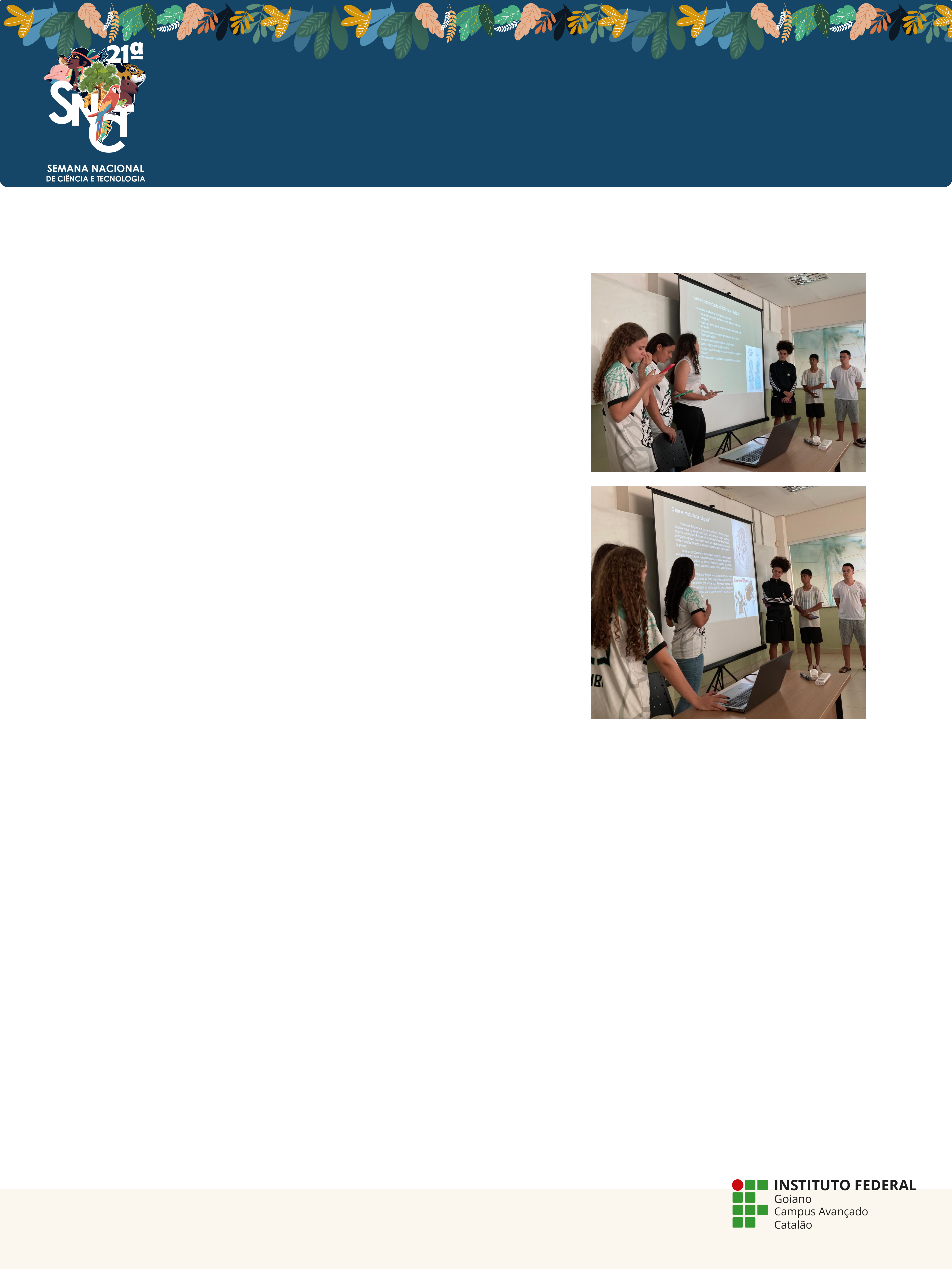 Introdução Referências Intolerância Religiosa BIANCA ALMEIDA BATISTA (DISCENTE DO CURSO INFORMÁTICA, IF GOIANO CAMPUS CATALÃO); BRUNA DE ALMEIDA BERNARDINI (DISCENTE DO CURSO INFORMÁTICA, IF GOIANO CAMPUS CATALÃO); ERICK PEREIRA GOMES DA CRUZ (DISCENTE DO CURSO INFORMÁTICA, IF GOIANO CAMPUS CATALÃO); KALIHEL DO NASCIMENTO GONZALEZ (DISCENTE DO CURSO INFORMÁTICA, IF GOIANO CAMPUS CATALÃO); LORENA CRISTINE PEREIRA DA SILVA (DISCENTE DO CURSO INFORMÁTICA, IF GOIANO CAMPUS CATALÃO); YAGO ENARE DE OLIVEIRA DARTORA (DISCENTE DO CURSO INFORMÁTICA, IF GOIANO CAMPUS CATALÃO). Objetivos Metodologia Considerações Finais INSTITUTO FEDERAL DE EDUCAÇÃO, CIÊNCIA E TECNOLOGIA GOIANO Campus Avançado Catalão Rua Ademar Ferrugem, 840 | Santo Antonio, Catalão-GO CEP: 75701-655 | Fone: (64) 99212-9907 | www.ifgoiano.edu.br/catalao Resultados e discussões TEIXEIRA DE JESUS, Jovenez Lopes ; ROCHA, Lucirene Miguel; MELO, Gustavo De Santana; DA SILVA, Fernanda Gonçalves. INTOLERÂNCIA RELIGIOSA NO BRASIL DE ACORDO COM A CONSTITUIÇÃO FEDERAL DE 1988. Unaerp, 2018. Disponível em: https://www.unaerp.br/revista-cientifica-integrada/edicoes- anteriores/volume-3-edicao-4/2982-rci-intolerancia-religiosa-no-brasil-de- acordo-com-a-constituicao-federal-de-1988-06-2018/file. Acesso em: 30 set. 2024. & III Semana de Arte, Cultura, Esporte e Meio Ambiente Embora existam leis que protejam contra a intolerância religiosa, a conscientização e o respeito mútuo são fundamentais para evitar conflitos e desrespeitos. A manipulação religiosa pode resultar em atos de violência e desumanidade, disfarçados de respeito à fé. Portanto, é essencial promover o entendimento e a convivência pacífica entre diferentes crenças, reconhecendo que as leis servem como um guia para que as pessoas reflitam antes de agir. Foram apresentados trabalhos com os temas: assédio, bullying, saúde mental, xenofobia, racismo e intolerância religiosa. Os alunos se conscientizaram e entenderam a complexidade desses temas. O objetivo é fazer os alunos se conscientizarem e conscientizar outros estudantes e pessoas de fora da instituição de ensino sobre temas sociais que afetam a vida de milhares de pessoas, promovendo o bem estar coletivo, especialmente no que se refere à Intolerância Religiosa. Para a realização das atividades referentes à disciplina “Pojeto Integrador”, a turma foi dividida em grupos e cada grupo ficou responsável pela pesquisa de um tema, para posterior confecção de materiais e postagem no Instagram. Também foram realizados seminários com o intuito de trabalhar o tema em sala de aula e, posteriormente, transpor as informações para o Instagram do Projeto. O Projeto Integrador desenvolvido no 1° ano de Informática, no ano letivo de 2024, busca abordar temas sensíveis presentes no nosso país e conscientizar os alunos sobre a importância do combate a essas situações. Nesse sentido, o tema trabalho foi a Intolerância Religiosa que consiste no ato de descriminar ou ofender, religiões, liturgias e cultos, ou pessoas por conta de suas crenças e práticas religiosas. No Brasil, a intolerância religiosa em sua maior parte ocorre contra religiões de matriz africana , como o candomblé e umbanda sendo as maiores vítimas.