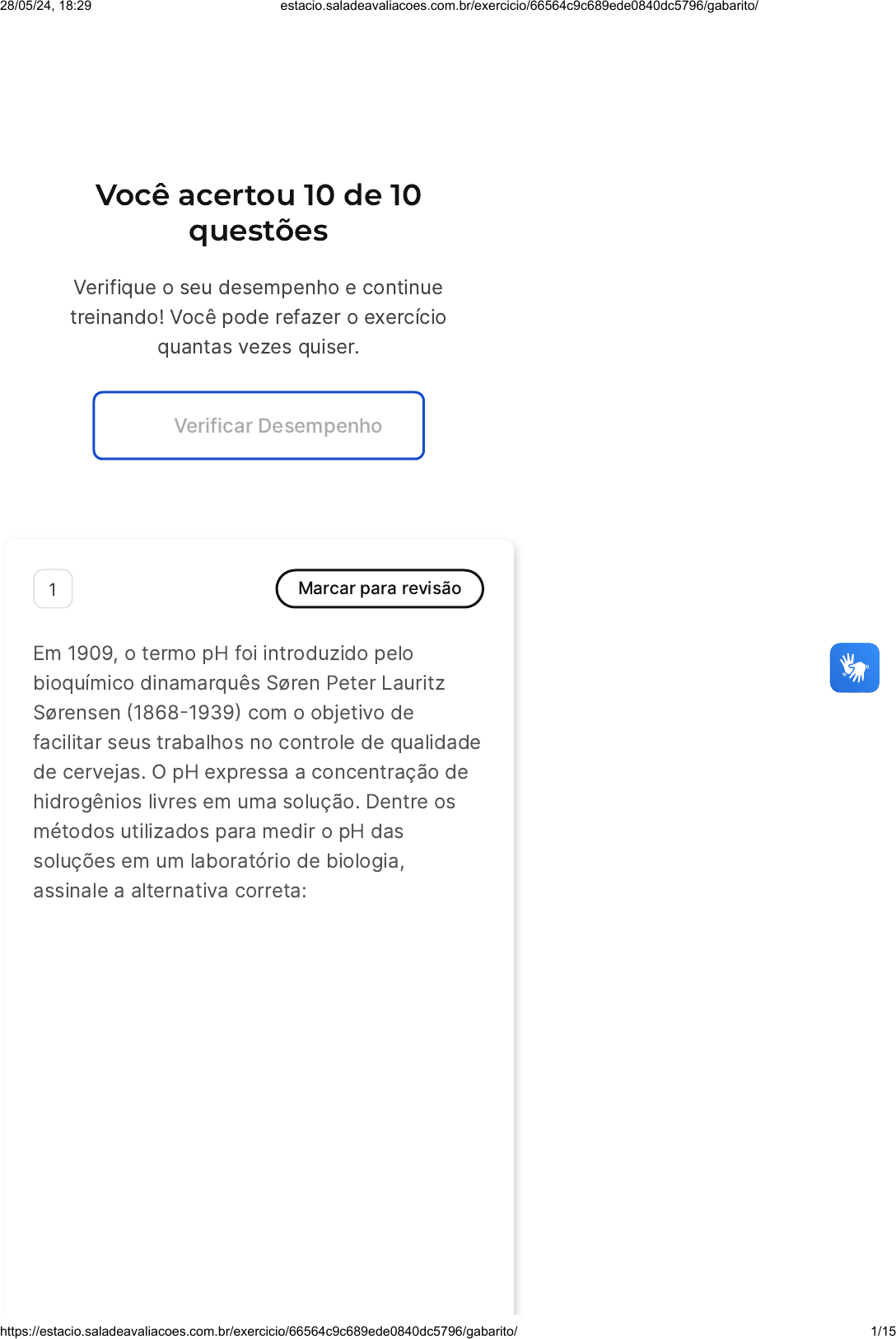 Você acertou 10 de 10 questões Verifique o seu desempenho e continue treinando! Você pode refazer o exercício quantas vezes quiser. Verificar Desempenho 1 Marcar para revisão Em 1909, o termo pH foi introduzido pelo bioquímico dinamarquês Søren Peter Lauritz Sørensen �1868�1939� com o objetivo de facilitar seus trabalhos no controle de qualidade de cervejas. O pH expressa a concentração de hidrogênios livres em uma solução. Dentre os métodos utilizados para medir o pH das soluções em um laboratório de biologia, assinale a alternativa correta: 28/05/24, 18:29 estacio.saladeavaliacoes.com.br/exercicio/66564c9c689ede0840dc5796/gabarito/ https://estacio.saladeavaliacoes.com.br/exercicio/66564c9c689ede0840dc5796/gabarito/ 1/15 A B C D E A utilização das fitas indicadoras de pH que possuem mais de uma substância indicadora é aconselhada quando temos a necessidade de verificar o valor exato de pH. Os potenciômetros (ou pHmetros) são sensíveis para a aferição do pH, pois convertem a diferença de potencial elétrico mensurada pelo eletrodo à escala de pH. As substâncias e fitas indicadoras de pH e o potenciômetro (ou pHmetro) são métodos conhecidos como colorimétricos para aferição do pH. Fenolftaleína, azul de bromotimol e azul de tornassol não podem ser utilizadas como substâncias indicadoras de pH. Para aferirmos o pH com maior exatidão, temos de utilizar tanto os métodos colorimétricos quanto o potenciômetro (ou pHmetro). Resposta correta Parabéns, você selecionou a alternativa correta. Confira o gabarito comentado! Gabarito Comentado A alternativa correta é a letra B. Os potenciômetros, também conhecidos como pHmetros, são instrumentos muito utilizados em laboratórios para a medição 28/05/24, 18:29 estacio.saladeavaliacoes.com.br/exercicio/66564c9c689ede0840dc5796/gabarito/ https://estacio.saladeavaliacoes.com.br/exercicio/66564c9c689ede0840dc5796/gabarito/ 2/15 A B C D E do pH. Eles funcionam convertendo a diferença de potencial elétrico, que é mensurada pelo eletrodo, em uma escala de pH. Isso permite uma leitura precisa e sensível do pH da solução em análise, tornando-os uma ferramenta essencial para a aferição do pH. 2 Marcar para revisão Considerando-se um átomo que apresente número de massa igual ao dobro do número atômico, é correto afirmar que Possui mais elétrons do que nêutrons. Possui a mesma quantidade de elétrons, nêutrons e prótons. Possui duas vezes mais prótons do que nêutrons. Possui duas vezes mais nêutrons do que prótons. O número atômico é o dobro do número de nêutrons. Resposta correta Parabéns, você selecionou a alternativa correta. Confira o gabarito comentado! 28/05/24, 18:29 estacio.saladeavaliacoes.com.br/exercicio/66564c9c689ede0840dc5796/gabarito/ https://estacio.saladeavaliacoes.com.br/exercicio/66564c9c689ede0840dc5796/gabarito/ 3/15 A B C Gabarito Comentado Em um átomo, o número de massa é a soma do número de prótons e nêutrons. O número atômico, por sua vez, é o número de prótons. Se o número de massa é o dobro do número atômico, isso significa que o número de prótons e nêutrons é igual, pois a soma deles (número de massa) é o dobro do número de prótons (número atômico). Além disso, em um átomo neutro, o número de elétrons é igual ao número de prótons. Portanto, a alternativa correta é a que afirma que o átomo possui a mesma quantidade de elétrons, nêutrons e prótons. 3 Marcar para revisão Dentre todas as propriedades presente nos átomos estão o número de massa e o número atômico do elemento, analise a suposição a seguir: Um átomo de um elemento químico possui 83 prótons, 83 elétrons e 126 nêutrons. Qual é, respectivamente, o número atômico e o número de massa desse átomo? 83 e 209. 83 e 43. 83 e 83. 28/05/24, 18:29 estacio.saladeavaliacoes.com.br/exercicio/66564c9c689ede0840dc5796/gabarito/ https://estacio.saladeavaliacoes.com.br/exercicio/66564c9c689ede0840dc5796/gabarito/ 4/15 D E 209 e 83. 43 e 83. Resposta correta Parabéns, você selecionou a alternativa correta. Confira o gabarito comentado! Gabarito Comentado O número atômico é a identidade de um átomo, ou seja, é ele que diferencia o átomo de oxigênio do átomo de platina, por exemplo. É por meio dele que os elementos químicos (conjunto de um mesmo tipo de átomo) são ordenados na tabela periódica. Número atômico é igual número de prótons: 83. Número de massa: Essa propriedade expressa o somatório do número de prótons �Z� e o número de nêutrons de determinado elemento, sendo sua unidade de medida u (unidade de massa) ou g/mol. Como os elétrons apresentam massa muito pequena (cerca de 1.840 vezes menor que a massa dos prótons e nêutrons), assume- se que ela é desprezível e, por isso, não está inclusa no cálculo da soma das massas. Logo: A � Z � n: 83� 126�209. 4 Marcar para revisão A química é a ciência que estuda composição, estrutura, propriedades da matéria e as mudanças sofridas durante as reações químicas. Diante do contexto avalie o texto 28/05/24, 18:29 estacio.saladeavaliacoes.com.br/exercicio/66564c9c689ede0840dc5796/gabarito/ https://estacio.saladeavaliacoes.com.br/exercicio/66564c9c689ede0840dc5796/gabarito/ 5/15 A B C D E abaixo e assinale a alternativas com as palavras que completam as lacunas: "A química ___________ é a parte que se dedica a elementos carbono como propriedade característica, conhecida como química dos seres vivos. A química _______________é a parte que se dedica a composto direto e indiretamente de origem mineral, conhecida como a química dos não seres vivos." Química do Carbono e Química Quântica Química Orgânica e Química Inorgânica Química Inorgânica e Química Orgânica Química do Carbono e Química Inorgânica Química Quântica e Química Orgânica Resposta correta Parabéns, você selecionou a alternativa correta. Confira o gabarito comentado! Gabarito C