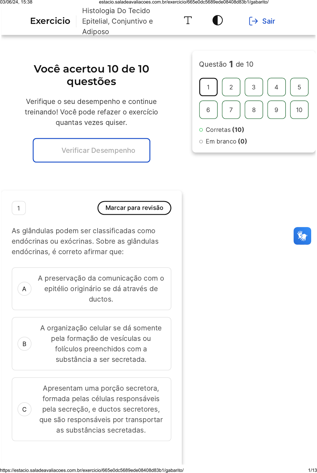 Você acertou 10 de 10 questões Verifique o seu desempenho e continue treinando! Você pode refazer o exercício quantas vezes quiser. Verificar Desempenho A B C 1 Marcar para revisão As glândulas podem ser classificadas como endócrinas ou exócrinas. Sobre as glândulas endócrinas, é correto afirmar que: A preservação da comunicação com o epitélio originário se dá através de ductos. A organização celular se dá somente pela formação de vesículas ou folículos preenchidos com a substância a ser secretada. Apresentam uma porção secretora, formada pelas células responsáveis pela secreção, e ductos secretores, que são responsáveis por transportar as substâncias secretadas. Questão 1 de 10 Corretas �10� Em branco �0� 1 2 3 4 5 6 7 8 9 10 Exercicio Histologia Do Tecido Epitelial, Conjuntivo e Adiposo Sair 03/06/24, 15:38 estacio.saladeavaliacoes.com.br/exercicio/665e0dc5689ede08408d83b1/gabarito/ https://estacio.saladeavaliacoes.com.br/exercicio/665e0dc5689ede08408d83b1/gabarito/ 1/13 D E São glândulas especializadas somente na secreção de complexos de carboidratos e proteínas. As substâncias secretadas são liberadas na corrente sanguínea e transportadas até seu local de ação. Resposta correta Parabéns, você selecionou a alternativa correta. Confira o gabarito comentado! Gabarito Comentado As glândulas endócrinas são responsáveis pela produção de hormônios, que são substâncias químicas que regulam diversas funções do organismo. Esses hormônios são liberados diretamente na corrente sanguínea e transportados até o local onde irão atuar. Diferentemente das glândulas exócrinas, as endócrinas não possuem ductos para conduzir a substância secretada, pois a liberação ocorre diretamente no sangue. 2 Marcar para revisão O tecido conjuntivo embrionário é dividido em tecido mucoide, presente no cordão umbilical, e mesênquima, no embrião. O mesênquima é a origem dos tecidos conjuntivos e é formado pelas células mesenquimais. São características dessas células: 03/06/24, 15:38 estacio.saladeavaliacoes.com.br/exercicio/665e0dc5689ede08408d83b1/gabarito/ https://estacio.saladeavaliacoes.com.br/exercicio/665e0dc5689ede08408d83b1/gabarito/ 2/13 A B C D E São células que apresentam muita coesão entre si. São células fusiformes com núcleo reduzido. São células que apresentam poucos prolongamentos citoplasmáticos. Originam-se no endoderma, folheto mais interno, de onde partem e penetram nos órgãos. Encontram-se imersas em uma matriz viscosa com poucas fibras. Resposta correta Parabéns, você selecionou a alternativa correta. Confira o gabarito comentado! Gabarito Comentado As células mesenquimais, que formam o mesênquima - a origem dos tecidos conjuntivos no embrião - possuem como característica estar imersas em uma matriz viscosa com poucas fibras. Essa matriz viscosa proporciona um ambiente ideal para o desenvolvimento e a diferenciação dessas células. 3 Marcar para revisão 03/06/24, 15:38 estacio.saladeavaliacoes.com.br/exercicio/665e0dc5689ede08408d83b1/gabarito/ https://estacio.saladeavaliacoes.com.br/exercicio/665e0dc5689ede08408d83b1/gabarito/ 3/13 A B C D E O tecido conjuntivo possui três tipos de fibras: colágenas, reticulares e elásticas. A seguir são listadas algumas características dessas fibras. Assinale a alternativa que não caracteriza de forma correta essas fibras: As fibras reticulares são constituídas principalmente por colágeno do tipo II, que formam uma extensa e delicada rede. O colágeno do tipo IV representa um dos principais componentes da lâmina basal. As fibras oxitalânicas não têm elasticidade, mas são altamente resistentes a forças de tração. As fibras oxitalânicas, elaunínicas e elásticas representam estágios sucessivos de desenvolvimento. O colágeno do tipo I é o mais abundante e amplamente distribuído no organismo. Resposta correta Parabéns, você selecionou a alternativa correta. Confira o gabarito comentado! Gabarito Comentado As fibras reticulares são formadas principalmente por colágeno do tipo III, e não do tipo II. Essas fibras formam uma rede delicada que suporta as células em 03/06/24, 15:38 estacio.saladeavaliacoes.com.br/exercicio/665e0dc5689ede08408d83b1/gabarito/ https://estacio.saladeavaliacoes.com.br/exercicio/665e0dc5689ede08408d83b1/gabarito/ 4/13 A B C D E muitos tecidos, como o tecido linfático e o fígado. Portanto, a afirmação de que as fibras reticulares são constituídas principalmente por colágeno do tipo II é falsa. 4 Marcar para revisão Os ácinos serosos e os túbulos mucosos representam unidades glandulares muito comuns no organismo e encontram-se presentes em vários órgãos. A respeito do tema, analise as afirmativas a seguir: I. Os túbulos mucosos são estruturas alongadas, tubulares, frequentemente ramificadas. II. Os ácinos serosos são formados por células colunares, com lúmen dilatado. III. A região apical das células acinosas é ocupada por grânulos de secreção. É correto o que se afirma em: I e II I e III II e III II III Resposta correta 03/06/24, 15:38 estacio.saladeavaliacoes.com.br/exercicio/665e0dc5689ede08408d83b1/gabarito/ https://estacio.saladeavaliacoes.com.br/exercicio/665e0dc5689ede08408d83b1/gabarito/ 5/13 A B C Parabéns, você selecionou a alternativa correta. Confira o gabarito comentado! Gabarito Comentado A resposta certa é: I e III. Os ácinos serosos são estruturas globulares, com lúmen dilatado, e as células acinosas são formadas por células colunares, com grânulos de secreção na região apical. ----- 5 Marcar para revisão O tecido conjuntivo propriamente dito pode ser dividido em tecido frouxo e denso. Analise as afirmativas abaixo e assinale a alternativa correta a respeito do tecido conjuntivo dito frouxo. Apresenta predominância de células, como fibroblastos e macrófagos e poucas fibras. Apresenta consistência flexível e altamente resistente a trações. É