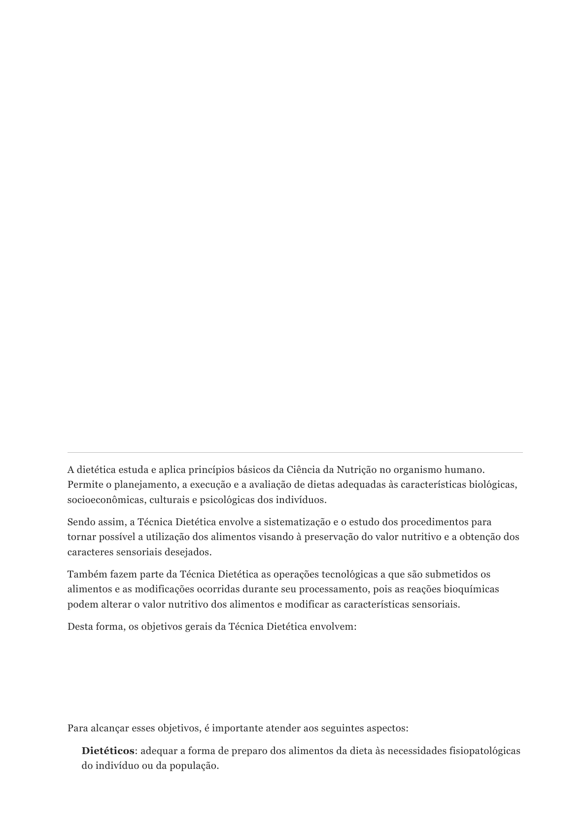 Lição 02 Introdução à técnica dietética e ficha técnica de preparo Técnica Dietética Começar a aula 1. Introdução A dietética estuda e aplica princípios básicos da Ciência da Nutrição no organismo humano. Permite o planejamento, a execução e a avaliação de dietas adequadas às características biológicas, socioeconômicas, culturais e psicológicas dos indivíduos. Sendo assim, a Técnica Dietética envolve a sistematização e o estudo dos procedimentos para tornar possível a utilização dos alimentos visando à preservação do valor nutritivo e a obtenção dos caracteres sensoriais desejados. Também fazem parte da Técnica Dietética as operações tecnológicas a que são submetidos os alimentos e as modificações ocorridas durante seu processamento, pois as reações bioquímicas podem alterar o valor nutritivo dos alimentos e modificar as características sensoriais. Desta forma, os objetivos gerais da Técnica Dietética envolvem: • Conhecer as diferentes técnicas que se aplicam ao preparo dos alimentos; • Garantir condições higiênico-sanitárias; • Atender aos aspectos sensoriais e econômicos; • Preservar o valor nutricional dos alimentos. Para alcançar esses objetivos, é importante atender aos seguintes aspectos: Dietéticos: adequar a forma de preparo dos alimentos da dieta às necessidades fisiopatológicas do indivíduo ou da população. Digestivos: modificar os alimentos por meio de processos culinários a fim de facilitar a digestão (remolho do feijão, cocção da carne, amaciantes de carnes naturais, separação de partes não comestíveis ou em pedaços menores). Nutritivo: selecionar os melhores métodos de preparo de alimentos para otimização e conservação máxima do seu valor nutritivo (ex.: ofertar salada de frutas ou suco de laranja para maior aporte de vitamina C?). Higiênico: prevenir a ação de fatores externos, como microrganismos, que possam prejudicar a qualidade dos alimentos e, ao mesmo tempo, prolongar a sua vida útil. Sensorial: apresentar o alimento de forma que desperte todos os sentidos, não apenas o paladar, mas também a aparência, odor, textura e audição. Operacional: preparar e organizar espaços físicos, materiais, equipamentos e utensílios; planejar os cardápios e capacitar o pessoal selecionado para o trabalho. Econômico: escolher as técnicas a serem empregadas no preparo de alimentos considerando os custos e os recursos humanos, materiais e financeiros disponíveis. Para isso, é importante ter conhecimento de safra e disponibilidade no mercado; armazenamento correto; pré-preparo sem desperdício; aplicação de técnicas culinárias que preservem o valor nutritivo e melhoram a aceitabilidade do alimento. Susceptibilidade dos alimentos. PARA REFLETIR: O sucesso de uma boa formulação não depende simplesmente da receita (roteiro), mas também da qualidade da matéria-prima e de como se trabalha com os ingredientes, a fim de se obter melhores resultados, inclusive conservando-lhes o valor nutritivo! 2. Métodos de pré-preparo de alimentos O Pré-Preparo é o conjunto de operações as quais são submetidos os alimentos e compreendem as seguintes operações básicas: misturar, higienizar, descascar e fracionar. 2.1. Métodos de divisão de alimentos no pré- preparo Divisão simples: o alimento é fracionado em partes, porém, aparentemente é mantido como um todo (ex.: cortar/picar, moer e triturar). Divisão com separação de partes: ao fracionar o alimento em partes menores, cada parte conterá diferentes componentes. É possível separar 2 líquidos, 2 sólidos ou 1 sólido e 1 líquido. • Separação de dois líquidos: ◦ Decantar: retirada da gordura do caldo da carne. ◦ Centrifugar: retirada do creme ou gordura do leite. ◦ Destilar: cachaça para separação da água e álcool. • Separação de dois sólidos: ◦ Descascar ou pelar: retirada da casca da laranja. ◦ Peneirar: farinha de trigo, açúcar de confeiteiro para retirada de grânulos com tamanhos discrepantes. • Separação de um sólido e um líquido: ◦ Espremer: laranja, limão para obtenção do suco. ◦ Filtrar ou coar: café para remoção das substâncias possíveis de extrair do grão. ◦ Sedimentar: água com areia. ◦ Centrifugar: leite para separação da gordura, sangue para separação das hemácias do plasma. Tabela 1. Influência da divisão sobre os alimentos Características Divisão Simples Divisão com separação Valor Nutritivo Não prejudicado. Métodos: corte, trituração, homogeneização. Diminui.Métodos: moagem, peladura, filtração, centrifugação. Apresentação Pouca melhora. Muita melhora. Condição sanitária Não é modificado. É melhorado. Características Divisão Simples Divisão com separação Digestibilidade Aumentada: maior superfície de contato com sucos digestivos. Aumento maior: expansão da superfície de exposição do alimento e separação de partes não comestíveis. Preço Elevado por gastos Operacionais. + elevado por gastos operacionais e retirada de resíduos. Higiene + exposto contaminação. + exposto contaminação. 2.2. Métodos de união dos alimentos • Misturar: ingredientes facilmente miscíveis. Ex.: farinha de trigo e de arroz. • Bater: ingredientes de difícil mistura. Ex.: massa de bolo (manteiga, ovos, farinha etc.). • Amassar, sovar: preparo de massas para desenvolvimento do glúten. Ex.: massa de pão. 3. Métodos de preparo de alimentos O Preparo ou Cocção dos alimentos envolve a aplicação do calor proveniente de uma fonte de produção (combustível) que se transmite ao alimento para: • Manter ou melhorar o valor nutricional: perda de componentes hidrossolúveis que estão relacionados à quantidade de água e tempo. • Favorecer a digestibilidade: tornar o alimento possível de ser digerido pelas enzimas presente no nosso organismo. • Alteração da composição química: reações químicas e/ou enzimáticas qu