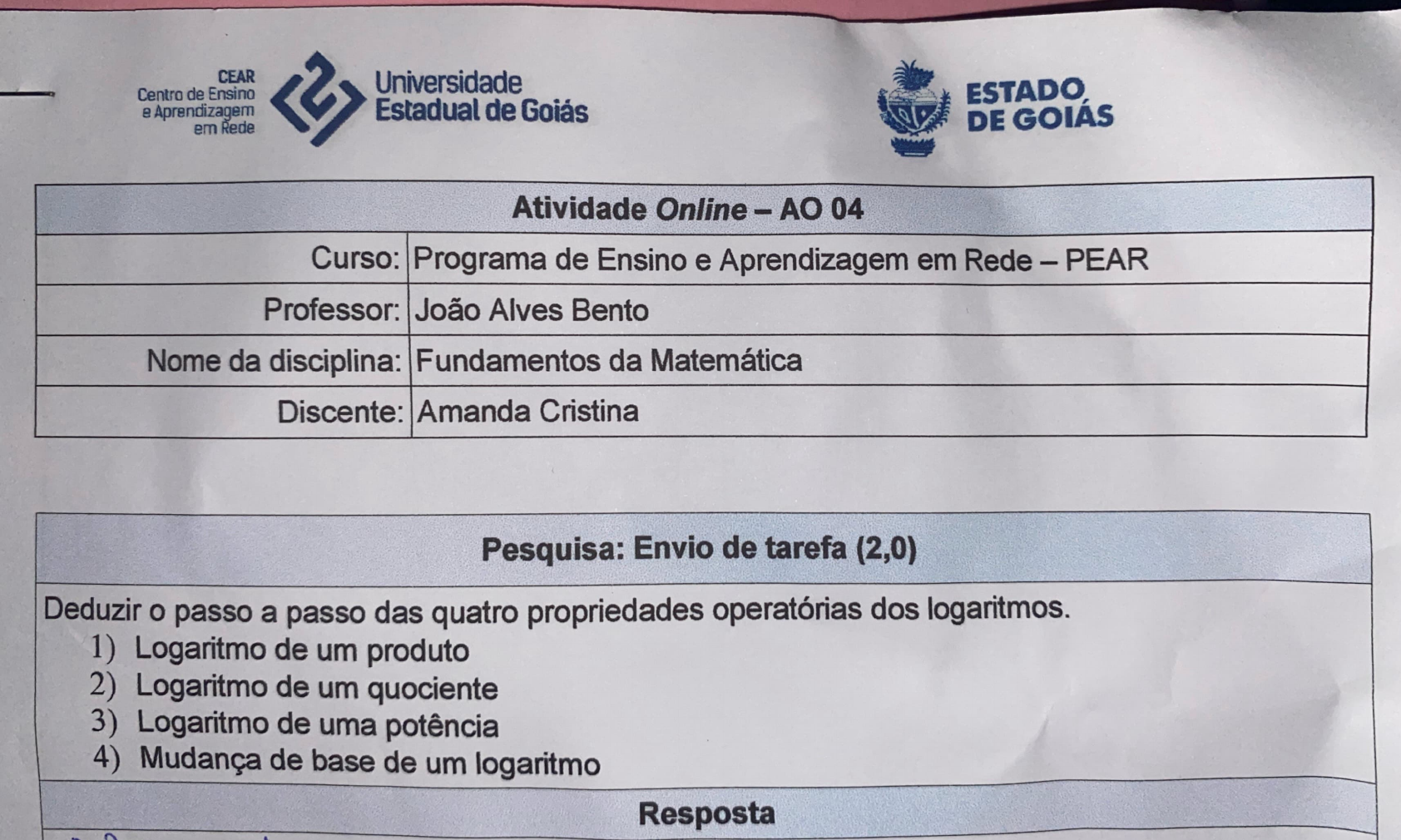 Deduzir o passo a passo das quatro propriedades operatórias dos logaritmos.