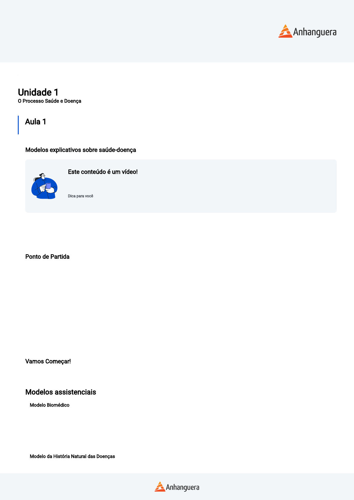 Disciplina SAÚDE COLETIVA Unidade 1 O Processo Saúde e Doença Aula 1 Modelos Explicativos sobre Saúde-Doença Modelos explicativos sobre saúde-doença Este conteúdo é um vídeo! Para assistir este conteúdo é necessário que você acesse o AVA pelo computador ou pelo aplicativo. Você pode baixar os vídeos direto no aplicativo para assistir mesmo sem conexão à internet. Dica para você Aproveite o acesso para baixar os slides do vídeo, isso pode deixar sua aprendizagem ainda mais completa. Olá, estudante! Nesta videoaula, você conhecerá alguns modelos assistenciais a �m de uma compreensão mais ampla do processo saúde-doença. Além disso, você entenderá a distinção entre Saúde Pública e Saúde Coletiva, que embora relacionadas, apresentam diferenças. Essas abordagens integradas enriquecem a prática pro�ssional, capacitando-o na implementação de intervenções e�cazes em prol da qualidade de vida. Prepare-se para essa jornada de conhecimento. Vamos lá? Ponto de Partida Estudante, os modelos assistenciais referem-se às abordagens organizacionais e estratégias implementadas no sistema de saúde para fornecer cuidados aos indivíduos, sendo fundamentais para determinar como os serviços de saúde são entregues e coordenados. Dentre eles, o Modelo da História Natural da Doença é uma abordagem teórica que descreve o curso evolutivo típico de uma condição de saúde especí�ca, desde a fase de suscetibilidade até as possíveis consequências, incluindo a recuperação ou a cronicidade. Nesse caso, considerando esse modelo em relação à hipertensão arterial, como podem ser exploradas estratégias de prevenção primária, secundária e terciária? Adicionalmente, iremos abordar os conceitos e as diferenças entre Saúde Pública e Saúde Coletiva, campos inter-relacionados que buscam promover e proteger a saúde da população como um todo, mas que apresentam distinções que podem ser sutis. À vista disso, os temas que serão abordados estabelecem uma base essencial para aprofundar nossa compreensão entre o equilíbrio saúde e doença e delinear as nuances entre a Saúde Pública e Saúde Coletiva. Que essa jornada de aprendizado inspire sua prática diária, tornando-a signi�cativa e transformadora. Vamos começar? Vamos Começar! Iniciaremos, de forma sucinta, abordando alguns modelos assistenciais a �m de ajudá-lo a compreender as semelhanças e diferenças nas concepções de saúde e doença e, em seguida, iremos conhecer os conceitos e as diferenças entre Saúde Pública e Saúde Coletiva. Modelos assistenciais O Modelo Biomédico caracteriza-se como uma falha nos mecanismos de adaptação do organismo, resultando em uma perturbação na estrutura ou função de um órgão, sistema ou do organismo como um todo, descrevendo o modelo como uma Teoria Mecanicista, que vê o homem como uma máquina, o médico como um mecânico e a doença como um defeito na máquina. Imagine que um indivíduo esteja com Infecção do Trato Urinário (ITU), causada pela bactéria Escherichia coli (E. coli). O médico identi�ca os sintomas, realiza exames laboratoriais para con�rmar a presença da bactéria e prescreve antibióticos para eliminar o agente patogênico. Através desse exemplo, é possível observar que a abordagem desse modelo é direcionada na patogenia e terapêutica, além de ser um modelo assistencial individual, curativo, centrado no médico, especializado e hospitalocêntrico (Moreira et al., 2018; Gerolin, 2016; Cruz, 2012). O Modelo da História Natural das Doenças (HND) foi sistematizado por Leavell e Clark em 1965, de�nindo-o como: Disciplina SAÚDE COLETIVA Interrelações do agente, do suscetível e do meio ambiente (tríade ecológica) que afetam o processo global e seu desenvolvimento, desde as primeiras forças que criam o estímulo patológico no meio ambiente, ou em qualquer outro lugar, passando pela resposta do homem ao estímulo, até as alterações que levam a um defeito, invalidez ou morte. Há dois períodos da HND e quatro fases: no período pré-patogênico, há a fase de suscetibilidade, em que há presença de condições que favorecem o aparecimento da doença (genéticos, estilo de vida); e a fase pré-clínica, em que embora o indivíduo não apresente sintomas e sinais, já existem alterações patológicas (hipertensão arterial assintomática, hipercolesterolemia), podendo evoluir para a cura ou para a próxima fase do outro período, o patogênico. Na primeira fase desse período, designada fase clínica, há o aparecimento de sinais e sintomas, cuja gravidade é variável, podendo evoluir para a cura total sem sequelas, para o óbito ou para a fase seguinte, a da incapacidade residual, caracterizada pela recuperação com persistência de sequelas ou incapacidade (Demarzo, 2012). O modelo HND apresenta três níveis de prevenção: primário, secundário e terciário. O nível primário é apresentado como uma das ações à promoção da saúde, com ações dirigidas à manutenção da saúde e as medidas são adotadas no período pré-patogênico, ou seja, trata-se da prevenção da ocorrência do período patogênico, de evitar a ocorrência da doença. Na prevenção secundária, as ações são orientadas ao período patogênico, enquanto a doença está em curso, visando a prevenção da evolução do processo patológico e prevenção da reincidência da doença, de suas complicações/sequelas e do óbito. Na prevenção terciária, as ações são dirigidas à fase �nal do processo e visam desenvolver a capacidade residual do indivíduo, com ajustes às limitações decorrentes do processo patológico. Dessa forma, é importante ressaltar que nesse modelo o foco central é a prevenção da doença. Assim, o modelo trata, na verdade, de doença, e não de saúde (Verdi et al., 2016; Cruz, 2012). O Modelo da Determinação Social da Doença apresenta uma nova forma de ver o processo saúde