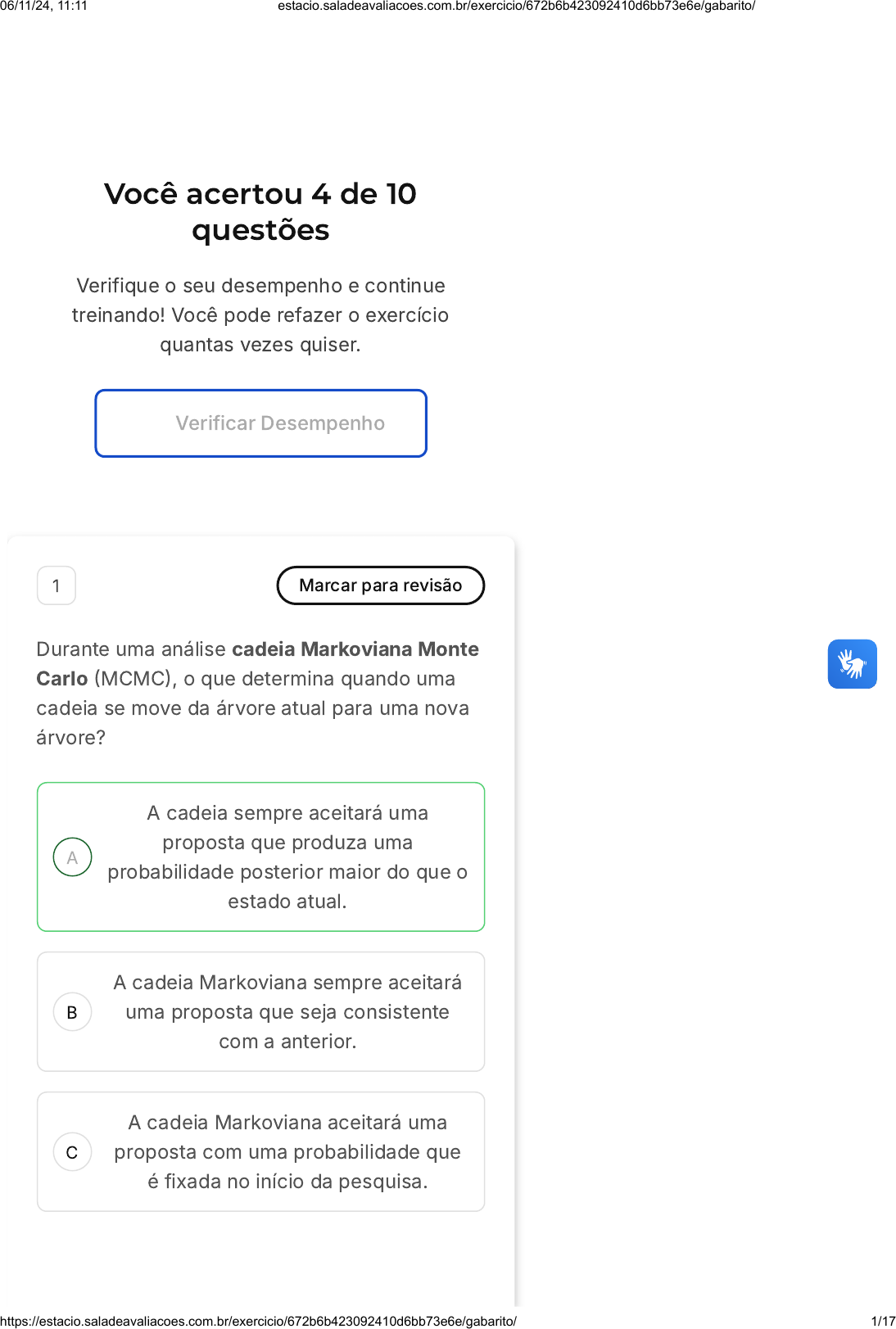 Você acertou 4 de 10 questões Verifique o seu desempenho e continue treinando! Você pode refazer o exercício quantas vezes quiser. Verificar Desempenho A B C 1 Marcar para revisão Durante uma análise cadeia Markoviana Monte Carlo �MCMC�, o que determina quando uma cadeia se move da árvore atual para uma nova árvore? A cadeia sempre aceitará uma proposta que produza uma probabilidade posterior maior do que o estado atual. A cadeia Markoviana sempre aceitará uma proposta que seja consistente com a anterior. A cadeia Markoviana aceitará uma proposta com uma probabilidade que é fixada no início da pesquisa. 06/11/24, 11:11 estacio.saladeavaliacoes.com.br/exercicio/672b6b423092410d6bb73e6e/gabarito/ https://estacio.saladeavaliacoes.com.br/exercicio/672b6b423092410d6bb73e6e/gabarito/ 1/17 D E A cadeia rejeitará uma proposta que produza uma probabilidade de log maior do que o estado atual. A probabilidade de aceitar uma proposta depende da razão entre as probabilidades posteriores entre o estado atual e proposto. Resposta incorreta Opa! A alternativa correta é a letra A. Confira o gabarito comentado! Gabarito Comentado Gabarito: A cadeia sempre aceitará uma proposta que produza uma probabilidade posterior maior do que o estado atual. Justificativa: Na geração de uma cadeia Markoviana Monte Carlo �MCMC�, o novo estado é sempre aceito se a probabilidade posterior, ou log, for maior que a do estado atual. Isso significa que a cadeia MCMC está sempre buscando otimizar a probabilidade, movendo-se para estados com maior probabilidade. A probabilidade não é fixada no início e nem é calculada por uma razão. Embora seja raro, a cadeia MCMC pode aceitar um ponto com probabilidade inferior ao anterior, mas isso ocorre apenas em circunstâncias específicas e não é a norma. 2 Marcar para revisão A seguir são apresentadas diferentes árvores filogenéticas (de A ao E�. 06/11/24, 11:11 estacio.saladeavaliacoes.com.br/exercicio/672b6b423092410d6bb73e6e/gabarito/ https://estacio.saladeavaliacoes.com.br/exercicio/672b6b423092410d6bb73e6e/gabarito/ 2/17 A B C Imagem: Leandro Pederneiras Após analisar a figura, assinale a alternativa que retrata de forma correta a interpretação dos gráficos. Os ramos curvos das divergências do gráfico a significam a idade evolutiva retrocedendo para a raiz. No gráfico b, ramos mais longos significam mais longo tempo decorrido em relação aos ramos curtos. No tipo de apresentação do gráfico c a raiz é identificada através do clado com maior número de ramos emergindo. 06/11/24, 11:11 estacio.saladeavaliacoes.com.br/exercicio/672b6b423092410d6bb73e6e/gabarito/ https://estacio.saladeavaliacoes.com.br/exercicio/672b6b423092410d6bb73e6e/gabarito/ 3/17 D E Os dois pontos indicados pelas setas na figura d, apesar de separados, possuem idades ancestrais idênticas. Podemos interpretar dessa forma porque os pontos estão na mesma altura no gráfico. No gráfico e, podemos dizer que o ponto indicado pela seta laranja é pelo menos duas vezes mais antigo que o ponto indicado pela seta azul. Resposta incorreta Opa! A alternativa correta é a letra E. Confira o gabarito comentado! Gabarito Comentado Gabarito: No gráfico e, podemos dizer que o ponto indicado pela seta laranja é pelo menos duas vezes mais antigo que o ponto indicado pela seta azul. Justificativa: No gráfico E, podemos dizer que o ponto indicado pela seta laranja na alternativa E é pelo menos duas vezes mais antigo que o ponto indicado pela seta azul porque, ao analisar a escala de tempo, logo abaixo do gráfico, nota-se a seta azul em torno de 50 milhões de anos �Ma� e a seta laranja em torno de 100 Ma. No gráfico A, uma árvore filogenética em formato circular apresentam comprimento ramos iguais, sem escala de tempo. No gráfico B, os comprimentos mais longos dos ramos indicam um maior número de mudança evolutiva. O gráfico C é um tipo de gráfico não enraizado, ou seja, aquele que somente nos mostra as relações entre espécies e suas aproximações, mas sem a raiz o que indica na árvore um ancestral 06/11/24, 11:11 estacio.saladeavaliacoes.com.br/exercicio/672b6b423092410d6bb73e6e/gabarito/ https://estacio.saladeavaliacoes.com.br/exercicio/672b6b423092410d6bb73e6e/gabarito/ 4/17 A B C D E comum. O Gráfico D apenas representa a relação entre as espécies, sem escala de tempo, então não podemos avaliar se os dois ancestrais apresentam a mesma idade evolutiva. 3 Marcar para revisão Existem diversas metodologias para buscar a melhor árvore filogenética. Todas estas abordagens são fundamentais para o avanço da compreensão da evolução. Dentre estes métodos está a aplicação do neighbor-joining. Qual é a melhor definição desta técnica? Uma árvore é estimada com base na proximidade dos táxons em uma matriz de dados. Uma busca em árvore é conduzida para encontrar a árvore que minimiza a diferença entre as distâncias observadas e previstas. A árvore mais curta é encontrada sob a suposição de que há uma árvore mais curta. Um protocolo para adicionar táxons a uma árvore construída por parcimônia ou máxima verossimilhança. Um algoritmo rápido que encontrará uma árvore com base em distâncias entre pares. 06/11/24, 11:11 estacio.saladeavaliacoes.com.br/exercicio/672b6b423092410d6bb73e6e/gabarito/ https://estacio.saladeavaliacoes.com.br/exercicio/672b6b423092410d6bb73e6e/gabarito/ 5/17 A B Resposta incorreta Opa! A alternativa correta é a letra E. Confira o gabarito comentado! Gabarito Comentado O método neighbor-joining é um algoritmo rápido que busca encontrar uma árvore filogenética com base nas distâncias entre pares de táxons. Ele utiliza a distância genética, calculada a partir de uma matriz táxon/caracter, para construir uma árvore. A árvore escolhida é aquela que minimiza a diferença entre as distâncias na matriz e as previstas pela árvore. Este método realiza uma série de cálculos na matriz a partir