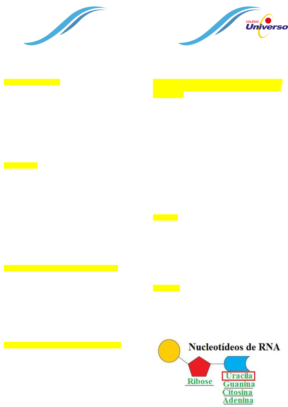 BIOLOGIA - FGB Cosmy da Cruz 1ª série REVISÃO 3º avaliação – PA1 (Fixação 01) A produção de uma proteína é processada basicamente em duas fases. Observando o esquema abaixo, encontre a alternativa correspondente: Gene (DNA) → RNA → Proteínas a) Transmissão; Tradução b) Transcrição; Tradução c) Tradução; Transcrição d) Transcrição; Transcrição e) Tradução; Tradução (Fixação 02) Considere um RNA transportador cujo anticódon é CUG. O códon correspondente no RNA mensageiro e a trinca de nucleotídeos na fita do DNA que é transcrita são, respectivamente: a) CTG e GAC. b) TAC e GUC. c) AUT e CAG. d) CUG e CTG. e) GAC e CTG. (Fixação 03) Os códons UGC, UAU, GCC e AGC codificam, respectivamente, os aminoácidos cisteína, tirosina, alanina e serina; o códon UAG é terminal, ou seja, indica a interrupção da tradução. Um fragmento de DNA, que codifica a sequência serina – cisteína – tirosina – alanina, sofreu a perda da 9a base nitrogenada. Assinale a alternativa que descreve o que acontecerá com a sequência de aminoácidos. a) O aminoácido tirosina será substituído por outro aminoácido. b) O aminoácido tirosina não será traduzido, resultando numa molécula com 3 aminoácidos. c) A sequência não será traduzida, pois essa molécula de DNA alterada não é capaz de comandar esse processo. d) A tradução será interrompida no 2o aminoácido. e) A sequência não sofrerá prejuízo, pois qualquer modificação na fita de DNA é imediatamente corrigida. (Fixação 04) O RNA mensageiro é produzido no ____________ e, ao nível_____________ , associa-se a ____________ participando das síntese de ____________ .” Os termos que completam corretamente essa frase são? a) ribossomo – citoplasmático – mitocôndrias – energia. b) ribossomo – citoplasmático – mitocôndrias – DNA. c) núcleo – citoplasmático – mitocôndrias – proteínas. d) citoplasma – nuclear – ribossomos – DNA. e) núcleo – citoplasmático – ribossomos – proteínas. (Fixação 05) O código genético é um sistema de informações bioquímicas que permite a produção de proteínas, as quais determinam a estrutura das células e controlam todos os processos metabólicos. Marque a alternativa correta em que se encontra a estrutura do código genético. a) Uma sequência aleatória de bases nitrogenadas A, C, T, G. b) Uma sequência de trincas de bases do DNA indica uma sequência de nucleotídeos que devem se unir para formar uma proteína. c) Uma sequência de trincas de bases do RNA indica uma sequência de aminoácidos que devem se unir para formar uma proteína. d) Uma sequência aleatória de bases nitrogenadas A, C, U, G. e) Uma sequência de trincas de bases do DNA indica uma sequência de aminoácidos que devem se unir para formar uma proteína. (Fixação 06) Na síntese proteica, observam-se os seguintes eventos: I. o gene (segmento de DNA) é transcrito em RNA mensageiro; II. o RNA mensageiro combina-se com um complexo de ribossomo, RNAs transportadores e aminoácidos; III. a proteína é sintetizada. Num experimento de laboratório hipotético, realizou-se uma síntese proteica utilizando-se: DNA de um gene humano, RNAs transportadores de ovelha e aminoácidos de coelho. Ao final do experimento, obteve-se uma proteína a) humana. b) de ovelha. c) de coelho. d) quimérica de homem e ovelha. e) híbrida de homem e coelho. (Fixação 07) Uma fita de DNA apresenta a seguinte sequência: TCAAGT Marque a alternativa que indica corretamente a sequência encontrada na fita complementar: a)AGTTCA b)AGUUCA c)ATAAUA d)UCTTGU e)AGUUGA (Fixação 08) Informe o nome da pentose e das bases encontradas nos nucleotídeos a seguir. BIOLOGIA - FGB Cosmy da Cruz 1ª série REVISÃO 3º avaliação – PA1 (Fixação 09) Qual das alternativas abaixo descreve corretamente uma diferença entre células procariontes e eucariontes? a) Células procariontes possuem núcleo bem definido, enquanto células eucariontes não possuem. b) Células eucariontes são menores e mais simples que células procariontes. c) Células procariontes possuem organelas membranosas, como mitocôndrias, enquanto células eucariontes não possuem. d) Células eucariontes possuem núcleo delimitado por membrana, enquanto células procariontes não possuem núcleo definido. e) Células procariontes possuem parede celular, enquanto células eucariontes nunca possuem. (Fixação 10) Quais são as bases nitrogenadas classificadas como purinas e quais são classificadas como pirimidinas? a) Purinas: Adenina e Citosina; Pirimidinas: Guanina, Timina e Uracila. b) Purinas: Timina e Uracila; Pirimidinas: Adenina, Citosina e Guanina. c) Purinas: Guanina e Adenina; Pirimidinas: Citosina, Timina e Uracila. d) Purinas: Citosina e Timina; Pirimidinas: Guanina, Adenina e Uracila. e) Purinas: Uracila e Citosina; Pirimidinas: Adenina, Timina e Guanina. (Fixação 11) Vários cientistas contribuíram significativamente para a formulação e desenvolvimento da teoria celular. Qual das seguintes contribuições históricas é INCORRETA? a) Robert Hooke foi o primeiro a observar células em uma fatia de cortiça em 1665, criando o termo "célula" para descrever as cavidades que viu. b) Antonie van Leeuwenhoek desenvolveu microscópios de alta resolução e foi o primeiro a observar organismos unicelulares vivos. c) Rudolf Virchow propôs a teoria de que todas as células se originam de células preexistentes, resumida na frase "Omnis cellula e cellula". d) Louis Pasteur demonstrou a abiogênese, afirmando que organismos vivos podem surgir espontaneamente de matéria inanimada em condições específicas. e) Matthias Schleiden e Theodor Schwann formularam a teoria celular, afirmando que todas as plantas e animais são compostos de células. (Fixação 12) Qual das alternativas a seguir descreve corretamente uma diferença entre células animais e vegetais? a) Células vegetais possuem lisossomos