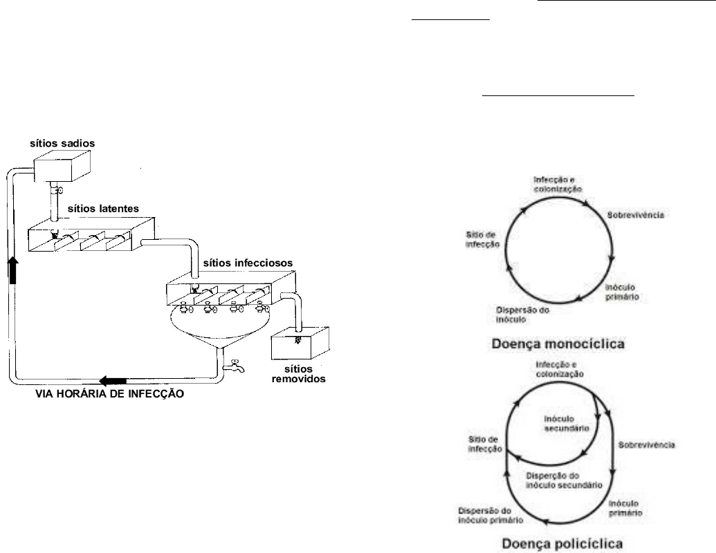 Epidemiologia de doenças de plantas 1. Como funciona uma epidemia? a) Modelo simbólico O modelo simbólico se baseia em equações e parâmetros específicos, sendo especialmente útil para realizar simulações e análises preditivas. b) Modelo icônico Representa a disseminação da doença usando imagens, gráficos e diagramas que facilitam a visualização da progressão da doença e os fatores que a influenciam. c) Modelo analógico É uma forma de simplificar e representar visualmente os fatores e processos que influenciam a propagação de uma doença. A caixa com os sítios infecciosos representa, antes do início da epidemia, toda a população do hospedeiro. A epidemia tem início com a deposição de um esporo fora do sistema sobre um sítio sadio. Com a infecção que vem do contato patógeno-hospedeiro, o sítio sadio torna-se latente. A próxima etapa importante ocorre depois de completado o período latente, ou seja, se tornando infecioso. Durante o período infeccioso o sítio produz esporos, sendo que alguns deles são perdidos/removidos e outros vão seguir pela tubulação e gerar novas infecções. *tecido latente: aquele que foi infectado mais ainda não produz esporos; *tecido infeccioso: aquele que já está produzindo esporos; *tecido removido: aquele que já produziu esporos; *tecido sadio: aquele que ainda não foi infectado. (a soma dos três representa o tecido doente na epidemia). 2. Padrões regulares e princípios gerais a) O Epidemiologista a estuda os padrões temporal e espacial de doenças em populações de hospedeiros. Ele pode ser definido como um detive de padrões. **padrões regulares (identificar) e princípios gerais (propor)** Padrões regulares: doenças com muitos ciclos secundários (sarna da macieira, ferrugens, oídios, antracnoses, manchas foliares em geral, viroses com vetor, e - Doenças causadas por: Phytophthora, Pythium, Sclerotinia, Fusarium solani) ou sem ciclos secundários (Murchas de Fusarium, Murchas de Verticillium e viroses sem vetor como carvão da cana-de açúcar e nematoides em geral). Princípios gerais: Doenças de monociclo ou juros simples: Plantas infectadas durante o ciclo da cultura não servem de fonte de inóculo para novas infecções no mesmo ciclo. -> intensidade final da doença é função do inoculo primário. Doenças policíclicas ou juros compostos: Plantas infectadas durante o ciclo da cultura servem de fonte de inóculo para novas infecções no mesmo ciclo. -> intensidade final da doença é função do inoculo secundário. Epidemiologia de doenças de plantas Ilustrada com huanglongbing dos citros Até o momento se conhecia apenas dois padrões epidemiológicos (mono e policíclico), utilizando a epidemiologia tradicional. Porém com a chegada do huanglongbing é necessário criar um terceiro padrão epidemiológico, e consequentemente um terceiro manejo, adotando então a epidemiologia de paisagem. Com isso a fitopatologia tradicional diz que: - O papel da disseminação primaria é introduzir o patógeno em áreas indenes (sem a doença); - O subsequente desenvolvimento da epidemia é governado pela disseminação secundaria. Então o princípio fundador traz que as medidas de manejo implementadas somente na propriedade já são suficientes. Para realizar o manejo é necessário compreender o patossistema (conjunto de elementos e interações que formam o sistema de uma doença específica em um organismo – hospedeiro, patógeno, ambiente, tempo...) *o fungicida controla com eficiência a disseminação primaria quanto a secundaria Porém utilizando os métodos de controle segundo o princípio do fundador não estava se obtendo resultados no manejo do “dragão amarelo”. A solução encontrada foi negar o princípio fundador, ou seja, as medidas de manejo devem ser implementadas dentro e fora da propriedade. *O problema do padrão 3 é a disseminação primaria continua. Combinação explosiva = disseminação primaria e continua, além disso se tem um vetor e a infecção é sistêmica. Esses três fatores fizeram com que o princípio fundador fosse quebrado. Ela é explosiva tanto no inoculo primário quanto no secundário. Porém o problema inicial dela é o inoculo primário, diferente das doenças de policíclico (inoculo secundário). Até o momento o controle (químico) do vetor era feito no interior da propriedade (disseminação secundaria) sendo eficiente. Porém não era eficaz para controlar a disseminação primaria. *pequenas propriedades rodeadas por vizinhos que não fazem o manejo Para o controle utilizavam mudas sadias, inspeção e erradicação, e o controle químico do vetor, sendo que essas medidas eram realizadas a nível da propriedade. Herança do princípio fundador Porém mesmo com a implementação cuidadosa das três recomendações citadas não era suficiente para controlar o HBL. O erro estava em realizar as recomendações apenas dentro da propriedade. A partir disso o manejo começou a ser implementado dentro e fora da propriedade. Quebra do princípio do fundador Conclusões do manejo regional: - Possível para grandes produtores; - Manejo regional de um só produtor; - Impedir que os vetores deixem o pomar; - A cooperação entre produtores pequenos é difícil; - A ação do governo é essencial para o manejo em regiões de pequenos produtores. Epidemiologia - Toda doença possui obrigatoriamente um ciclo primário. - Nem todas as doenças apresentam ciclos secundários de doença. - O surgimento do ciclo primário depende do inóculo primário ou residual. - Os ciclos secundários surgem a partir do inóculo secundário, que é produzido em lesões na planta hospedeira doente. - O final do ciclo secundário coincide, frequentemente, com o final do tecido hospedeiro (morte das plantas anuais e queda de folhas em plantas perenes decíduas). 1) Doenças de monocíclicas e policíclicas a) Doenças monocíclicas (juros simples) Doenças que apenas apresentam 