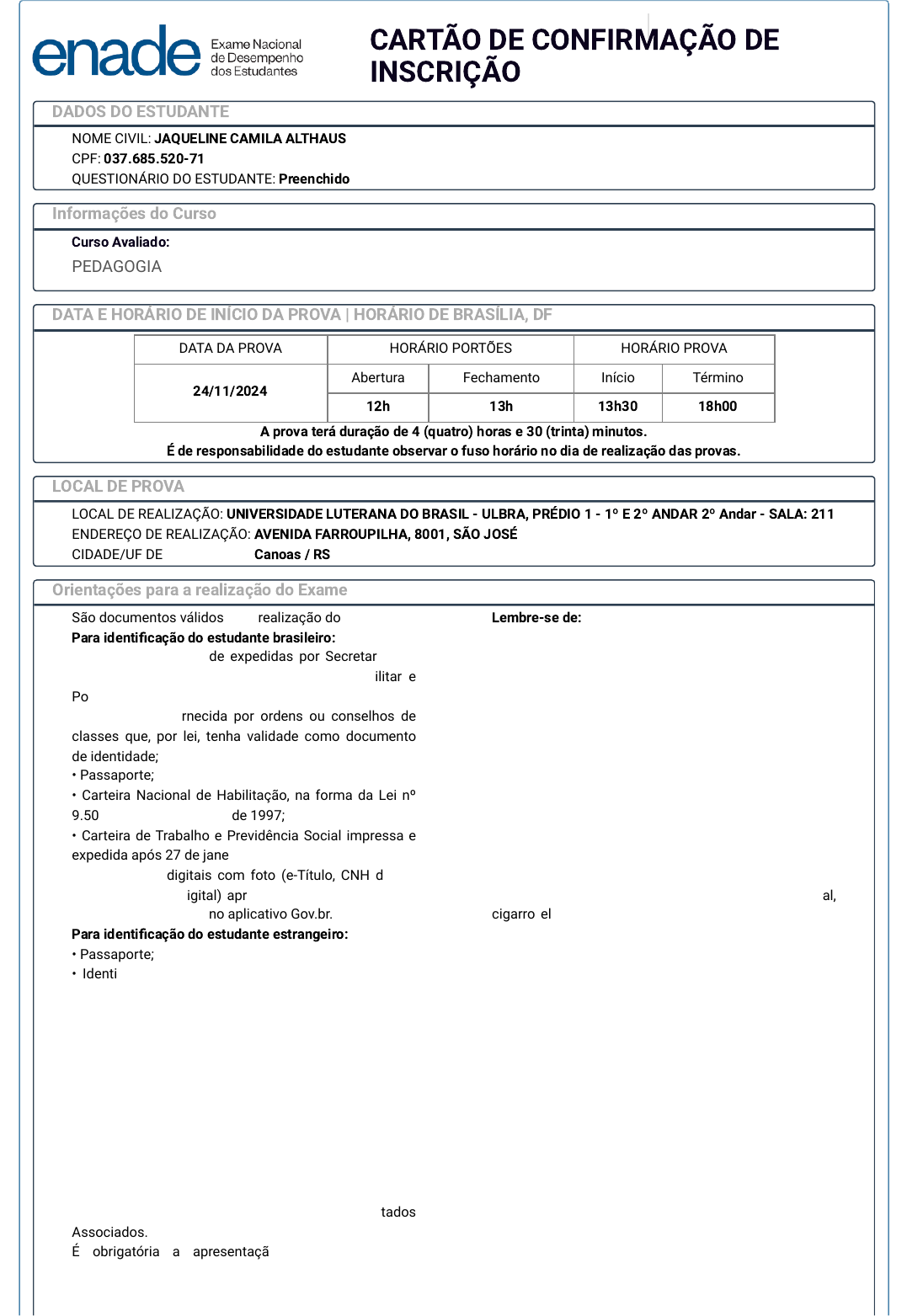 CARTÃO DE CONFIRMAÇÃO DE INSCRIÇÃO DADOS DO ESTUDANTE Informações do Curso DATA E HORÁRIO DE INÍCIO DA PROVA | HORÁRIO DE BRASÍLIA, DF LOCAL DE PROVA Orientações para a realização do Exame NOME CIVIL: JAQUELINE CAMILA ALTHAUS CPF: 037.685.520-71 QUESTIONÁRIO DO ESTUDANTE: Preenchido Curso Avaliado: PEDAGOGIA DATA DA PROVA HORÁRIO PORTÕES HORÁRIO PROVA 24/11/2024 Abertura Fechamento Início Término 12h 13h 13h30 18h00 A prova terá duração de 4 (quatro) horas e 30 (trinta) minutos. É de responsabilidade do estudante observar o fuso horário no dia de realização das provas. LOCAL DE REALIZAÇÃO: UNIVERSIDADE LUTERANA DO BRASIL - ULBRA, PRÉDIO 1 - 1º E 2º ANDAR 2º Andar - SALA: 211 ENDEREÇO DE REALIZAÇÃO: AVENIDA FARROUPILHA, 8001, SÃO JOSÉ CIDADE/UF DE REALIZAÇÃO: Canoas / RS São documentos válidos para realização do Enade. Para identificação do estudante brasileiro: • Cédulas de Identidade expedidas por Secretarias de Segurança Pública, Forças Armadas, Polícia Militar e Polícia Federal; • Identificação fornecida por ordens ou conselhos de classes que, por lei, tenha validade como documento de identidade; • Passaporte; • Carteira Nacional de Habilitação, na forma da Lei nº 9.503, de 23 de setembro de 1997; • Carteira de Trabalho e Previdência Social impressa e expedida após 27 de janeiro de 1997; • Documentos digitais com foto (e-Título, CNH digital, RG digital e CIN digital) apresentados nos respectivos aplicativos oficiais ou no aplicativo Gov.br. Para identificação do estudante estrangeiro: • Passaporte; • Identidade expedida pelo Ministério da Justiça para estrangeiros, inclusive aqueles reconhecidos como refugiados, em consonância com a Lei nº 9.474, de 22 de julho de 1997; • Carteira de Registro Nacional Migratório, de que trata a Portaria nº 11.264, de 24 de janeiro de 2020; • Documento Provisório de Registro Nacional Migratório, de que trata a Portaria nº 11.264, de 24 de janeiro de 2020; • Cédula de identidade civil ou documento estrangeiro equivalente, emitido por Estado parte ou associado ao Mercosul, nos termos do Acordo sobre Documentos de Viagem dos Estados Partes do Mercosul e Estados Associados. É obrigatória a apresentação de documento de identificação original com foto para a realização da Lembre-se de: • Comparecer ao local com antecedência de 1(uma) hora do fechamento dos portões (12h, horário de Brasília – DF); • Levar caneta esferográfica de tinta preta fabricada em material transparente; • Não portar fora do envelope porta-objetos fornecido pelo chefe de sala, ao ingressar na sala de provas: Cartão de Confirmação da Inscrição, bulas, óculos escuro e artigos de chapelaria, como boné, chapéu, viseira, gorro ou similares, caneta de material não transparente, lápis, lapiseira, borracha, régua, corretivo, livros, manuais, impressos, anotações, protetor auricular, relógio de qualquer tipo e quaisquer dispositivos eletrônicos, como garrafa/copo digital, cigarro eletrônico, telefone celular, smartphone, tablet, wearable tech, máquina calculadora, agenda eletrônica e/ou similares, Ipod®, gravador, pen drive, mp3 e/ou similar, alarme, chave com alarme ou com qualquer outro componente eletrônico, fone de ouvido e/ou qualquer transmissor, gravador e/ou receptor de dados, imagens, vídeos e mensagens, assim como quaisquer outros materiais estranhos à realização da prova; • Não utilizar, ao ingressar na sala de provas, óculos escuros e artigos de chapelaria, como: boné, chapéu, viseira, gorro ou similares, durante a realização das provas; • Que se o seu celular ou qualquer equipamento eletrônico tocar, depois do fechamento dos portões, mesmo dentro do envelope porta-objetos, você será eliminado; • Conhecer o seu local de provas com antecedência; • Portar este Cartão de Confirmação de Inscrição; • Cumprir as demais determinações do Edital e da equipe de aplicação; ACESSO À INFORMAÇÃO (HTTP://WWW.ACESSOAINFORMACAO.GOV.BR) PARTICIPE (HTTP://BRASIL.GOV http://www.brasil.gov.br/ http://www.acessoainformacao.gov.br/ http://www.acessoainformacao.gov.br/ http://www.acessoainformacao.gov.br/ http://brasil.gov.br/participacao-social http://brasil.gov.br/participacao-social http://brasil.gov.br/participacao-social