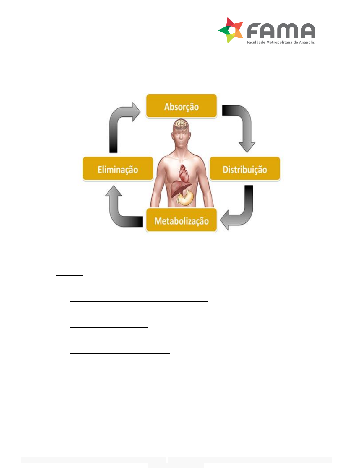 INSTITUTO METROPOLITANO DE EDUCACAO E CULTURA LTDA CNPJ 08.814.347/0001-80 Av. Fernando Costa, nº 49 – Vila Jaiara St. Norte, Anápolis – GO, 75064-780 FARMACOCINÉTICA: DESCOMPLICANDO 1. O que é a farmacocinética? 1. Estudos de cada fase 2. Absorção 1. Biodisponibilidade 2. Formas de administração na farmacocinética 3. Vantagens e desvantagens das vias de absorção 3. Farmacocinética da distribuição 4. Metabolismo 1. Fases da biotransformação 5. Farmacocinética da excreção 1. Farmacocinética da excreção renal 2. Farmacocinética da excreção biliar 6. Referências bibliográficas A farmacocinética é uma parte essencial para o estudo da farmacologia, já que ajuda na compreensão da atuação de tais fármacos no organismo. Dessa forma, a farmacocinética estuda o caminho do fármaco no organismo, desde a sua administração, absorção, distribuição e metabolismo, até a sua excreção. Cada uma dessas etapas pode afetar positiva ou negativamente a ação do fármaco, dependendo da forma como for https://sanarmed.com/farmacocinetica-descomplicando-conceitos-da-farmacologia-colunistas/#elementor-toc__heading-anchor-0 https://sanarmed.com/farmacocinetica-descomplicando-conceitos-da-farmacologia-colunistas/#elementor-toc__heading-anchor-1 https://sanarmed.com/farmacocinetica-descomplicando-conceitos-da-farmacologia-colunistas/#elementor-toc__heading-anchor-2 https://sanarmed.com/farmacocinetica-descomplicando-conceitos-da-farmacologia-colunistas/#elementor-toc__heading-anchor-3 https://sanarmed.com/farmacocinetica-descomplicando-conceitos-da-farmacologia-colunistas/#elementor-toc__heading-anchor-4 https://sanarmed.com/farmacocinetica-descomplicando-conceitos-da-farmacologia-colunistas/#elementor-toc__heading-anchor-5 https://sanarmed.com/farmacocinetica-descomplicando-conceitos-da-farmacologia-colunistas/#elementor-toc__heading-anchor-6 https://sanarmed.com/farmacocinetica-descomplicando-conceitos-da-farmacologia-colunistas/#elementor-toc__heading-anchor-7 https://sanarmed.com/farmacocinetica-descomplicando-conceitos-da-farmacologia-colunistas/#elementor-toc__heading-anchor-8 https://sanarmed.com/farmacocinetica-descomplicando-conceitos-da-farmacologia-colunistas/#elementor-toc__heading-anchor-9 https://sanarmed.com/farmacocinetica-descomplicando-conceitos-da-farmacologia-colunistas/#elementor-toc__heading-anchor-10 https://sanarmed.com/farmacocinetica-descomplicando-conceitos-da-farmacologia-colunistas/#elementor-toc__heading-anchor-11 https://sanarmed.com/farmacocinetica-descomplicando-conceitos-da-farmacologia-colunistas/#elementor-toc__heading-anchor-14 INSTITUTO METROPOLITANO DE EDUCACAO E CULTURA LTDA CNPJ 08.814.347/0001-80 Av. Fernando Costa, nº 49 – Vila Jaiara St. Norte, Anápolis – GO, 75064-780 aproveitada – por exemplo, a absorção de fármacos como o omeprazol se dá de forma mais eficiente quando se está de jejum. O QUE É A FARMACOCINÉTICA? O estudo da farmacocinética é essencial para determinar a efetividade clínica de um medicamento, já que é a partir dela que saberemos os caminhos dos fármacos no organismo, se ele foi bem- sucedido em ultrapassar barreiras fisiológicas e em sua distribuição nos órgãos-alvo. A farmacocinética, dessa forma, compreende o estudo do caminho do fármaco no corpo humano, desde a sua administração até a sua metabolização ou excreção, passando por várias etapas, como a absorção, a distribuição e a metabolização. Durante esse estudo, adquire-se conhecimento sobre o que pode facilitar ou dificultar a absorção de um determinado fármaco, o que pode ser feito para melhorar sua distribuição, e, também muito importante, é possível determinar interações medicamentosas que podem ocorrer em diferentes fases, como na metabolização dos fármacos no fígado. A farmacocinética se divide em: Absorção Distribuição Metabolização Excreção. ESTUDOS DE CADA FASE Na absorção, é importante aprender sobre os diferentes locais em que ela pode ocorrer e as barreiras fisiológicas que dificultam o processo absortivo. Já na distribuição, estuda-se os caminhos dos medicamentos até chegarem ao órgão-alvo, seja pela corrente sanguínea ou linfática. No metabolismo dos fármacos, vê-se que eles podem ser transformados em metabólitos inativos, prontos para excreção, ou até mesmo em compostos mais ativos que o inicial, e isso se dá por atividade enzimática. Por último, na excreção, entende-se quais os locais por onde o organismo elimina o fármaco. INSTITUTO METROPOLITANO DE EDUCACAO E CULTURA LTDA CNPJ 08.814.347/0001-80 Av. Fernando Costa, nº 49 – Vila Jaiara St. Norte, Anápolis – GO, 75064-780 ABSORÇÃO A absorção de um fármaco se dá após a sua administração e depende da passagem desse fármaco pelas barreiras do organismo. Exemplos da proteção exercida pelo organismo são a secreção ácida no estômago e básica no intestino, que podem aumentar ou diminuir a entrada do medicamento, de acordo com as suas propriedades químicas. BIODISPONIBILIDADE Outro fator importante definido durante a absorção é a biodisponibilidade, ou seja, a fração do fármaco que alcançará a circulação sistêmica. De acordo com a forma de administração realizada, as propriedades químicas do fármaco e algumas características próprias do paciente. Formas de administração na farmacocinética A respeito das formas de administração, podem ser divididas em: Vias enterais, ou seja, oral e retal Vias parenterais, a exemplo das transdérmicas. Via enteral A via enteral é a forma mais simples e prática de se administrar um fármaco, já que engloba a administração oral. Apesar disso, é necessário que o medicamento apresente certa resistência, já que ele será exposto a ambientes ácidos, no estômago, e básicos, no intestino. De forma geral, para que um fármaco seja administrado via oral e seja bem absorvido pelo organismo no trato digestivo, ele deve apresentar