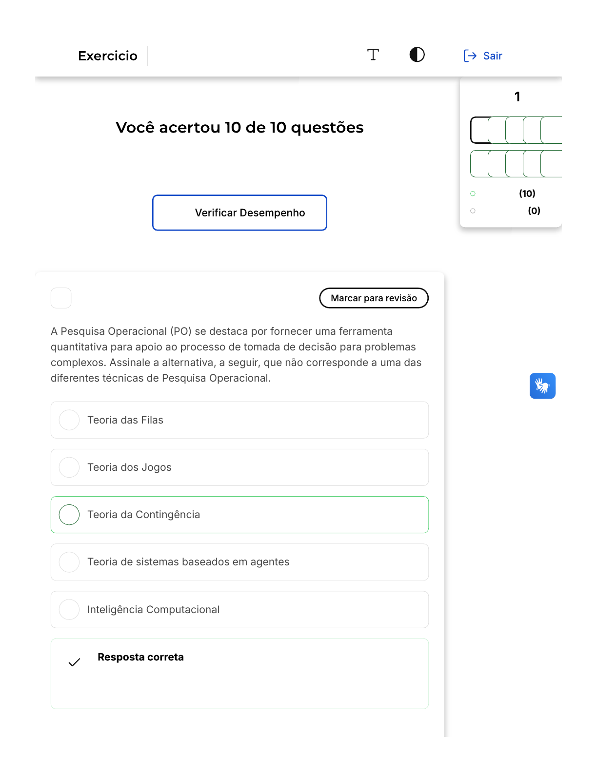 Verifique o seu desempenho e continue treinando! Você pode refazer o exercício quantas vezes quiser. A B C D E 1 A Pesquisa Operacional �PO) se destaca por fornecer uma ferramenta quantitativa para apoio ao processo de tomada de decisão para problemas complexos. Assinale a alternativa, a seguir, que não corresponde a uma das diferentes técnicas de Pesquisa Operacional. Teoria das Filas Teoria dos Jogos Teoria da Contingência Teoria de sistemas baseados em agentes Inteligência Computacional Parabéns, você selecionou a alternativa correta. Confira o gabarito comentado! Questão de 10 Corretas Em branco 1 2 3 4 5 6 7 8 9 10 A Pesquisa Operacional Como Ferramenta De Apoio À Decisão Firefox https://estacio.saladeavaliacoes.com.br/exercicio/67362d4393e529c49d... 1 of 13 14/11/2024, 14:06 A B C D E A alternativa correta é a Teoria da Contingência. Esta é uma teoria da administração que se concentra na relação entre diferentes aspectos do ambiente organizacional e suas implicações para o desempenho organizacional. No entanto, ela não é considerada uma técnica de Pesquisa Operacional. As demais alternativas, Teoria das Filas, Teoria dos Jogos e Teoria de sistemas baseados em agentes, são exemplos de técnicas de pesquisa operacional. A Inteligência Computacional, por sua vez, é uma área da inteligência artificial que inclui técnicas de pesquisa operacional, como aprendizado de máquina, redes neurais, algoritmos genéticos e algoritmos de busca. 2 Uma empresa deseja minimizar o custo de produção de dois produtos, A e B, sabendo que a produção de A demanda 3 unidades de matéria-prima e 2 horas de trabalho, enquanto a produção de B demanda 2 unidades de matéria-prima e 4 horas de trabalho. A empresa tem disponíveis 60 unidades de matéria-prima e 60 horas de trabalho. Sabendo que o custo de produção de A é R$ 5,00 por unidade e o de B é R$ 8,00 por unidade, qual a quantidade de cada produto que a empresa deve produzir para minimizar o custo? 10 unidades de A e 10 unidades de B. 15 unidades de A e 5 unidades de B. 20 unidades de A e 0 unidades de B. 0 unidades de A e 20 unidades de B. 5 unidades de A e 15 unidades de B. Firefox https://estacio.saladeavaliacoes.com.br/exercicio/67362d4393e529c49d... 2 of 13 14/11/2024, 14:06 Parabéns, você selecionou a alternativa correta. Confira o gabarito comentado! Função Objetivo: Minimizar Restrições: 1. Restrição de Matéria-Prima: Cada unidade de A usa 3 unidades de matéria-prima e cada unidade de B usa 2 unidades. Com 60 unidades de matéria-prima disponíveis, temos: 2. Restrição de Horas de Trabalho: Cada unidade de A requer 2 horas de trabalho e cada unidade de B requer 4 horas. Com 60 horas de trabalho disponíveis, temos: 3. Restrições de Não Negatividade: Agora, vamos analisar as opções dadas para encontrar a que minimiza o custo sem violar as restrições. Opção 1� 10 unidades de A e 10 unidades de B. Opção 2� 15 unidades de A e 5 unidades de B. Opção 3� 20 unidades de A e 0 unidades de B. Opção 4� 0 unidades de A e 20 unidades de B. Opção 5� 5 unidades de A e 15 unidades de B. C = 5x + 8y 3x + 2y ≤ 60 2x + 4y ≤ 60 x ≥ 0 y ≥ 0 3(10) + 2(10) = 30 + 20 = 50 ≤ 60 (Matéria-prima OK) 2(10) + 4(10) = 20 + 40 = 60 ≤ 60 (Horas de trabalho OK) Custo: 5(10) + 8(10) = 50 + 80 = 130 3(15) + 2(5) = 45 + 10 = 55 ≤ 60 (Matéria-prima OK) 2(15) + 4(5) = 30 + 20 = 50 ≤ 60 (Horas de trabalho OK) Custo: 5(15) + 8(5) = 75 + 40 = 115 3(20) + 2(0) = 60 + 0 = 60 ≤ 60 (Matéria-prima OK) 2(20) + 4(0) = 40 + 0 = 40 ≤ 60 (Horas de trabalho OK) Custo: 5(20) + 8(0) = 100 + 0 = 100 3(0) + 2(20) = 0 + 40 = 40 ≤ 60 (Matéria-prima OK) 2(0) + 4(20) = 0 + 80 = 80 ≤ 60 (Horas de trabalho NÃO OK) Custo: 5(0) + 8(20) = 0 + 160 = 160 Firefox https://estacio.saladeavaliacoes.com.br/exercicio/67362d4393e529c49d... 3 of 13 14/11/2024, 14:06 A B C D E Das opções analisadas, a resulta no menor custo de R$100 e atende a todas as restrições de matéria-prima e horas de trabalho. 3(5) + 2(15) = 15 + 30 = 45 ≤ 60 (Matéria-prima OK) 2(5) + 4(15) = 10 + 60 = 70 ≤ 60 (Horas de trabalho NÃO OK) Custo: 5(5) + 8(15) = 25 + 120 = 145 3 Foi desenvolvido um modelo para a análise de um problema complexo. Sabe-se que todas as variáveis de decisão desse modelo estão livres para assumir valores fracionais. Desse modo, pode-se afirmar que esse modelo é: Dinâmico Não linear Estocástico Não inteiro Determinístico Parabéns, você selecionou a alternativa correta. Confira o gabarito comentado! O modelo em questão é classificado como "não inteiro". Isso ocorre porque as variáveis de decisão do modelo podem assumir valores fracionários. Em outras palavras, a solução ótima para o problema modelado não precisa ser necessariamente um número inteiro, podendo Firefox https://estacio.saladeavaliacoes.com.br/exercicio/67362d4393e529c49d... 4 of 13 14/11/2024, 14:06 A B C D E ser uma fração. Esta característica distingue o modelo "não inteiro" de um modelo "inteiro", no qual as variáveis de decisão são restritas a números inteiros. 4 Uma empresa produz dois tipos de produtos, A e B, com lucro de R 8,00 por unidade, respectivamente. Sabendo que a produção de A demanda 2 horas de trabalho e 1 hora de máquina, enquanto a produção de B demanda 1 hora de trabalho e 2 horas de máquina, e que a empresa tem disponíveis 100 horas de trabalho e 80 horas de máquina, qual a quantidade de cada produto que a empresa deve produzir para maximizar o lucro? 10, 00eR 20 unidades de A e 40 unidades de B 25 unidades de A e 35 unidades de B 30 unidades de A e 25 unidades de B 35 unidades de A e 25 unidades de B 40 unidades de A e 20 unidades de B Parabéns, você selecionou a alternativa correta. Confira o gabarito comentado! A empresa precisa decidir quantas unidades produzir de cada produto �A e B) para maximizar o lucro, sujeita às restrições de tempo de trabalho e máquina. Definindo a