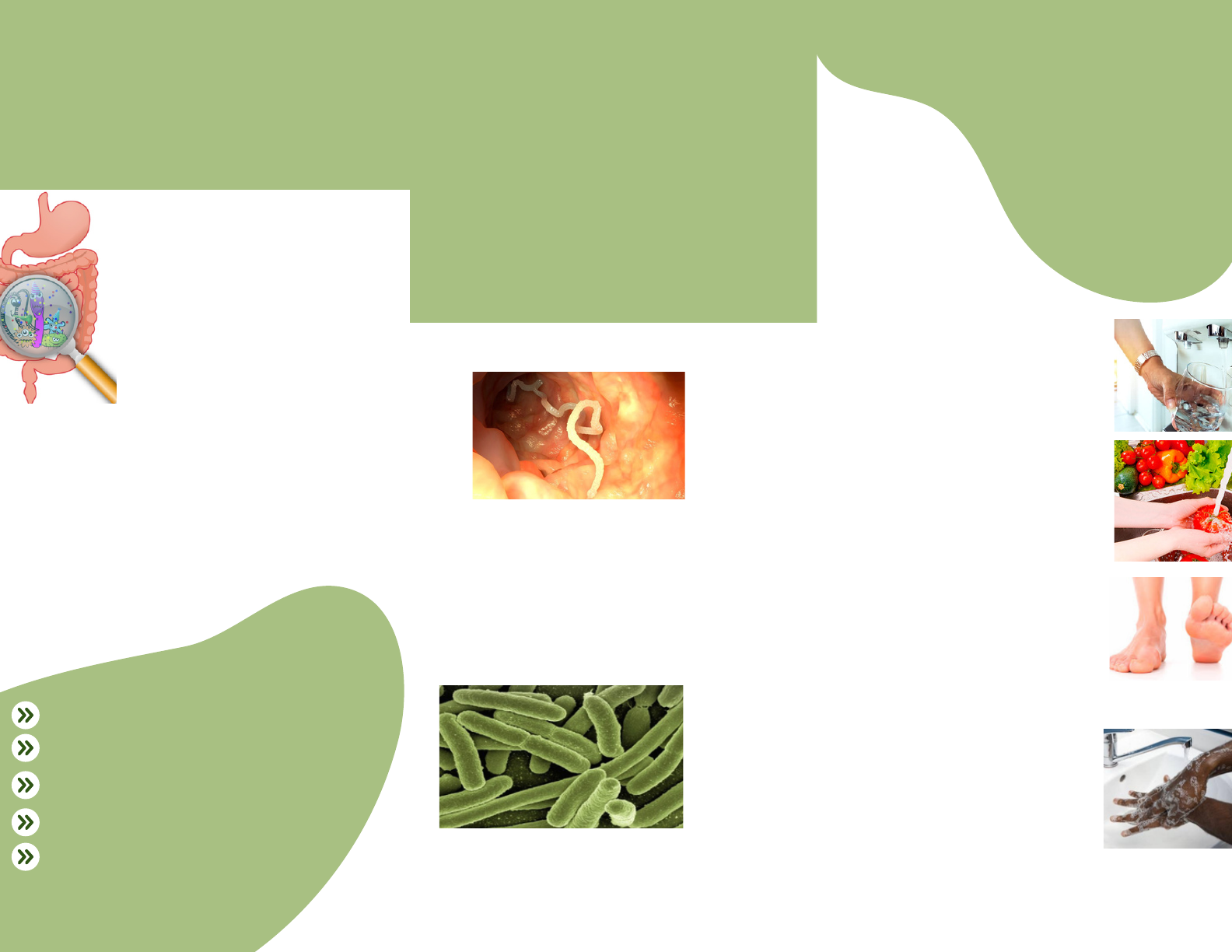 Lave frutas, verduras e legumes antes de consumi- los. Evite andar descalço em locais onde possa haver contaminação por parasitas. O tratamento das parasitoses intestinais é feito com remédios antiparasitários receitados por um médico. Cada parasita pode precisar de um medicamento específico, por isso é essencial um diagnóstico preciso. Além disso, manter uma boa alimentação e hábitos de higiene reforçam o corpo e previnem novas infecções. 4o PARASITOSE INTESTINAL São infecções causadas por parasitas que se instalam no intestino humano. Esses parasitas podem ser protozoários (como a Giardia) ou vermes (como a lombriga e o ancilóstomo). Eles entram no corpo principalmente através da ingestão de água ou alimentos contaminados ou pelo contato com solo infectado. QUAIS SÃO OS SINTOMAS? Dor ou desconforto abdominal Perda de apetite e perda de peso Náuseas e vômitos Diarreia ou constipação Anemia (em casos mais graves) COMO TRATAR? VERMES (HELMINTOS) São organismos multinucleares, como, lombrigas (Ascaris lumbricoides), tênias (Taenia spp) e ancillostomídeos (Ancylostoma duodenale, Necator americanus) PROTOZOÁRIOS São organismos unicelulares, como giárdia (Giardia lamblia) e ameba (Entamoeba histolytica). COMO PREVENIR Beba água filtrada ou fervida. Lave bem as mãos com água e sabão, especialmente antes das refeições e após usar o banheiro. Mantenha cuidados com saneamento básico adequado e higiene pessoal. . . . . .