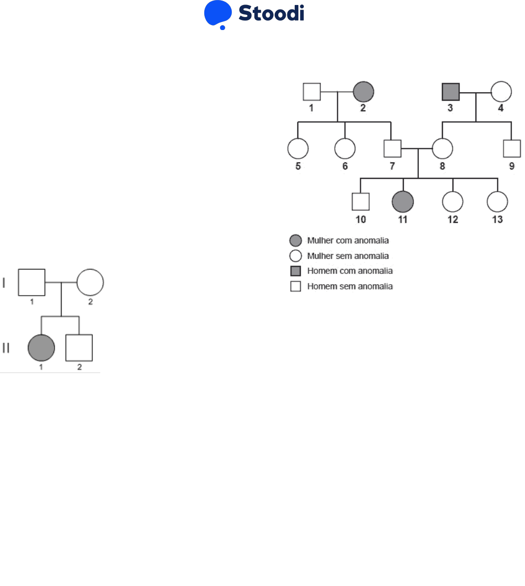 <p>Página 1</p><p>Copyright (c) 2013 - 2020 Stoodi Ensino e Treinamento a Distância S.A. - Todos os direitos reservados</p><p>31. UFRGS 2008</p><p>Em gatos, a cor da pelagem preta é dominante em relação a</p><p>cinza. Uma fêmea preta, chamada Filó, tem mãe preta</p><p>homozigota e pai preto, chamado Bigode. A mãe de Bigode</p><p>é cinza. Se Filó cruzar com um gato cinza, a probabilidade</p><p>de nascer um descendente cinza é de</p><p>a. 1/8.</p><p>b. 1/4.</p><p>c. 1/3.</p><p>d. 1/2.</p><p>e. 3/4.</p><p>32. FUVEST 2016</p><p>No heredograma acima, a menina II-1 tem uma doença</p><p>determinada pela homozigose quanto a um alelo mutante de</p><p>gene localizado num autossomo.</p><p>A probabilidade de que seu irmão II-2 clinicamente normal,</p><p>possua esse alelo mutante é</p><p>a. 0</p><p>b. 1/4</p><p>c. 1/3</p><p>d. 1/2</p><p>e. 2/3</p><p>33. ENEM 2017</p><p>O heredograma mostra a incidência de uma anomalia</p><p>genética em um grupo familiar.</p><p>O indivíduo representado pelo número 10, preocupado em</p><p>transmitir o aIeIo para a anomalia genética a seus filhos,</p><p>calcula que a probabilidade de ele ser portador desse aIeIo é</p><p>de</p><p>a. 0%</p><p>b. 25%</p><p>c. 50%</p><p>d. 67%</p><p>e. 75%</p><p>34. UECE 2015</p><p>A cada nascimento de um ser humano a probabilidade de</p><p>ser do sexo feminino ou do sexo masculino é representada</p><p>corretamente pela seguinte porcentagem:</p><p>a. 100%</p><p>b. 75%</p><p>c. 25%</p><p>d. 50%</p><p>35. UESC 2011</p><p>O trabalho de Mendel não encontrou, em sua época, um</p><p>único cientista que o compreendesse a ponto de nele</p><p>descobrir uma das maiores obras de toda a ciência. Parece</p><p>certo que o ambiente científico não estava preparado para</p><p>receber a grande conquista. Mendel constitui, por isso, um</p><p>dos mais belos (e tristes) exemplos de homem que andou à</p><p>frente de seu tempo, conhecendo fatos e elaborando leis que</p><p>Página 2</p><p>Copyright (c) 2013 - 2020 Stoodi Ensino e Treinamento a Distância S.A. - Todos os direitos reservados</p><p>a sua época ainda não podia compreender. Além disso, era</p><p>um gênio que não tinha condições de se tornar um figurão</p><p>da ciência: era sacerdote, tinha publicado um único trabalho</p><p>bom e era professor substituto de escola secundária.</p><p>FREIRE-MAIA, Newton. Gregor Mendel: vida e obra. São</p><p>Paulo: T. A.</p><p>Queiroz, 1995.</p><p>Considerando-se o trabalho desenvolvido por Mendel a partir</p><p>dos cruzamentos com espécimes de ervilhas-de-cheiro</p><p>(Pisum sativum) e a pouca repercussão obtida entre os</p><p>cientistas da época, é possível afirmar:</p><p>a. Um dos conceitos utilizado por Mendel na elaboração da</p><p>1ª Lei antecipava o conhecimento sobre meiose como um</p><p>processo reducional de divisão celular.</p><p>b. A utilização de conceitos lamarckistas, em seus</p><p>experimentos, é o principal motivo que impediu a</p><p>compreensão do trabalho mendeliano pela comunidade</p><p>científica da época.</p><p>c. A precisão dos resultados obtidos por Mendel foi</p><p>consequência do conhecimento prévio obtido por ele sobre a</p><p>importância do DNA como molécula responsável pela</p><p>hereditariedade.</p><p>d. A falta de reconhecimento do trabalho de Mendel, à sua</p><p>época, foi devido às dificuldades impostas pelos cientistas</p><p>fixistas em não aceitarem concepções evolucionistas como a</p><p>transmissão de características genéticas ao longo das</p><p>gerações.</p><p>e. O cruzamento da geração parental resultava em uma</p><p>descendência com proporção genotípica de 3:1 como</p><p>consequência da segregação independente dos fatores</p><p>mendelianos.</p><p>36. UFRGS 2006</p><p>Conforme correspondência publicada na revista científica</p><p>"Nature" de agosto de 2005 (p. 776), foi sugerido que a</p><p>característica de ser ou não bruxo seguiria padrão de</p><p>segregação mendeliana. Rony, Neville e Draco são bruxos,</p><p>filhos de pais bruxos, provenientes de famílias bruxas</p><p>tradicionais. Hermione é bruxa mas filha de trouxas (não</p><p>bruxos). Simas é bruxo, filho de uma bruxa e de um trouxa.</p><p>Harry é bruxo, filho de bruxos, sendo sua mãe filha de</p><p>trouxas.</p><p>Com base no texto, considere as seguintes afirmações sobre</p><p>o caráter bruxo em termos genéticos.</p><p>I - Harry é menos bruxo que Rony, Neville e Draco.</p><p>II - Hermione apresenta dois alelos para o caráter bruxo.</p><p>III - Simas é heterozigoto para o caráter bruxo.</p><p>Quais estão corretas?</p><p>a. Apenas I.</p><p>b. Apenas II.</p><p>c. Apenas I e III.</p><p>d. Apenas II e III.</p><p>e. I, II e III.</p><p>37. UNISC 2015</p><p>No albinismo tirosinase-negativo não há produção da enzima</p><p>tirosinase, participante de etapas do metabolismo que</p><p>transforma o aminoácido tirosina em melanina. O lócus do</p><p>gene que codifica esta enzima localiza-se no cromossomo</p><p>11 e pode conter o alelo normal ou o recessivo Um casal</p><p>normal que possui quatro filhos todos normais deseja ter um</p><p>novo filho. Sabendo-se que a herança desta característica é</p><p>autossômica recessiva e que o avô paterno e a avó materna</p><p>das crianças eram albinos, qual será a probabilidade do</p><p>bebê vir a ser albino?</p><p>a. 0%</p><p>b. 25%</p><p>c. 50%</p><p>d. 75%</p><p>e. 100%</p><p>38. UNIRG 2018</p><p>O albinismo é considerado uma anomalia genética</p><p>provocada pela ausência total ou parcial de pigmentação da</p><p>pele, dos olhos e cabelos. No ser humano, o albinismo é um</p><p>caráter hereditário recessivo. Considere uma situação em</p><p>que progenitores com pigmentação normal tenham um filho</p><p>albino e analise atentamente as proposições abaixo.</p><p>I - Os progenitores são portadores do alelo recessivo.</p><p>II - O genótipo do indivíduo albino é heterozigoto para tal</p><p>característica.</p><p>III - Os desc