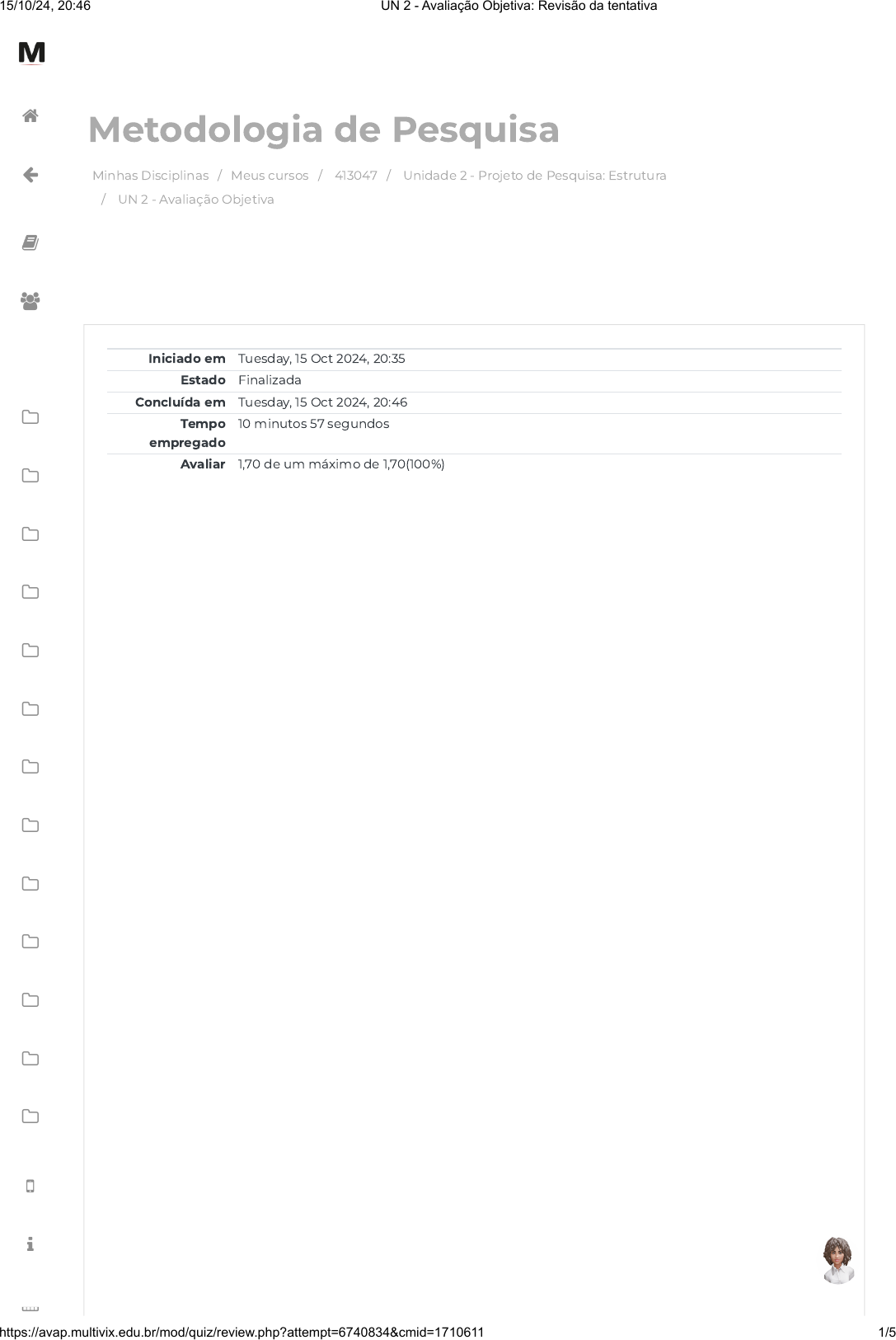 Minhas Disciplinas / Meus cursos / 413047 / Unidade 2 - Projeto de Pesquisa: Estrutura / UN 2 - Avaliação Objetiva Metodologia de Pesquisa Iniciado em Tuesday, 15 Oct 2024, 20:35 Estado Finalizada Concluída em Tuesday, 15 Oct 2024, 20:46 Tempo empregado 10 minutos 57 segundos Avaliar 1,70 de um máximo de 1,70(100%) 15/10/24, 20:46 UN 2 - Avaliação Objetiva: Revisão da tentativa https://avap.multivix.edu.br/mod/quiz/review.php?attempt=6740834&cmid=1710611 1/5 https://avap.multivix.edu.br/my/ https://avap.multivix.edu.br/course/view.php?id=29098 https://avap.multivix.edu.br/course/view.php?id=29098§ion=3 https://avap.multivix.edu.br/mod/quiz/view.php?id=1710611 https://avap.multivix.edu.br/my/ https://avap.multivix.edu.br/course/view.php?id=29098 https://avap.multivix.edu.br/user/index.php?id=29098 https://avap.multivix.edu.br/course/view.php?id=29098§ion=1 https://avap.multivix.edu.br/course/view.php?id=29098§ion=2 https://avap.multivix.edu.br/course/view.php?id=29098§ion=3 https://avap.multivix.edu.br/course/view.php?id=29098§ion=4 https://avap.multivix.edu.br/course/view.php?id=29098§ion=5 https://avap.multivix.edu.br/course/view.php?id=29098§ion=6 https://avap.multivix.edu.br/course/view.php?id=29098§ion=7 https://avap.multivix.edu.br/course/view.php?id=29098§ion=8 https://avap.multivix.edu.br/course/view.php?id=29098§ion=9 https://avap.multivix.edu.br/course/view.php?id=29098§ion=10 https://avap.multivix.edu.br/course/view.php?id=29098§ion=11 https://avap.multivix.edu.br/course/view.php?id=29098§ion=12 https://avap.multivix.edu.br/course/view.php?id=29098§ion=13 https://avap.multivix.edu.br/hooks/portal/ https://avap.multivix.edu.br/mod/page/view.php?id=1252%2F%22%20target%3D%22_blank https://avap.multivix.edu.br/calendar/view.php/ https://avap.multivix.edu.br/ https://avap.multivix.edu.br/ https://avap.multivix.edu.br/ https://avap.multivix.edu.br/ https://avap.multivix.edu.br/ https://avap.multivix.edu.br/ Questão 1 Correto Atingiu 0,34 de 0,34 O modelo de monogra�a contempla os elementos pré-textuais, textuais, pós-textuais, os principais tipos de citação e a disposição de ilustrações, �guras e tabelas. Para seu desenvolvimento, devemos primeiro fazer um projeto, que é uma sequência de etapas metodológicas estabelecidas pelo pesquisador; essas etapas devem ser adequadas aos procedimentos da metodologia cientí�ca. Portal da informação – Sistema de biblioteca. Orientação para normalização de trabalhos acadêmicos. SIBI, UFPR. Publicado em março de 2016. Relacione a segunda coluna de acordo com a primeira, de acordo com a estrutura da monogra�a e seus respectivos questionamentos: 1. Revisão de Literatura/Referencial Teórico 2. Cronograma de Execução 3. Objetivos 4. Justi�cativa do Tema 5. Procedimentos/Metodologia/ Material e Métodos. ( ) Para quê? ( ) O que já foi escrito sobre o tema? O que já é sabido sobre o assunto pesquisado? ( ) Como? Onde? Com quê? ( ) Quando? Em quanto tempo? ( ) Por quê? Assinale a alternativa com a sequência correta: Escolha uma opção: a. 4, 5, 2, 1, 3. b. 3, 2, 5, 4, 1. c. 3, 1, 5, 2, 4. d. 1, 3, 4, 5, 2. e. 2, 1, 4, 2, 3. 15/10/24, 20:46 UN 2 - Avaliação Objetiva: Revisão da tentativa https://avap.multivix.edu.br/mod/quiz/review.php?attempt=6740834&cmid=1710611 2/5 https://avap.multivix.edu.br/my/ https://avap.multivix.edu.br/course/view.php?id=29098 https://avap.multivix.edu.br/user/index.php?id=29098 https://avap.multivix.edu.br/course/view.php?id=29098§ion=1 https://avap.multivix.edu.br/course/view.php?id=29098§ion=2 https://avap.multivix.edu.br/course/view.php?id=29098§ion=3 https://avap.multivix.edu.br/course/view.php?id=29098§ion=4 https://avap.multivix.edu.br/course/view.php?id=29098§ion=5 https://avap.multivix.edu.br/course/view.php?id=29098§ion=6 https://avap.multivix.edu.br/course/view.php?id=29098§ion=7 https://avap.multivix.edu.br/course/view.php?id=29098§ion=8 https://avap.multivix.edu.br/course/view.php?id=29098§ion=9 https://avap.multivix.edu.br/course/view.php?id=29098§ion=10 https://avap.multivix.edu.br/course/view.php?id=29098§ion=11 https://avap.multivix.edu.br/course/view.php?id=29098§ion=12 https://avap.multivix.edu.br/course/view.php?id=29098§ion=13 https://avap.multivix.edu.br/hooks/portal/ https://avap.multivix.edu.br/mod/page/view.php?id=1252%2F%22%20target%3D%22_blank https://avap.multivix.edu.br/calendar/view.php/ https://avap.multivix.edu.br/ https://avap.multivix.edu.br/ https://avap.multivix.edu.br/ https://avap.multivix.edu.br/ https://avap.multivix.edu.br/ https://avap.multivix.edu.br/ Questão 2 Correto Atingiu 0,34 de 0,34 Questão 3 Correto Atingiu 0,34 de 0,34 O projeto é um documento técnico, cientí�co e administrativo, através do qual o pesquisador formaliza o compromisso de usar a sua inteligência e o seu talento, na busca de soluções cientí�cas para o problema. Através dele, identi�cam-se as qualidades pro�ssionais e de caráter como: espírito cientí�co, inteligência, objetividade, intelectualidade, maturidade pro�ssional, criatividade, originalidade, honestidade, zelo pro�ssional, humildade e organização (FERRÃO, 2008). Qual das alternativas abaixo apresenta corretamente a estrutura básica de um projeto de pesquisa? Escolha uma opção: a. Introdução, revisão bibliográ�ca, resultados, conclusão e referências. b. Problema, hipótese, desenvolvimento, conclusão e anexos. c. Resumo, desenvolvimento, resultados, discussão e bibliogra�a. d. Título, introdução, objetivos, justi�cativa, metodologia, cronograma e referências. e. Tema, resumo, metodologia, análise de dados e cronograma. Uma estudante de graduação está elaborando um projeto de pesquisa para investigar os impactos das redes sociais no desempenho acadêmico de estudantes universitários. No desenvolvimento do projeto, ela precisará de�nir o objetivo geral, que deverá orientar a pesquisa de forma ampla, indicando o que prete