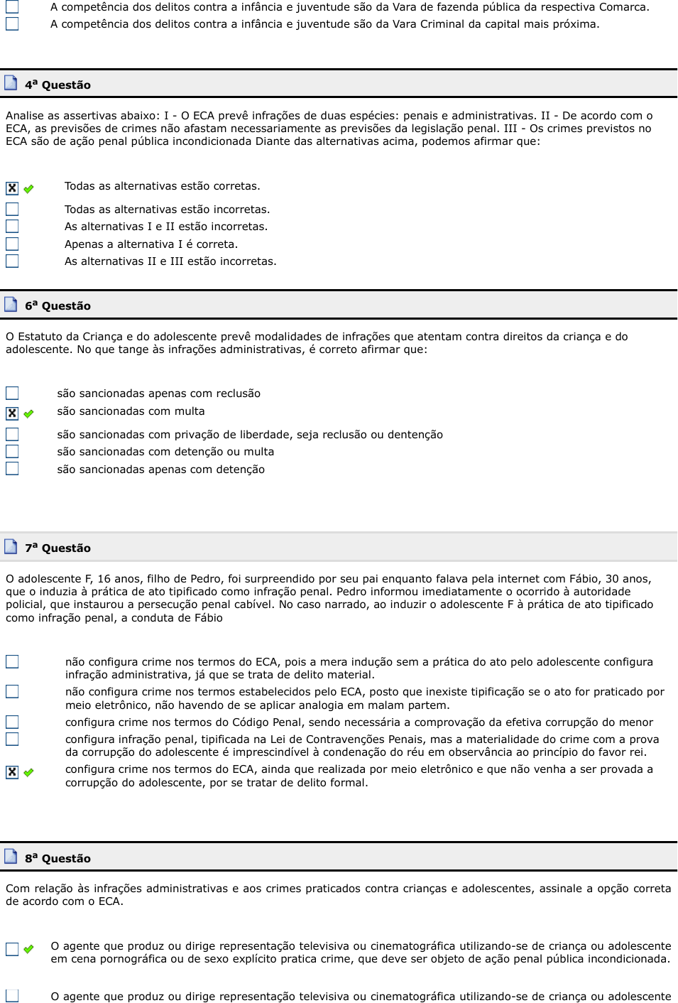 A competência dos delitos contra a infância e juventude são da Vara de fazenda pública da respectiva Comarca. A competência dos delitos contra a infância e juventude são da Vara Criminal da capital mais próxima. 4a Questão Analise as assertivas abaixo: I - O ECA prevê infrações de duas espécies: penais e administrativas. II - De acordo com o ECA, as previsões de crimes não afastam necessariamente as previsões da legislação penal. III - Os crimes previstos no ECA são de ação penal pública incondicionada Diante das alternativas acima, podemos afirmar que: Todas as alternativas estão corretas. Todas as alternativas estão incorretas. As alternativas I e II estão incorretas. Apenas a alternativa I é correta. As alternativas II e III estão incorretas. 6a Questão O Estatuto da Criança e do adolescente prevê modalidades de infrações que atentam contra direitos da criança e do adolescente. No que tange às infrações administrativas, é correto afirmar que: são sancionadas apenas com reclusão são sancionadas com multa são sancionadas com privação de liberdade, seja reclusão ou dentenção são sancionadas com detenção ou multa são sancionadas apenas com detenção 7a Questão O adolescente F, 16 anos, filho de Pedro, foi surpreendido por seu pai enquanto falava pela internet com Fábio, 30 anos, que o induzia à prática de ato tipificado como infração penal. Pedro informou imediatamente o ocorrido à autoridade policial, que instaurou a persecução penal cabível. No caso narrado, ao induzir o adolescente F à prática de ato tipificado como infração penal, a conduta de Fábio não configura crime nos termos do ECA, pois a mera indução sem a prática do ato pelo adolescente configura infração administrativa, já que se trata de delito material. não configura crime nos termos estabelecidos pelo ECA, posto que inexiste tipificação se o ato for praticado por meio eletrônico, não havendo de se aplicar analogia em malam partem. configura crime nos termos do Código Penal, sendo necessária a comprovação da efetiva corrupção do menor configura infração penal, tipificada na Lei de Contravenções Penais, mas a materialidade do crime com a prova da corrupção do adolescente é imprescindível à condenação do réu em observância ao princípio do favor rei. configura crime nos termos do ECA, ainda que realizada por meio eletrônico e que não venha a ser provada a corrupção do adolescente, por se tratar de delito formal. 8a Questão Com relação às infrações administrativas e aos crimes praticados contra crianças e adolescentes, assinale a opção correta de acordo com o ECA. O agente que produz ou dirige representação televisiva ou cinematográfica utilizando-se de criança ou adolescente em cena pornográfica ou de sexo explícito pratica crime, que deve ser objeto de ação penal pública incondicionada. O agente que produz ou dirige representação televisiva ou cinematográfica utilizando-se de criança ou adolescente em cena pornográfica ou de sexo explícito pratica crime, que deve ser objeto de ação penal pública condicionada. O professor ou responsável por estabelecimento de ensino que deixa de comunicar à autoridade competente os casos de que tenha conhecimento e que envolvam suspeita de maus-tratos contra criança ou adolescente pratica crime. O médico ou enfermeiro que deixa de identificar corretamente o neonato e a parturiente, por ocasião do parto, pratica crime, que só admite a modalidade dolosa e deve ser processado mediante ação penal pública condicionada à representação. O agente que submete criança ou adolescente sob sua autoridade, guarda ou vigilância a vexame ou a constrangimento comete infração administrativa. 3a Questão FCC - 2011 - MPE-CE - Promotor de Justiça - Adaptada - Com base no conteúdo estudado na aula, marque a alternativa CORRETA. Como estratégia para prevenir violação de direito da criança e do adolescente, bem como responsabilizar os violadores, o Estatuto da Criança e do Adolescente tipificou como: crime exibir filme classificado pelo órgão competente como inadequado às crianças e adolescentes admitidos ao espetáculo. infração administrativa a venda de fogos de estampido ou de artifício a criança ou adolescente. crime deixar o médico responsável por estabelecimento de atenção à saúde de comunicar à autoridade os casos de que tenha conhecimento envolvendo suspeita de maus tratos contra criança. infração administrativa deixar a autoridade competente de efetuar a inclusão de crianças em condições de serem adotadas no respectivo cadastro. infração administrativa deixar a autoridade policial de comunicar a apreensão da criança ou adolescente à família do apreendido. 4a Questão FCC - 2011 - TJ-PE - Juiz - Adaptada - No que concerne aos crimes praticados contra a criança e o adolescente, estabelecidos na Lei nº 8.069/90, é CORRETO afirmar que: não há previsão de delito culposo. são sempre apenados com reclusão. são de ação pública incondicionada. não se aplicam as normas da Parte Geral do Código Penal. são tipificadas apenas condutas comissivas. 5a Questão VUNESP - 2010 - FUNDAÇÃO CASA - Analista Administrativo - Adaptada - Com base no conteúdo estudado em aula, assinale a alternativa CORRETA. É crime praticado contra crianças e adolescentes: Deixar de apresentar à autoridade judiciária de seu domicílio, no prazo de cinco dias, com o fim de regularizar a guarda, adolescente trazido de outra comarca para a prestação de serviço doméstico, mesmo que autorizado pelos pais ou responsável. Hospedar criança ou adolescente desacompanhado dos pais ou responsável, ou sem autorização escrita desses ou da autoridade judiciária, em hotel, pensão, motel ou congênere. Divulgar, total ou parcialmente, sem autorização devida, por qualquer meio de comunicação, nome, ato ou