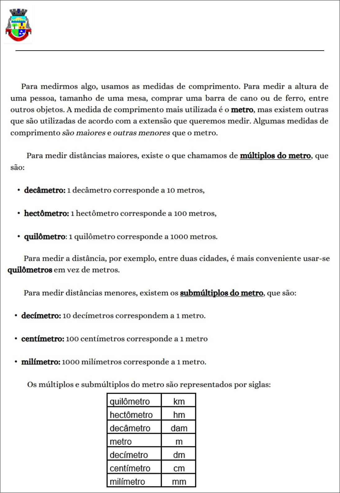 ESCOLA MUNICIPAL JOÃO EVANGELISTA DOS SANTOS ALUNO (A): _____________________________________________________________ PROFESSORA: LUIZA REDUZINO DATA: ___/___/_____ TURMA: 400 APOSTILA DE REVISÃO: MEDIDAS DE COMPRIMENTO/ MASSA /CAPACIDADE MEDIDAS DE COMPRIMENTO b) Quantas vezes Marcos percorreu o Comprimento da pscina? ATIVIDADES 1. Veja que um litro de água deu para encher quatro copos. Observe: Qual das opções representa a medida da capacidade de cada copo? a) 200 ml d) 300 ml b) 250 ml e) 350 ml 2. Seu Juvenal vende água na beira da praia, veja a quantidade de garrafinhas que vendeu em 1 hora de trabalho num dia de forte calor: Sabendo que a capacidade de cada garrafinha é de 500 ml, quantos litros de água ele vendeu? a) 10 litros. b) 20 litros. c) 30 litros. d) 40 litros. 3. Ao aprender sobre o consumo consciente da água, Fabinho observou que havia uma torneira pingando em sua casa e resolveu medir o desperdício. Observe a quantidade de água que ele armazenou durante uma hora: Após seis horas de desperdício, a quantidade de água armazenada foi de: a) 1,5 litros. b) 2,5 litros. c) 15 litros. d) 25 litros. 4. A produção diária de uma fábrica de refrigerante é de 4 mil litros da bebida. A metade é armazenada em garrafas de 2 litros e o restante em garrafas de 1 litro. Quantas garrafas serão utilizadas para armazenar a bebida produzida pela fábrica? a) 1000 garrafas. b) 2000 garrafas. c) 3000 garrafas. d) 4000 garrafas. 5. O responsável por recolher os materiais reutilizados de uma fábrica verificou que foram utilizados 200 copinhos de café de 50 ml. Quantos litros de café foram consumidos? a) 10 litros b) 20 litros c) 50 litros d) 200 litros image5.png image6.png image7.png image8.png image9.png image10.png image11.png image12.png image13.png image14.png image15.png image16.png image1.png image2.png image3.png image4.png