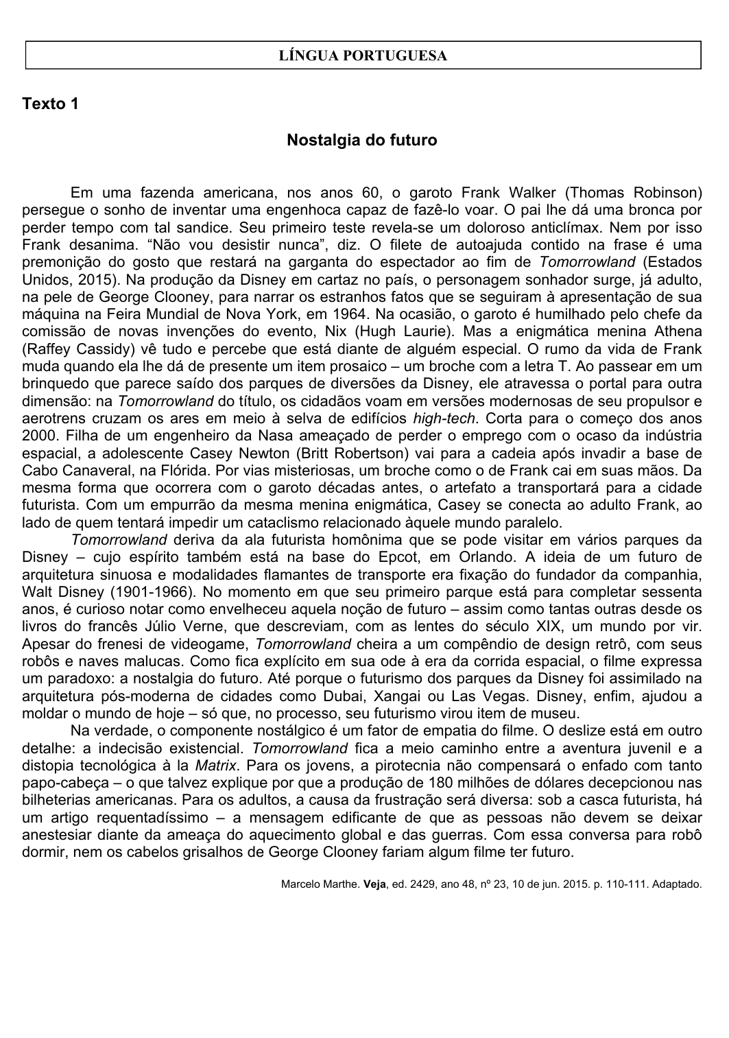 SSA – 2ª Fase 1º Dia Página 3 Texto 1 Nostalgia do futuro Em uma fazenda americana, nos anos 60, o garoto Frank Walker (Thomas Robinson) persegue o sonho de inventar uma engenhoca capaz de fazê-lo voar. O pai lhe dá uma bronca por perder tempo com tal sandice. Seu primeiro teste revela-se um doloroso anticlímax. Nem por isso Frank desanima. “Não vou desistir nunca”, diz. O filete de autoajuda contido na frase é uma premonição do gosto que restará na garganta do espectador ao fim de Tomorrowland (Estados Unidos, 2015). Na produção da Disney em cartaz no país, o personagem sonhador surge, já adulto, na pele de George Clooney, para narrar os estranhos fatos que se seguiram à apresentação de sua máquina na Feira Mundial de Nova York, em 1964. Na ocasião, o garoto é humilhado pelo chefe da comissão de novas invenções do evento, Nix (Hugh Laurie). Mas a enigmática menina Athena (Raffey Cassidy) vê tudo e percebe que está diante de alguém especial. O rumo da vida de Frank muda quando ela lhe dá de presente um item prosaico – um broche com a letra T. Ao passear em um brinquedo que parece saído dos parques de diversões da Disney, ele atravessa o portal para outra dimensão: na Tomorrowland do título, os cidadãos voam em versões modernosas de seu propulsor e aerotrens cruzam os ares em meio à selva de edifícios high-tech. Corta para o começo dos anos 2000. Filha de um engenheiro da Nasa ameaçado de perder o emprego com o ocaso da indústria espacial, a adolescente Casey Newton (Britt Robertson) vai para a cadeia após invadir a base de Cabo Canaveral, na Flórida. Por vias misteriosas, um broche como o de Frank cai em suas mãos. Da mesma forma que ocorrera com o garoto décadas antes, o artefato a transportará para a cidade futurista. Com um empurrão da mesma menina enigmática, Casey se conecta ao adulto Frank, ao lado de quem tentará impedir um cataclismo relacionado àquele mundo paralelo. Tomorrowland deriva da ala futurista homônima que se pode visitar em vários parques da Disney – cujo espírito também está na base do Epcot, em Orlando. A ideia de um futuro de arquitetura sinuosa e modalidades flamantes de transporte era fixação do fundador da companhia, Walt Disney (1901-1966). No momento em que seu primeiro parque está para completar sessenta anos, é curioso notar como envelheceu aquela noção de futuro – assim como tantas outras desde os livros do francês Júlio Verne, que descreviam, com as lentes do século XIX, um mundo por vir. Apesar do frenesi de videogame, Tomorrowland cheira a um compêndio de design retrô, com seus robôs e naves malucas. Como fica explícito em sua ode à era da corrida espacial, o filme expressa um paradoxo: a nostalgia do futuro. Até porque o futurismo dos parques da Disney foi assimilado na arquitetura pós-moderna de cidades como Dubai, Xangai ou Las Vegas. Disney, enfim, ajudou a moldar o mundo de hoje – só que, no processo, seu futurismo virou item de museu. Na verdade, o componente nostálgico é um fator de empatia do filme. O deslize está em outro detalhe: a indecisão existencial. Tomorrowland fica a meio caminho entre a aventura juvenil e a distopia tecnológica à la Matrix. Para os jovens, a pirotecnia não compensará o enfado com tanto papo-cabeça – o que talvez explique por que a produção de 180 milhões de dólares decepcionou nas bilheterias americanas. Para os adultos, a causa da frustração será diversa: sob a casca futurista, há um artigo requentadíssimo – a mensagem edificante de que as pessoas não devem se deixar anestesiar diante da ameaça do aquecimento global e das guerras. Com essa conversa para robô dormir, nem os cabelos grisalhos de George Clooney fariam algum filme ter futuro. Marcelo Marthe. Veja, ed. 2429, ano 48, nº 23, 10 de jun. 2015. p. 110-111. Adaptado. LÍNGUA PORTUGUESA SSA – 2ª Fase 1º Dia Página 4 1. Com base nos elementos textuais e discursivos do Texto 1, é CORRETO afirmar que o seu propósito comunicativo é, fundamentalmente: a) apresentar um resumo da história que compõe o enredo do filme Tomorrowland, para que o leitor tome conhecimento do tema abordado. b) divulgar o filme Tomorrowland, a fim de atrair aos cinemas um grande contingente de espectadores de um perfil específico. c) emitir, para um público especializado, uma opinião técnica sobre Tomorrowland, capaz de influenciar a produção cinematográfica. d) fazer a análise crítica de um objeto cultural (um filme), de modo a destacar suas características narrativas e qualificá-lo técnica e esteticamente. e) trazer informações para o público leitor da revista acerca da história dos parques da Disney e do seu fundador, e também anunciar o lançamento do filme Tomorrowland. 2. O Texto 1, como outros gêneros, se estrutura em mais de um tipo textual, um deles, o tipo narrativo. O enredo de Tomorrowland é narrado sob o ponto de vista de quem assistiu ao filme (não de um de seus personagens). A voz do narrador aparece relatando a história do filme na sequência: a) “Em uma fazenda americana, nos anos 60, o garoto Frank Walker (Thomas Robinson) persegue o sonho de inventar uma engenhoca capaz de fazê-lo voar. O pai lhe dá uma bronca por perder tempo com tal sandice.” (1º parágrafo). b) “Tomorrowland deriva da ala futurista homônima que se pode visitar em vários parques da Disney – cujo espírito também está na base do Epcot, em Orlando. (2º parágrafo). c) “Apesar do frenesi de videogame, Tomorrowland cheira a um compêndio de design retrô, com seus robôs e naves malucas. Como fica explícito em sua ode à era da corrida espacial, o filme expressa um paradoxo: a nostalgia do futuro.” (2º parágrafo). d) “Na verdade, o componente nostálgico é um fator de empatia do filme. O deslize está em outro detalhe: a indecisão existencial. Tomorrowland fica a meio caminho entre a aventura juvenil e a distopia tecnológica à la Matrix.” (3