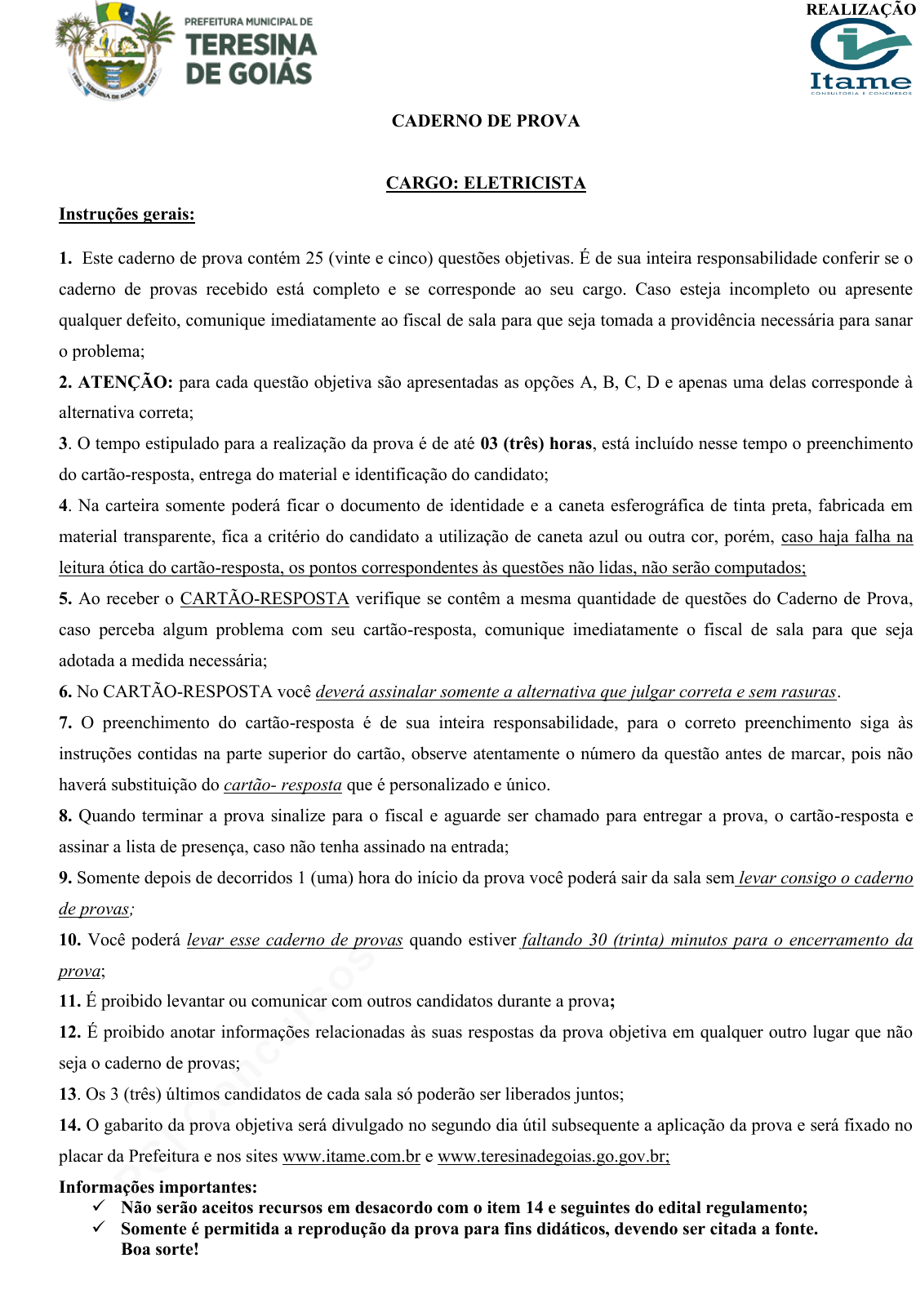 pcimarkpci MjgwNDo0YmI0OjAxMDM6YWNhZToyMGFiOjc0ZjA6MTNjYToxOWI2:U2F0LCAxNiBOb3YgMjAyNCAxODowNTowOCAtMDMwMA== www.pciconcursos.com.br REALIZAÇÃO CADERNO DE PROVA CARGO: ELETRICISTA Instruções gerais: 1. Este caderno de prova contém 25 (vinte e cinco) questões objetivas. É de sua inteira responsabilidade conferir se o caderno de provas recebido está completo e se corresponde ao seu cargo. Caso esteja incompleto ou apresente qualquer defeito, comunique imediatamente ao fiscal de sala para que seja tomada a providência necessária para sanar o problema; 2. ATENÇÃO: para cada questão objetiva são apresentadas as opções A, B, C, D e apenas uma delas corresponde à alternativa correta; 3. O tempo estipulado para a realização da prova é de até 03 (três) horas, está incluído nesse tempo o preenchimento do cartão-resposta, entrega do material e identificação do candidato; 4. Na carteira somente poderá ficar o documento de identidade e a caneta esferográfica de tinta preta, fabricada em material transparente, fica a critério do candidato a utilização de caneta azul ou outra cor, porém, caso haja falha na leitura ótica do cartão-resposta, os pontos correspondentes às questões não lidas, não serão computados; 5. Ao receber o CARTÃO-RESPOSTA verifique se contêm a mesma quantidade de questões do Caderno de Prova, caso perceba algum problema com seu cartão-resposta, comunique imediatamente o fiscal de sala para que seja adotada a medida necessária; 6. No CARTÃO-RESPOSTA você deverá assinalar somente a alternativa que julgar correta e sem rasuras. 7. O preenchimento do cartão-resposta é de sua inteira responsabilidade, para o correto preenchimento siga às instruções contidas na parte superior do cartão, observe atentamente o número da questão antes de marcar, pois não haverá substituição do cartão- resposta que é personalizado e único. 8. Quando terminar a prova sinalize para o fiscal e aguarde ser chamado para entregar a prova, o cartão-resposta e assinar a lista de presença, caso não tenha assinado na entrada; 9. Somente depois de decorridos 1 (uma) hora do início da prova você poderá sair da sala sem levar consigo o caderno de provas; 10. Você poderá levar esse caderno de provas quando estiver faltando 30 (trinta) minutos para o encerramento da prova; 11. É proibido levantar ou comunicar com outros candidatos durante a prova; 12. É proibido anotar informações relacionadas às suas respostas da prova objetiva em qualquer outro lugar que não seja o caderno de provas; 13. Os 3 (três) últimos candidatos de cada sala só poderão ser liberados juntos; 14. O gabarito da prova objetiva será divulgado no segundo dia útil subsequente a aplicação da prova e será fixado no placar da Prefeitura e nos sites www.itame.com.br e www.teresinadegoias.go.gov.br; Informações importantes: ✓ Não serão aceitos recursos em desacordo com o item 14 e seguintes do edital regulamento; ✓ Somente é permitida a reprodução da prova para fins didáticos, devendo ser citada a fonte. Boa sorte! pcimarkpci MjgwNDo0YmI0OjAxMDM6YWNhZToyMGFiOjc0ZjA6MTNjYToxOWI2:U2F0LCAxNiBOb3YgMjAyNCAxODowNTowOCAtMDMwMA== www.pciconcursos.com.brTeresina de Goiás - GO / Eletricista 1 Leia a lenda e responda os itens de 1 a 8. Lenda da Vitória Régia Conta a lenda que uma bela índia chamada Naiá apaixonou-se por Jaci (a Lua), que brilhava no céu a iluminar as noites. Nos contos dos pajés e caciques, Jaci de quando em quando descia à Terra para buscar alguma virgem e transformá-la em estrela do céu para lhe fazer companhia. Naiá, ouvindo aquilo, quis também virar estrela para brilhar ao lado de Jaci. Durante o dia, bravos guerreiros tentavam cortejar Naiá, mas era tudo em vão, pois ela recusava todos os convites de casamento. E mal podia esperar a noite chegar, quando saía para admirar Jaci, que parecia ignorar a pobre Naiá. Mas ela esperava sua subida e sua descida no horizonte e, já quase de manhãzinha, saía correndo em sentido oposto ao Sol para tentar alcançar a Lua. Corria e corria até cair de cansaço no meio da mata. Noite após noite, a tentativa de Naiá se repetia. Até que ela adoeceu. De tanto ser ignorada por Jaci, a moça começou a definhar. Mesmo doente, não havia uma noite que não fugisse para ir em busca da Lua. Numa dessas vezes, a índia caiu cansada à beira de um igarapé. Quando acordou, teve um susto e quase não acreditou: o reflexo da Lua nas águas claras do igarapé a fizeram exultar de felicidade! Finalmente ela estava ali, bem próxima de suas mãos. Naiá não teve dúvidas: mergulhou nas águas profundas e acabou se afogando. Jaci, vendo o sacrifício da índia, resolveu transformá-la numa estrela incomum. O destino de Naiá não estava no céu, mas nas águas, a refletir o clarão do luar. Naiá virou a Vitória Régia, a grande flor amazônica das águas calmas, a estrela das águas, tão linda quanto as estrelas e com um perfume inconfundível. E que só abre suas pétalas ao luar. 1. Qual foi o destino de Naiá após se sacrificar por seu amor a Jaci? (A) Ela se transformou em uma estrela do céu. (B) Ela se casou com um bravo guerreiro. (C) Ela virou uma Vitória Régia, uma grande flor amazônica. (D) Ela foi ignorada e continuou vivendo normalmente na tribo. 2. De acordo com o texto, qual substantivo é usado para se referir à Lua? (A) Naiá. (B) Índia. (C) Noite. (D) Jaci. 3. No trecho “Mesmo doente, não havia uma noite que não fugisse para ir em busca da Lua”, qual termo é um advérbio que indica negação? (A) Lua. (B) Não. (C) Doente. (D) Mesmo. 4. De acordo com as regras de acentuação gráfica das palavras, marque a alternativa em que a palavra destacada é uma oxítona. (A) “Naiá não teve dúvidas” (B) “Naiá virou a Vitória Régia”. (C) “Finalmente ela estava ali, bem próxima de suas mãos”. (D) “Conta a lenda que uma bela índia chamada Naiá apaixonou-se por Jaci”. 5.