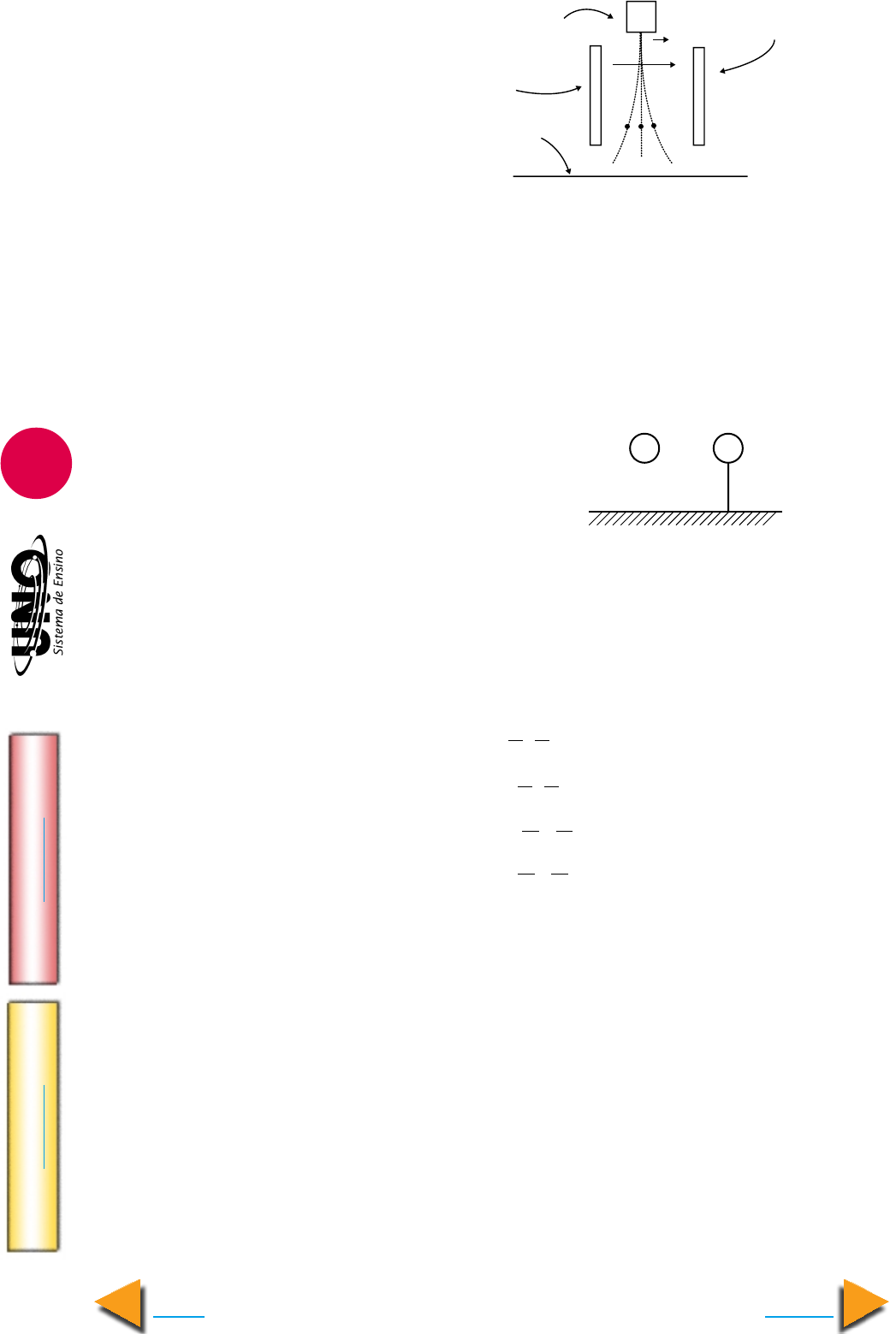 FÍSICA - Eletrostática IM PR IM IR Voltar GA BA RI TO Avançar 3 8. UFRN Uma das aplicações tecnológicas modernas da eletrostática foi a invenção da impressora a jato de tinta. Esse tipo de im- pressora utiliza pequenas gotas de tinta, que podem ser eletricamente neutras ou eletriza- das positiva ou negativamente. Essas gotas são jogadas entre as placas defletoras da im- pressora, região onde existe um campo elé- trico uniforme E, atingindo, então, o papel para formar as letras. A figura a seguir mos- tra três gotas de tinta, que são lançadas para baixo, a partir do emissor. Após atravessar a região entre as placas, essas gotas vão impregnar o papel. (O campo elétrico uniforme está representado por apenas uma linha de força.) Pelos desvios sofridos, pode-se dizer que a gota 1, a 2 e a 3 estão, respectivamente, a) carregada negativamente, neutra e carregada positivamente. b) neutra, carregada positivamente e carregada negativamente. c) carregada positivamente, neutra e carregada negativamente. d) carregada positivamente, carregada negativamente e neutra. 9. Fuvest-SP Duas esferas metálicas A e B estão próximas uma da outra. A esfera A está ligada à Terra, cujo potencial é nulo, por um fio condutor. A esfera B está isolada e car- regada com carga +Q. Considere as seguintes afirmações: I. O potencial da esfera A é nulo II. A carga total da esfera A é nula III. A força elétrica total sobre a esfera A é nula. Está correto apenas o que se afirma em a) I b) I e II c) I e III d) II e III e) I, II e III 10. Unifor-CE Considere o sistema constituído por duas cargas elétricas, de mesmo sinal, Q e q, sendo r 1 a distância entre elas. Se aumentarmos essa distância para r 2 , a energia poten- cial do sistema a) aumentará, sendo a variação dada por k Q q ( 1 – 1 ) b) diminuirá, sendo sua variação dada por k Q q ( 1 – 1 ) c) aumentará, sendo sua variação dada por k Q q ( 1 – 1 ) d) diminuirá, sendo sua variação dada por k Q q ( 1 – 1 ) e) permanecerá constante. 11. Vunesp Três esferas metálicas idênticas, A, B, C, inicialmente isoladas, estão carregadas com cargas elétricas positivas de intensidade Q A = 6q, Q B = 4q, Q C = 2q, e uma quarta esfera D, idêntica às anteriores, encontra-se neutra. Encosta-se a esfera A na esfera D e a esfera B na esfera C, sem contato entre os dois grupos, mantendo-as unidas por alguns instantes e depois separando-as novamente. Em seguida, encosta-se a esfera A na esfera B e a esfera C na esfera D, também sem contato entre os dois grupos, mantendo-as unidas. Ao final do processo, as cargas elétricas totais do grupo formado pelas esferas A e B e do grupo formado pelas esferas C e D valem, respectivamente, a) 0q e 12q. b) 2q e 10q. c) 4q e 8q. d) 6q e 6q. e) 10q e 2q. EMISSORA DE GOTAS PLACA PLACA PAPEL 3 2 1 E r 2 r 1 r 2 r 1 r 2 2 r 1 2 r 2 2 r 1 2 AB +Q → FÍSICA - Eletrostática IM PR IM IR Voltar GA BA RI TO Avançar 4 12. Unifor-CE Uma carga elétrica q 1 = 2,0 µC exerce força, de módulo F, sobre outra carga q 2 = 20 µC. Pode-se concluir que a carga q 2 exerce sobre q 1 outra força, de módulo a) 0,10 F b) F c) 5 F d) 10 F e)100 F 13. UFSE Duas cargas puntiformes Q 1 e Q 2 se atraem, no vácuo, com uma força elétrica de intensidade 4,0 · 10-2 N, quando estão separadas por uma distância de 3,0 cm. Se Q 1 = 2,0 · 108 C, então Q 2 , em coulombs, vale: Dado: Constante eletrostática do vácuo = 9,0 · 109 S.I. a) 2,0 · 10–8, positiva. d) 2,0 · 10–7, negativa. b) 2,0 · 10–7, positiva. e) 2,0 · 10–8, negativa. c) 2,0 · 10–6, positiva. 14. UFPE Dois prótons de uma molécula de hidrogênio distam cerca de 1,0 x 10–10 m. Qual o módulo da força elétrica que um exerce sobre o outro, em unidades de 10–9 N? a) 13 b) 18 c) 20 d) 23 e) 28 15. Mackenzie-SP Um corpúsculo eletrizado com carga elétrica Q, fixo em um ponto do vácuo, cria a 50 cm dele um campo elétrico tal que, quando colocamos uma carga de prova de 2µC nesse ponto, ele fica sujeita a uma força elétrica de repulsão de intensidade 576 · 10–3 N. O valor de Q é: Dado: k 0 = 9 · 109 Nm2/C2 a) 4µC b) 6µC c) 8µC d) 10µC e) 12µC 16. UESC-BA O gráfico representa o comportamento da in- tensidade da força elétrica, F, em função da dis- tância, d, entre duas cargas pontuais idênticas. Considerando-se a constante eletrostática do meio igual a 9 · 109Nm2C–2 e com base na in- formação, é correto afirmar: 01) A força elétrica de interação entre as car- gas tem natureza atrativa. 02) O módulo da força elétrica de interação entre as cargas é 3,5 · 103 N para d = 2 m. 03) O módulo de cada carga elétrica é igual a 1 · 10–3 C. 04) O módulo do campo elétrico, no ponto médio da reta que une as cargas, é igual a 9 · 109 N/C para d = 3 m. 05) O potencial elétrico, no ponto médio da reta que une as cargas, é nulo para d = 1 m. 17. U. F. São Carlos-SP Na figura está representada uma linha de força de um campo elétrico, um ponto P e os vetores A, B, C, D e E. Se uma partícula de carga elétrica positiva, suficiente- mente pequena para não alterar a configuração desse campo elétrico, for colocada nesse ponto P, ela sofre a ação de uma força F, melhor representada pelo vetor: a) A. b) B. c) C. d) D. e) E. F (103 N) 9 1 0 1 2 3 d(m) A B E D C P → → → → → → → → → → → FÍSICA - Eletrostática IM PR IM IR Voltar GA BA RI TO Avançar 5 18. Unicap-PE Nos vértices A e B do triângulo eqüilátero da figura, são colocadas as cargas Q A = 2 µC e Q B = –2 µC. O meio é o vácuo. C 2m 2m 1m A B DQA QB 1m d L α 1 ( ) O campo elétrico, no ponto C, é nulo, já que as cargas são de mesmo módulo e de sinais contrários. ( ) O potencial do ponto C, relativo ao infinito, é 18000 volts. ( ) O módulo da força entre as cargas é 9 x 10–3 N. ( ) Para estabelecer as configurações da figura, um agente externo realizou um trabalho positivo. ( ) No interior de um c