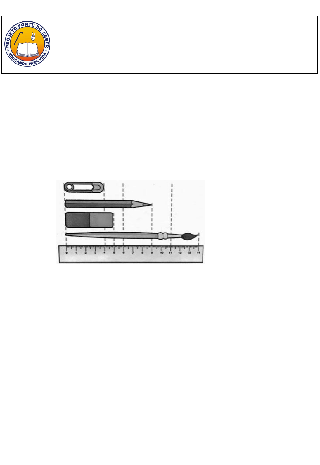 ESCOLA:_________________________________________________ DATA:____/____/____ PROFESSORA(O):_____________________ ALUNO (A):_____________________________________ SÉRIE: ________ Avaliação de Matemática 1-A medida de comprimento utilizada para determinar as distâncias das cidades: ______________________________________________ 2-Observe a figura abaixo e defina as medidas em centímetros a partir do valor da régua: a) Do alfinete: _____________________ b) Do lápis: _______________________ c) Da borracha: ___________________ d) Do pincel: ______________________ 3-Escolha a unidade de comprimento mais adequada (metro, centímetro ou milímetro) para cada uma das seguintes situações: a)Um carro possui cerca de 3 ________________. b)Um prédio de 30 andares possui, aproximadamente, 90 _______________ de altura. c)Uma borracha escolar tem cerca de 40_____________de comprimento. 4- Escreva o nome dos instrumentos usados para medir comprimento. 5- Sabendo que 1 metro corresponde a 100 centímetros, calcule quantos centímetros há em: a) 2 metros _____________________ b) 4 metros _____________________ c) 10 metros ____________________ 6- Escreva os símbolos das medidas de comprimento. a) Quilômetro______ b) Decâmetro______ c) Hectômetro_____ d) Metro______ e) Decímetro_____ f) Centímetro_____ g) Milímetro ______ 7-Maurício pratica ciclismo em um quarteirão. Sabendo que o quarteirão tem 530 metros de extensão e que Maurício deu 2 voltas completas, quantos metros ele percorreu?________________ 8- Resolva os problemas matemáticos. 9- Paulo precisa reconstruir um telhado de uma casa, pois as telhas já estão muito desgastadas. Nesse telhado, há 16 fileiras com 62 telhas em cada uma. Quantas telhas serão necessárias para refazer esse telhado? _______________________________________________ image4.jpeg image1.png image2.jpeg image3.jpeg