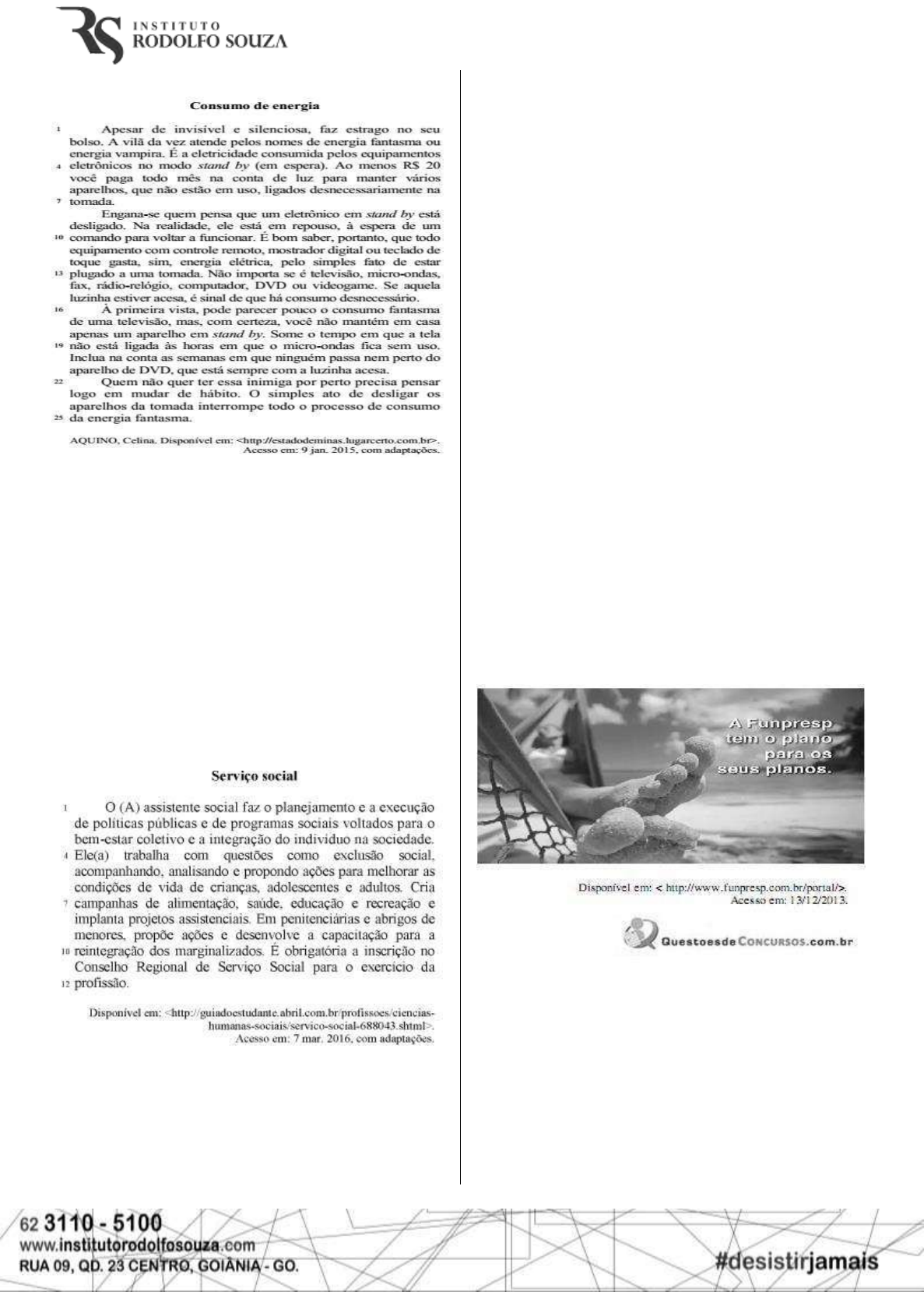 Questão 4 - De acordo com a norma-padrão e as questões gramaticais referentes ao período “Some o tempo em que a tela não está ligada às horas em que o micro-ondas fica sem uso.” (linhas 18 e 19), o emprego do sinal indicativo de crase: a) está inadequado. b) é facultativo. c) seria inviável caso o substantivo “horas” estivesse antecedido pelo pronome certas. d) também deveria ocorrer diante do substantivo “tela”. e) seria proibido caso o substantivo “horas” fosse antecedido pelo pronome aquelas. Questão 5 - Assinale a alternativa que apresenta os vocábulos que são acentuados graficamente pela mesma regra. a) “Metrô” , “Águas” e “Ceilândia”. b) “Guará” , “Indústria” e “Brasília”. c) “média”, “Águas” e “Ceilândia”. d) “é” , “até” e “Guará”. e) “Metrô” , “Guará” e “é”. Questão 6 - Texto para responder as perguntas 6,7 e 8. Caso julgasse necessário, o autor poderia, desde que respeitadas as regras acerca do emprego do sinal indicativo de crase, substituir o período “Cria campanhas de alimentação, saúde, educação e recreação e implanta projetos assistenciais.” (linhas de 6 a 8) pela seguinte redação: a) Dá vida à campanhas de alimentação, saúde, educação e recreação e implanta projetos de assistência à população marginalizada. b) Traz à realidade campanhas de alimentação, saúde, educação e recreação e implanta projetos de assistência àqueles indivíduos em situação de risco. c) Cria campanhas de alimentação, saúde, educação e recreação direcionadas às crianças carentes e implanta projetos assistenciais dirigidos à certa parcela da população de adolescentes e adultos. d) Volta-se à criação de campanhas de alimentação, saúde, educação e recreação e implanta projetos assistenciais destinados à uma população necessitada. e) Dá origem à cinco campanhas de alimentação, saúde, educação e recreação e implanta à sua maneira projetos assistenciais. Questão 7- Considerando o que prescreve a norma-padrão a respeito de regência verbal, o período “Em penitenciárias e abrigos de menores, propõe ações e desenvolve a capacitação para a reintegração dos marginalizados.” (linhas de 8 a 10) poderia ser substituído pela redação a seguir: a) Em penitenciárias e abrigos de menores que atua, propõe ações e desenvolve a capacitação para a reintegração dos marginalizados. b) Em penitenciárias e abrigos de menores aonde trabalha, propõe ações e desenvolve a capacitação para a reintegração dos marginalizados. c) Em penitenciárias e abrigos de menores que se dirige, propõe ações e desenvolve a capacitação para a reintegração dos marginalizados. d) Em penitenciárias e abrigos de menores que assiste, propõe ações e desenvolve a capacitação para a reintegração dos marginalizados. e) Em penitenciárias e abrigos de menores que vai, propõe ações e desenvolve a capacitação para a reintegração dos marginalizados. Questão 8- Conforme as informações do texto e o modo como estão organizadas, assinale a alternativa correta. a) O autor defende uma opinião quanto ao trabalho que deve ser desenvolvido pelo(a) assistente social, por isso faz uso predominantemente da dissertação. b) As ações do(a) assistente social estão voltadas, principalmente, à população que vive nas ruas. c) O (A) assistente social pode e deve atuar como profissional de saúde e de educação. d) A sequência em que são apresentadas as ideias revela que a narração sobrepõe-se à dissertação e à descrição. e) O propósito principal do autor é informar objetivamente o leitor a respeito de uma profissão. Questão 9 De acordo com a norma padrão da língua portuguesa, assinale a alternativa correta referente ao período “A Funpresp tem o plano para os seus planos". a) O uso do acento circunflexo em “tem" é facultativo. b) O vocábulo “tem" deveria ser acentuado obrigatoriamente. c) Não é possível fazer a divisão silábica do vocábulo “seus". d) Os vocábulos “plano" e “para" possuem número de sílabas diferente. e) O vocábulo “tem" poderia ser substituído por possue. Questão 10 - TEXTO - Ressentimento e Covardia Tenho comentado aqui na Folha em diversas crônicas, os usos da internet, que se ressente ainda da falta de uma legislação específica que coíba não somente os usos mas os abusos deste importante e