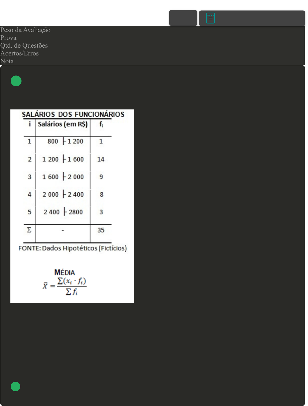 Prova Impressa GABARITO | Avaliação II - Individual (Cod.:990763) Peso da Avaliação 2,00 Prova 92320722 Qtd. de Questões 10 Acertos/Erros 10/0 Nota 10,00 Determine a média do seguinte agrupamento em classes, referente aos salários dos funcionários da Empresa FORTALEZA Ltda.: Assinale a alternativa CORRETA: A Média = R$ 1.813,21. B Média = R$ 1.974,24. C Média = R$ 2.015,68. D Média = R$ 1.985,38. E Média = R$ 1.777,14. VOLTAR A+ Alterar modo de visualização 1 17/11/2024, 14:51 Avaliação II - Individual about:blank 1/6 A média aritmética, a mediana e a moda são as medidas de tendência central mais comuns e importantes. Sobre essas três tendências centrais, avalie as asserções a seguir e a relação proposta entre elas: I- A escolha da medida de tendência central para a pesquisa que está sendo realizada depende, em princípio, dos objetivos da pesquisa. PORQUE II- Enquanto a média é influenciada pelos valores extremos, a moda e a mediana não são afetadas por tais valores. A respeito dessas asserções, assinale a opção correta: A As asserções I e II são verdadeiras, e a II é uma justificativa correta da I. B A asserção I é uma proposição falsa e a II é uma proposição verdadeira. C As asserções I e II são verdadeiras, mas a II não é uma justificativa correta da I. D A asserção I é uma proposição verdadeira e a II é uma proposição falsa. E As asserções I e II são falsas. A tabela a seguir representa o salário dos 50 funcionários da empresa XYZ Ltda. Com base nesses dados, podemos afirmar que a média salarial dos funcionários dessa empresa, em reais, é igual a: A A média salarial é R$ 1.536,00. B A média salarial é R$ 1.824,00. C A média salarial é R$ 1.692,00. D A média salarial é R$ 1.812,00. 2 3 17/11/2024, 14:51 Avaliação II - Individual about:blank 2/6 E A média salarial é R$ 1.754,00. Com base nos dados brutos a seguir, organize um ROL e determine o valor da mediana do valores : 16 - 22 - 17 - 13 - 31 - 12 - 14 - 9 - 30 - 4. Assinale a alternativa CORRETA que representa a mediana: A A mediana é 17. B A mediana é 19. C A mediana é 13. D A mediana é 15. E A mediana é 16. Foram registradas as idades dos 20 alunos de uma turma da disciplina de Estatística de determinada Instituição de Ensino Superior. As idades (em anos) estão na sequência a seguir: 26 32 36 38 30 30 26 30 25 30 41 36 30 28 26 33 30 35 33 30. Qual é a moda das idades dos alunos dessa turma? A A moda das idades é 33 anos. B A moda das idades é 28 anos. C A moda das idades é 26 anos. D A moda das idades é 36 anos. E A moda das idades é 30 anos. A tabela a seguir apresenta as idades de um grupo de alunos de um Centro de Educação Infantil (CEI) em determinado ano: 4 5 6 17/11/2024, 14:51 Avaliação II - Individual about:blank 3/6 Analisando a tabela, classifique V para as sentenças verdadeiras e F para as falsas: ( ) 50% dos alunos têm mais de 2 anos de idade. ( ) A média das idades é de aproximadamente 2,7 anos. ( ) A moda dessa distribuição é de 2 anos. Assinale a alternativa que apresenta a sequência CORRETA: A V - V - V. B F - F - V. C F - V - F. D V - F - V. E V - V - F. Para separar uma distribuição, calculamos as separatrizes determinando grupos do tamanho que desejarmos, desde que juntos somem 100%, como 25% abaixo e 75% acima, por exemplo. Sobre as separatrizes, classifique V para as sentenças verdadeiras e F para as falsas: ( ) As separatrizes estão associadas às porcentagens dos dados da distribuição de frequência com intervalos de classe e servem para análises estatísticas. ( ) A separatriz C50 analisa 50% dos dados da distribuição de frequência com intervalos de classe e pode ser identificada como mediana também. ( ) A fórmula das separatrizes permite que se calcule qualquer porcentagem dos dados, bastando substituir k pelo valor dado em percentual. Assinale a alternativa que apresenta a sequência CORRETA: A V - F - V. B F - V - V. 7 17/11/2024, 14:51 Avaliação II - Individual about:blank 4/6 C V - V - F. D F - F - F. E V - V - V. Foram registradas as alturas, em metros, de 25 alunos de uma turma de Estatística. Os dados organizados são apresentados a seguir: 1,75 - 1,54 - 1,86 1,90 - 1,67 - 1,63 - 1,70 - 1,82 - 1,59 - 1,82 - 1,82 - 1,68 - 1,70 - 1,43 - 2,07 - 1,88 - 1,79 - 1,79 - 1,57 - 1,63 - 1,68 - 1,75 - 1,55 - 1,74 - 1,72. Qual é, aproximadamente, a altura média dos alunos dessa turma? A A altura média é aproximadamente 1,87 m. B A altura média é aproximadamente 1,91 m. C A altura média é aproximadamente 1,67 m. D A altura média é aproximadamente 1,72 m. E A altura média é aproximadamente 1,81 m. As medidas de tendência central expressam a posição da distribuição com relação ao eixo dos valores da situação estudada. Com relação à mediana, classifique V para as sentenças verdadeiras e F para as falsas: ( ) A mediana pode ser considerada uma separatriz, pois seria o mesmo que calcular C50, que nos daria 50% dos dados para analisar. ( ) Ao fazer uma análise de dados, a mediana pode ser utilizada no lugar da média, pois sempre apresentarão o mesmo resultado. ( ) Para o cálculo da mediana pela fórmula estudada, deve-se, considerar a frequência acumulada para encontrar e determinar a classe mediana. Assinale a alternativa que apresenta a sequência CORRETA: A V - V - V. B V - F - V. C F - F - V. D F - V - F. E V - V - F. 8 9 17/11/2024, 14:51 Avaliação II - Individual about:blank 5/6 Foi realizada uma enquete sobre o investimento semanal das famílias em lazer. Os resultados estão representados pela distribuição de frequências representada a seguir: O que podemos afirmar acerca do investimento médio em lazer pelas famílias pesquisadas? A É menor que R$ 50,00. B Está entre R$ 50,00 e R$ 75,00. C Está entre R$ 75,00 e R$ 90,00. D É superior a R$ 100,00. E É superior a R$ 200,00. 10 Imprimir 17/11/2024, 14:51 Avaliação II - Individual about:blank 6/6